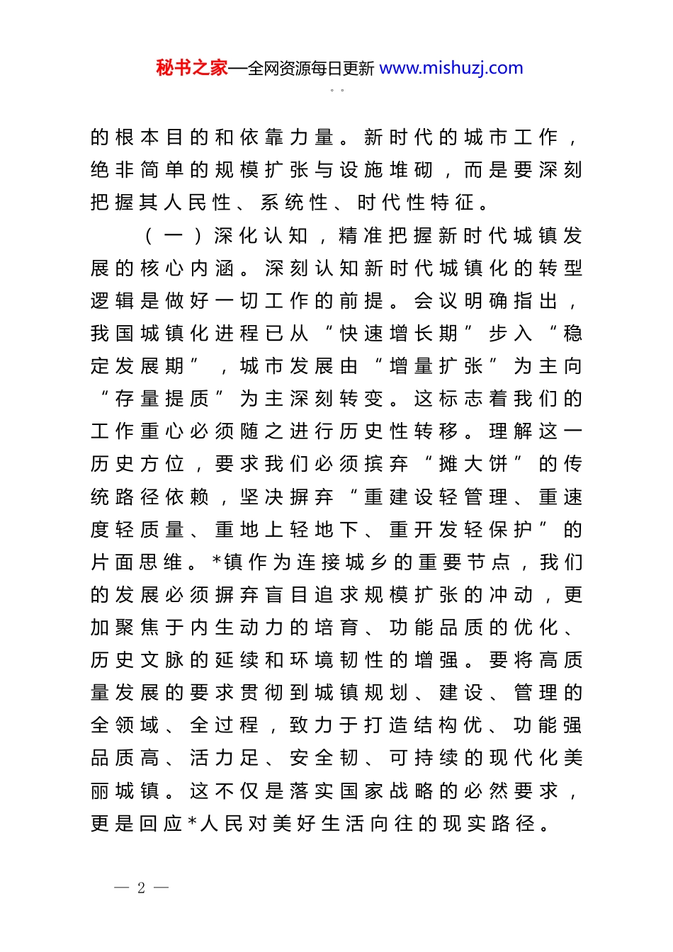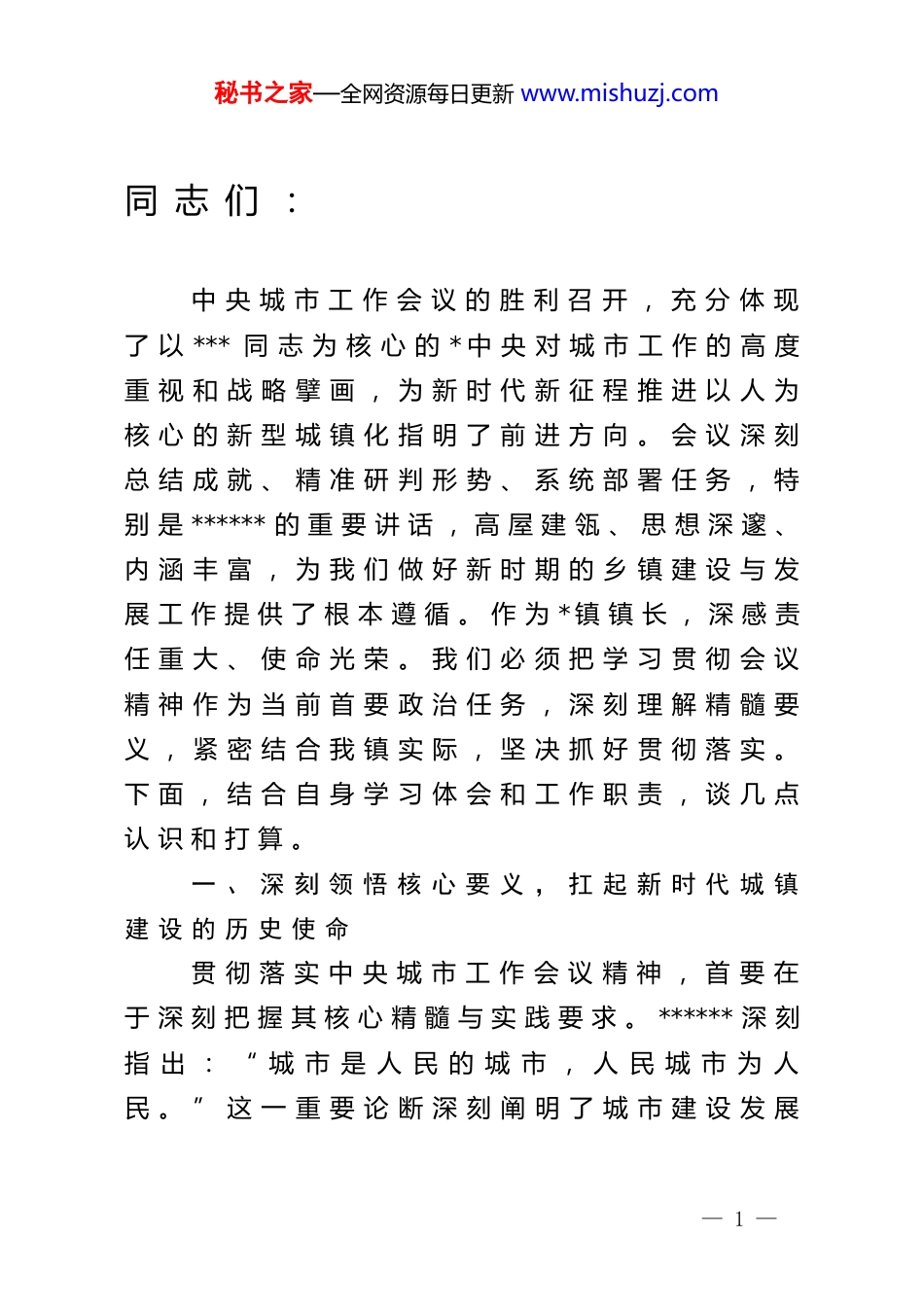 秘书之家—全网资源每日更新 www.mishuzj.com同 志 们 :中 央 城 市 工 作 会 议 的 胜 利 召 开 , 充 分 体 现了 以 *** 同 志 为 核 心 的 * 中 央 对 城 市 工 作 的 高 度重 视 和 战 略 擘 画 , 为 新 时 代 新 征 程 推 进 以 人 为核 心 的 新 型 城 镇 化 指 明 了 前 进 方 向 。 会 议 深 刻总 结 成 就 、 精 准 研 判 形 势 、 系 统 部 署 任 务 , 特别 是 ****** 的 重 要 讲 话 , 高 屋 建 瓴 、 思 想 深 邃 、内 涵 丰 富 , 为 我 们 做 好 新 时 期 的 乡 镇 建 设 与 发展 工 作 提 供 了 根 本 遵 循 。 作 为 * 镇 镇 长 , 深 感 责任 重 大 、 使 命 光 荣 。 我 们 必 须 把 学 习 贯 彻 会 议精 神 作 为 当 前 首 要 政 治 任 务 , 深 刻 理 解 精 髓 要义 , 紧 密 结 合 我 镇 实 际 , 坚 决 抓 好 贯 彻 落 实 。下 面 , 结 合 自 身 学 习 体 会 和 工 作 职 责 , 谈 几 点认 识 和 打 算 。一 、 深 刻 领 悟 核 心 要 义 , 扛 起 新 时 代 城 镇建 设 的 历 史 使 命贯 彻 落 实 中 央 城 市 工 作 会 议 精 神 , 首 要 在于 深 刻 把 握 其 核 心 精 髓 与 实 践 要 求 。 ****** 深 刻指 出 : “ 城 市 是 人 民 的 城 市 , 人 民 城 市 为 人民 。 ” 这 一 重 要 论 断 深 刻 阐 明 了 城 市 建 设 发 展— 1 —秘书之家—全网资源每日更新 www.mishuzj.com。。的 根 本 目 的 和 依 靠 力 量 。 新 时 代 的 城 市 工 作 ,绝 非 简 单 的 规 模 扩 张 与 设 施 堆 砌 , 而 是 要 深 刻把 握 其 人 民 性 、 系 统 性 、 时 代 性 特 征 。( 一 ) 深 化 认 知 , 精 准 把 握 新 时 代 城 镇 发展 的 核 心 内 涵 。 深 刻 认 知 新 时 代 城 镇 化 的 转 型逻 辑 是 做 好 一 切 工 作 的 前 提 。 会 议 明 确 指 出 ,我 国 城 镇 化 进 程 已 从 “ 快 速 增 长 期 ” 步 入 “ 稳定 发 展 期 ” , 城 市 发 展 由 “ 增 量 扩 张 ” 为 主 向“ 存 量 提 质 ” 为 主 深 刻 转 变 。 这 标 志 着 我 们 的工 作 重 心 必 须 随 之 进 行 历 史 性 转 移 。 理 解 这 一历 史 方 位 , 要 求 我 们 必 须 摈 弃 “ 摊 大 饼 ” 的 传统 路 径 依 赖 , 坚 决 摒 弃 “ 重 建 设 轻 管 理 、 重 速度 轻 质 量 、 重 地 上 轻 地 下 、 重 开 发 轻 保 护 ” 的片 面 思 维 。 * 镇 作 为 连 接 城 乡 的 重 要 节 点 , 我 们的 发 展 必 须 摒 弃 盲 目 追 求 规 模 扩 张 的 冲 动 , 更加 聚 焦 于 内 生 动 力 的 培 育 、 功 能 品 质 的 优 化 、历 史 文 脉 的 延 续 和 环 境 韧 性 的 增 强 。 要 将 高 质量 发 展 的 要 求 贯 彻 到 城 镇 规 划 、 建 设 、 管 理 的全 领 域 、 全 过 程 , 致 力 于 打 造 结 构 优 、 功 能 强品 质 高 、 活 力 足 、 安 全 韧 、 可 持 续 的 现 代 化 美丽 城 镇 。 这 不 仅 是 落 实 国 家 战 略 的 必 然 要 求 ,更 是 回 应 * 人 民 对 美 好 生 活 向 往 的 现 实 路 径 。— 2 —秘书之家—全网资源每日更新 www.mishuzj.com( 二 ) 把 握 精 髓 , 系 统 领 会 “ 人 民 城 市 ”理 念 的 价 值 坐 标 。 坚 持 以 人 ...