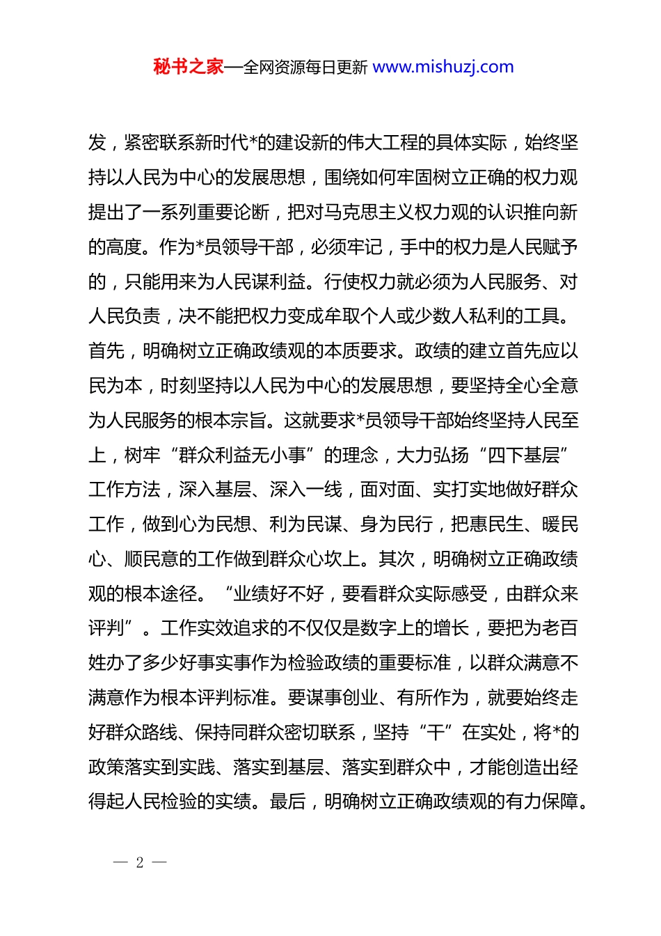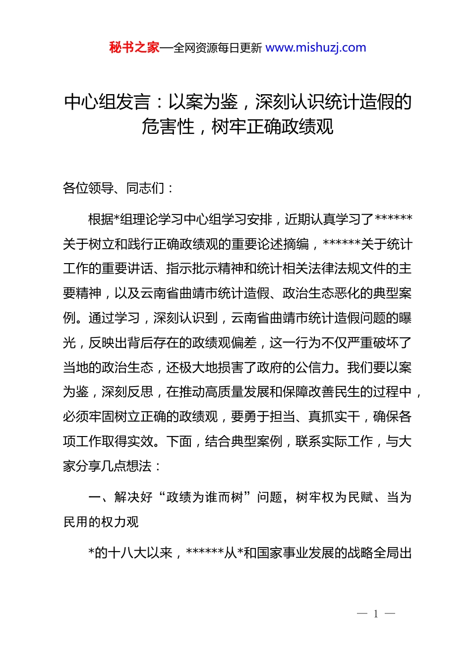 秘书之家—全网资源每日更新 www.mishuzj.com中心组发言:以案为鉴,深刻认识统计造假的危害性,树牢正确政绩观各位领导、同志们:根据*组理论学习中心组学习安排,近期认真学习了******关于树立和践行正确政绩观的重要论述摘编,******关于统计工作的重要讲话、指示批示精神和统计相关法律法规文件的主要精神,以及云南省曲靖市统计造假、政治生态恶化的典型案例。通过学习,深刻认识到,云南省曲靖市统计造假问题的曝光,反映出背后存在的政绩观偏差,这一行为不仅严重破坏了当地的政治生态,还极大地损害了政府的公信力。我们要以案为鉴,深刻反思,在推动高质量发展和保障改善民生的过程中,必须牢固树立正确的政绩观,要勇于担当、真抓实干,确保各项工作取得实效。下面,结合典型案例,联系实际工作,与大家分享几点想法:一、解决好“政绩为谁而树”问题,树牢权为民赋、当为民用的权力观*的十八大以来,******从*和国家事业发展的战略全局出— 1 —秘书之家—全网资源每日更新 www.mishuzj.com发,紧密联系新时代*的建设新的伟大工程的具体实际,始终坚持以人民为中心的发展思想,围绕如何牢固树立正确的权力观提出了一系列重要论断,把对马克思主义权力观的认识推向新的高度。作为*员领导干部,必须牢记,手中的权力是人民赋予的,只能用来为人民谋利益。行使权力就必须为人民服务、对人民负责,决不能把权力变成牟取个人或少数人私利的工具。首先,明确树立正确政绩观的本质要求。政绩的建立首先应以民为本,时刻坚持以人民为中心的发展思想,要坚持全心全意为人民服务的根本宗旨。这就要求*员领导干部始终坚持人民至上,树牢“群众利益无小事”的理念,大力弘扬“四下基层”工作方法,深入基层、深入一线,面对面、实打实地做好群众工作,做到心为民想、利为民谋、身为民行,把惠民生、暖民心、顺民意的工作做到群众心坎上。其次,明确树立正确政绩观的根本途径。“业绩好不好,要看群众实际感受,由群众来评判”。工作实效追求的不仅仅是数字上的增长,要把为老百姓办了多少好事实事作为检验政绩的重要标准,以群众满意不满意作为根本评判标准。要谋事创业、有所作为,就要始终走好群众路线、保持同群众密切联系,坚持“干”在实处,将*的政策落实到实践、落实到基层、落实到群众中,才能创造出经得起人民检验的实绩。最后,明确树立正确政绩观的有力保障。— 2 —秘书之家—全网资源每日更新 www.mishuzj.com政贵有恒,治须有常。要防止政绩观出现偏差,就要用好“监督”这把利器,拓宽监督渠道、聚焦关键少数、瞄准焦点问题,在“关键人”和“关键事”上下功夫。做实做细年轻干部日常监督,定期加强政绩观教育引导,筑牢思想防线,用好群众的“千里眼”“顺风耳”,抓早抓小,帮年轻干部扣好“第一粒扣子”。注重在重要任务、重点工作中监督干部是否勇担当、肯作为,引导*员干部真正做到权为民所用、树立正确政绩观,为实现新时代的美好蓝图跑好“接力棒”,当好“栽树人”。二、解决好“树什么样的政绩”问题,树牢为民造福、为*尽责的政绩观为官之道,首在政绩观。政绩观是为政之德、从政之道、施政之要。干事创业,必先树牢正确政绩观。政绩为谁而树、树什么样的政绩、靠什么树政绩,不仅影响到领导干部自身健康成长,更关系到*和国家事业兴衰。作为*员领导干部,要厚植为民情怀,锤炼坚强*性,树牢正确的政绩观,把正从政、谋事、创业的方向,扑下身子察实情、谋实招,以强化理论学习指导发展实践,以深化调查研究推动解决发展难题,以真抓实干引领高质量发展,努力推动中国式现代化建设取得新进展新突破。一是要解决好“为公”与“为私”的问题。想问题、作— 3 —秘书之家—全网资源每日更新 www.mishuzj.com决策、办事情,都要用“透视镜”照照灵魂深处,看看是否真正站稳了人民立场,是否有私心作怪、野心作祟。人民是阅卷人,*员干部是一心“为个人升迁镀金”还是真心为“百姓谋福祉”,群众心中有杆秤。真正的政绩不一定在光鲜的报表数字和总结里,而一定在群众的笑容和口碑中。二是要解决好“显绩”与“潜绩”的问题。既种“速生杨”,重视“见...