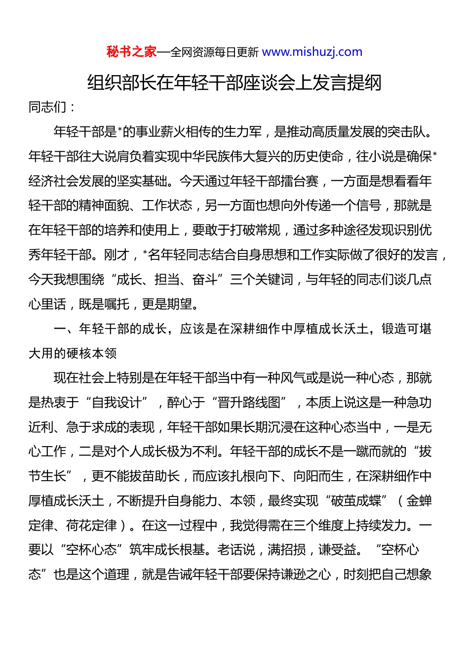 秘书之家—全网资源每日更新 www.mishuzj.com组织部长在年轻干部座谈会上发言提纲同志们:年轻干部是*的事业薪火相传的生力军,是推动高质量发展的突击队。年轻干部往大说肩负着实现中华民族伟大复兴的历史使命,往小说是确保*经济社会发展的坚实基础。今天通过年轻干部擂台赛,一方面是想看看年轻干部的精神面貌、工作状态,另一方面也想向外传递一个信号,那就是在年轻干部的培养和使用上,要敢于打破常规,通过多种途径发现识别优秀年轻干部。刚才,*名年轻同志结合自身思想和工作实际做了很好的发言,今天我想围绕“成长、担当、奋斗”三个关键词,与年轻的同志们谈几点心里话,既是嘱托,更是期望。一、年轻干部的成长,应该是在深耕细作中厚植成长沃土,锻造可堪大用的硬核本领现在社会上特别是在年轻干部当中有一种风气或是说一种心态,那就是热衷于“自我设计”,醉心于“晋升路线图”,本质上说这是一种急功近利、急于求成的表现,年轻干部如果长期沉浸在这种心态当中,一是无心工作,二是对个人成长极为不利。年轻干部的成长不是一蹴而就的“拔节生长”,更不能拔苗助长,而应该扎根向下、向阳而生,在深耕细作中厚植成长沃土,不断提升自身能力、本领,最终实现“破茧成蝶”(金蝉定律、荷花定律)。在这一过程中,我觉得需在三个维度上持续发力。一要以“空杯心态”筑牢成长根基。老话说,满招损,谦受益。“空杯心态”也是这个道理,就是告诫年轻干部要保持谦逊之心,时刻把自己想象秘书之家—全网资源每日更新 www.mishuzj.com成一个“空着的杯子”,还有很多需要学习提高的方面,从而保持“少年易老学难成,一寸光阴不可轻”的勤学之心,坚持长期学习、终身学习,不断更新知识储备,提升业务水平,为自身成长进步奠定扎实根基。有些年轻同志自命清高,认为其他人都不如自己,这是非常危险的,也是对个人成长非常不利的。千万不要因为自己学历高、思维活而陷入“学历自负”的误区,要知道学历固然重要,但学历不等于能力,也不等于水平,希望同志们都别成为“一瓶不满半瓶晃荡”之人。二要以“系统思维”拓宽成长视野。我曾经说过多次,年轻干部,就是要培养成“坐下来能写、站起来能说、走出去能干”综合性高素质人才。要实现这一目标,一方面是靠组织培养,为年轻干部提供更多锻炼的机会和平台;另一方面,更重要的是靠年轻干部自身,要有“系统思维”和开阔的眼界。拿*工作来举例,*工作是一盘“大棋局”,我们每一名同志可能只负责其中的一项,甚至是一项中某一方面的工作。但年轻干部决不能局限于此,要有全局视角和系统思维,工作中要积极主动了解、参与全部的工作,拓宽自身成长视野,提升自身综合能力,千万不能讲什么分内分外。对年轻干部来讲,工作根本没有什么分内分外,都要看作是自己锻炼提升的机会。三要以“自我革命”突破成长瓶颈。我们常说,人生最大的敌人是自己,最大的困难是战胜自己。这句话是有一定道理的,因为成长过程中最大的敌人实际上是自己的内在障碍,包括恐惧、惰性、思维定式等等,这些内在因素很大程度上限制了自身的成长和发展。而要突破这些内在障碍,需要持续的自省、自律和行动力。只有这样才能突破瓶颈,实现自我成长。对于年轻干部来秘书之家—全网资源每日更新 www.mishuzj.com讲,我觉得最重要的是,就是要敢于跳出“舒适区”,主动申请到基层一线、信访维稳、征地拆迁等急难险重岗位历练,在摸爬滚打中练就“宽肩膀”“铁脊梁”。这一点,对于年轻干部来说是不容易做到的,很多同志进了*就不愿意再出去,事实证明这对于年轻干部的成长是不利的。二、年轻干部的担当,应该是在知重负重中扛起担当之责,淬炼迎难而上的铁肩道义“为官避事平生耻”,讲的就是领导干部必须有担当精神。对于年轻干部来说,更是如此。担当,应该是年轻干部最鲜明的底色。新时代新征程,越是任务艰巨,越需要我们以“功成不必在我,功成必定有我”的胸怀,在知重负重中扛起担当之责,主动作为、善作善成。一要在服务大局中找准担当坐标。无论在何种岗位,年轻干部都应把个人工作、岗位职责融入全区发展大局,都要站在全局高度思考“我能为*发展...