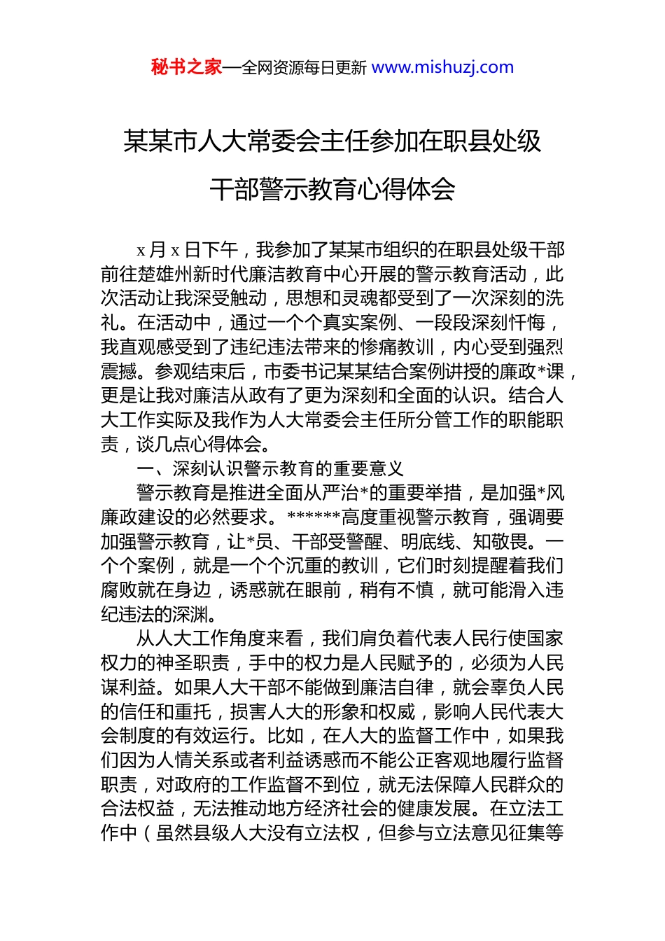 秘书之家—全网资源每日更新 www.mishuzj.com某某市人大常委会主任参加在职县处级干部警示教育心得体会x 月 x 日下午,我参加了某某市组织的在职县处级干部前往楚雄州新时代廉洁教育中心开展的警示教育活动,此次活动让我深受触动,思想和灵魂都受到了一次深刻的洗礼。在活动中,通过一个个真实案例、一段段深刻忏悔,我直观感受到了违纪违法带来的惨痛教训,内心受到强烈震撼。参观结束后,市委书记某某结合案例讲授的廉政*课,更是让我对廉洁从政有了更为深刻和全面的认识。结合人大工作实际及我作为人大常委会主任所分管工作的职能职责,谈几点心得体会。一、深刻认识警示教育的重要意义警示教育是推进全面从严治*的重要举措,是加强*风廉政建设的必然要求。******高度重视警示教育,强调要加强警示教育,让*员、干部受警醒、明底线、知敬畏。一个个案例,就是一个个沉重的教训,它们时刻提醒着我们腐败就在身边,诱惑就在眼前,稍有不慎,就可能滑入违纪违法的深渊。从人大工作角度来看,我们肩负着代表人民行使国家权力的神圣职责,手中的权力是人民赋予的,必须为人民谋利益。如果人大干部不能做到廉洁自律,就会辜负人民的信任和重托,损害人大的形象和权威,影响人民代表大会制度的有效运行。比如,在人大的监督工作中,如果我们因为人情关系或者利益诱惑而不能公正客观地履行监督职责,对政府的工作监督不到位,就无法保障人民群众的合法权益,无法推动地方经济社会的健康发展。在立法工作中(虽然县级人大没有立法权,但参与立法意见征集等秘书之家—全网资源每日更新 www.mishuzj.com相关工作),如果不能秉持公正廉洁的原则,就可能使法律法规不能真正反映人民的意愿和需求,影响法治社会的建设进程。此次警示教育中的典型案例,也让我认识到腐败问题的多样性和隐蔽性。有的领导干部理想信念动摇,背离初心使命;有的纪律规矩意识淡漠,肆意践踏底线;有的权力失控,滥用职权谋取私利;有的家风不正,“全家腐”导致“全家覆”。这些问题警示我们,必须时刻保持清醒头脑,增强廉洁意识,筑牢拒腐防变的思想防线。二、结合人大工作实际,筑牢廉洁防线(一)在政治忠诚上作表率人大是*领导下的政治机关,坚持*的全面领导是人大工作的最高政治原则。作为人大常委会主任,我要带头深刻领悟“两个确立”的决定性意义,增强“四个意识”、坚定“四个自信”、做到“两个维护”。在思想上,深入学习**************思想,特别是******关于坚持和完善人民代表大会制度的重要思想,不断提高政治理论水平,坚定政治信仰。在行动上,坚决贯彻落实市委的决策部署确保人大工作始终与市委同心同向、同频共振。在具体工作中,要坚持*对人大工作的全面领导,重大事项及时向市委请示报告。比如在组织人大代表开展调研视察等活动时,要围绕市委的中心工作来确定主题和内容使人大工作更好地服务于全市发展大局。在审议各项工作报告、作出决议决定时,要从政治高度去考量,确保符合*的路线方针政策和法律法规,体现人民群众的根本利益。(二)在权力使用上作表率人大的权力来自人民,必须依法依规、公正透明地行使权力。在日常工作中,要严格遵守宪法法律和人大工作的各项规章制度,按照法定程序履行职责。在行使重大事项决定权时,要充分发扬民主,广泛征求人大代表和人民群众的意见建议,确保决策的科学性和民主性。在行使监秘书之家—全网资源每日更新 www.mishuzj.com督权时,要敢于监督、善于监督,依法对“一府一委两院”的工作进行监督,督促其依法行政、依法监察、公正司法。同时,要加强对权力运行的制约和监督,自觉接受*内监督、人大代表监督、群众监督和舆论监督。定期向人大常委会组成人员和人大代表报告工作,听取他们的意见和建议,及时改进工作中的不足。建立健全内部监督机制,加强对人大机关干部的管理和监督,防止权力滥用和腐败现象的发生。(三)在选人用人上作表率人大机关的干部队伍建设关系到人大工作的质量和水平。在选人用人方面,要坚持正确的用人导向,严格按照干部选拔任用的规定和程序办事。选拔任用政治坚定、业务精通、作风优良、清正廉洁的干部,注重...