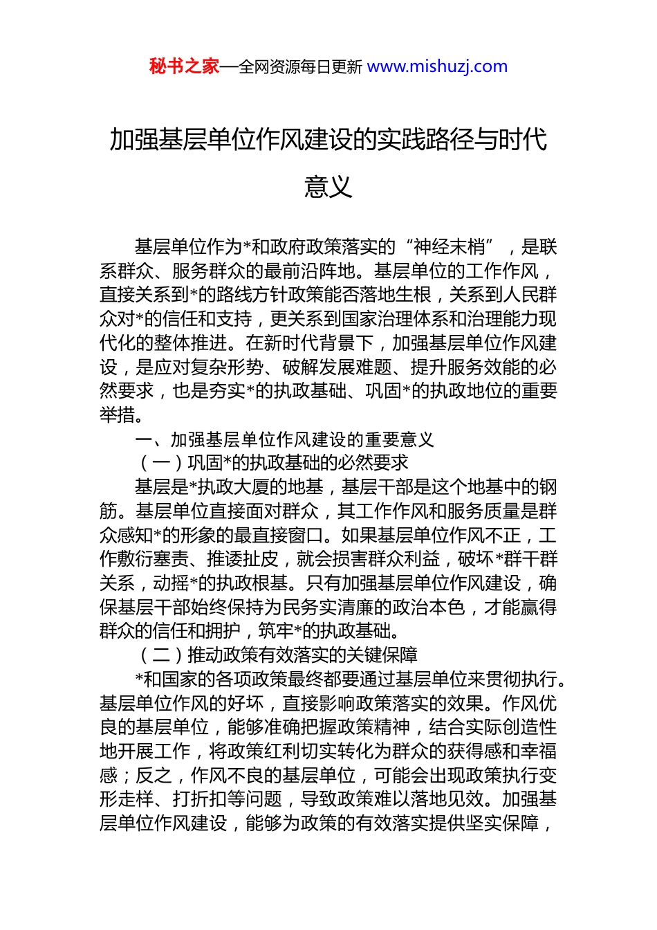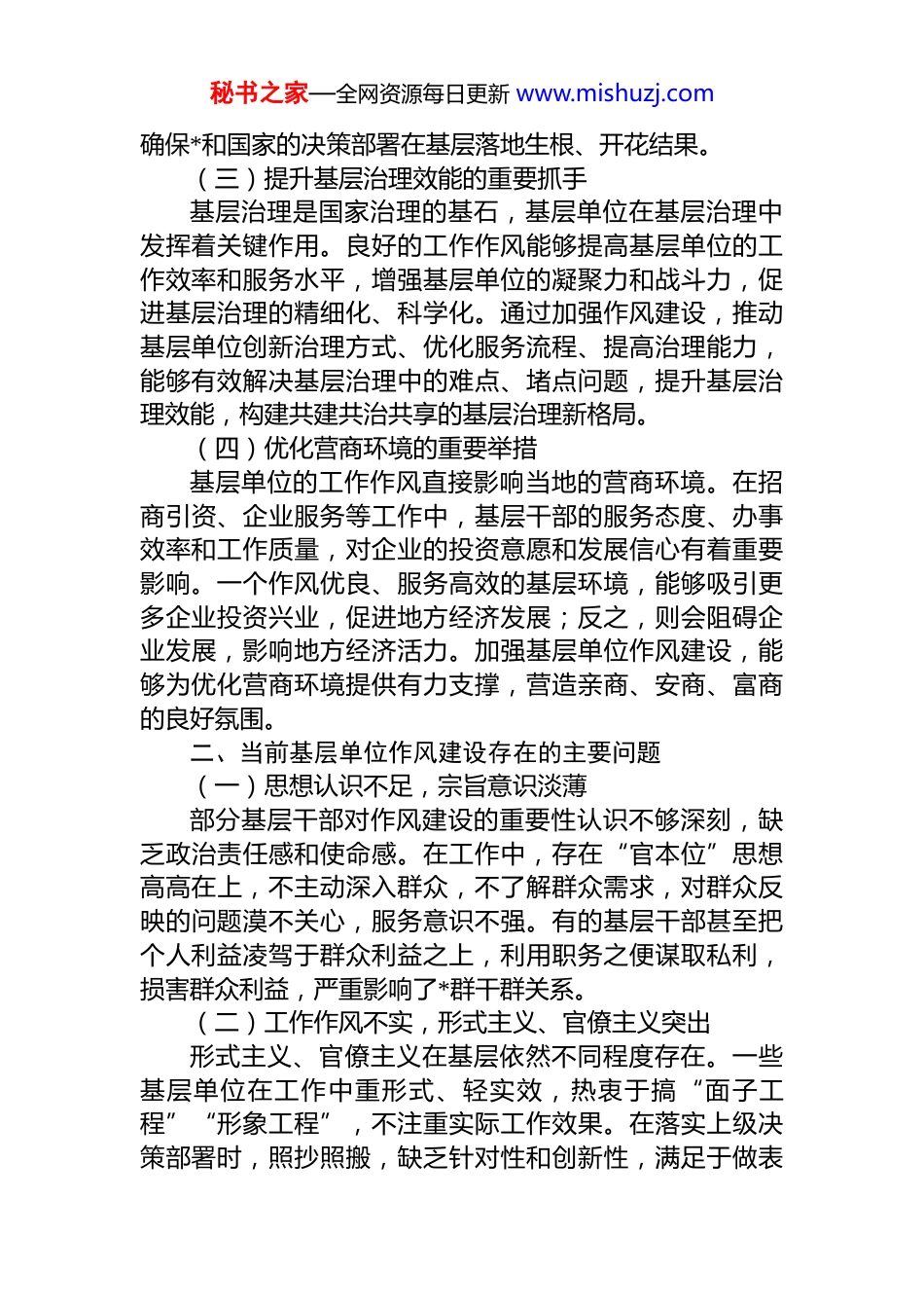 秘书之家—全网资源每日更新 www.mishuzj.com加强基层单位作风建设的实践路径与时代意义基层单位作为*和政府政策落实的“神经末梢”,是联系群众、服务群众的最前沿阵地。基层单位的工作作风,直接关系到*的路线方针政策能否落地生根,关系到人民群众对*的信任和支持,更关系到国家治理体系和治理能力现代化的整体推进。在新时代背景下,加强基层单位作风建设,是应对复杂形势、破解发展难题、提升服务效能的必然要求,也是夯实*的执政基础、巩固*的执政地位的重要举措。一、加强基层单位作风建设的重要意义(一)巩固*的执政基础的必然要求基层是*执政大厦的地基,基层干部是这个地基中的钢筋。基层单位直接面对群众,其工作作风和服务质量是群众感知*的形象的最直接窗口。如果基层单位作风不正,工作敷衍塞责、推诿扯皮,就会损害群众利益,破坏*群干群关系,动摇*的执政根基。只有加强基层单位作风建设,确保基层干部始终保持为民务实清廉的政治本色,才能赢得群众的信任和拥护,筑牢*的执政基础。(二)推动政策有效落实的关键保障*和国家的各项政策最终都要通过基层单位来贯彻执行。基层单位作风的好坏,直接影响政策落实的效果。作风优良的基层单位,能够准确把握政策精神,结合实际创造性地开展工作,将政策红利切实转化为群众的获得感和幸福感;反之,作风不良的基层单位,可能会出现政策执行变形走样、打折扣等问题,导致政策难以落地见效。加强基层单位作风建设,能够为政策的有效落实提供坚实保障,秘书之家—全网资源每日更新 www.mishuzj.com确保*和国家的决策部署在基层落地生根、开花结果。(三)提升基层治理效能的重要抓手基层治理是国家治理的基石,基层单位在基层治理中发挥着关键作用。良好的工作作风能够提高基层单位的工作效率和服务水平,增强基层单位的凝聚力和战斗力,促进基层治理的精细化、科学化。通过加强作风建设,推动基层单位创新治理方式、优化服务流程、提高治理能力,能够有效解决基层治理中的难点、堵点问题,提升基层治理效能,构建共建共治共享的基层治理新格局。(四)优化营商环境的重要举措基层单位的工作作风直接影响当地的营商环境。在招商引资、企业服务等工作中,基层干部的服务态度、办事效率和工作质量,对企业的投资意愿和发展信心有着重要影响。一个作风优良、服务高效的基层环境,能够吸引更多企业投资兴业,促进地方经济发展;反之,则会阻碍企业发展,影响地方经济活力。加强基层单位作风建设,能够为优化营商环境提供有力支撑,营造亲商、安商、富商的良好氛围。二、当前基层单位作风建设存在的主要问题(一)思想认识不足,宗旨意识淡薄部分基层干部对作风建设的重要性认识不够深刻,缺乏政治责任感和使命感。在工作中,存在“官本位”思想高高在上,不主动深入群众,不了解群众需求,对群众反映的问题漠不关心,服务意识不强。有的基层干部甚至把个人利益凌驾于群众利益之上,利用职务之便谋取私利,损害群众利益,严重影响了*群干群关系。(二)工作作风不实,形式主义、官僚主义突出形式主义、官僚主义在基层依然不同程度存在。一些基层单位在工作中重形式、轻实效,热衷于搞“面子工程”“形象工程”,不注重实际工作效果。在落实上级决策部署时,照抄照搬,缺乏针对性和创新性,满足于做表秘书之家—全网资源每日更新 www.mishuzj.com面文章。有的基层干部工作推诿扯皮、敷衍塞责,遇到问题绕道走,不敢担当、不愿负责。此外,文山会海、过度留痕等问题也给基层带来了沉重负担,严重影响了工作效率。(三)纪律意识不强,违规违纪现象时有发生部分基层干部纪律意识淡薄,对 d 的纪律和规矩缺乏敬畏之心。在工作中,违反工作纪律,迟到早退、擅自离岗工作时间做与工作无关的事情;违反廉洁纪律,接受服务对象的礼品礼金、吃请宴请,甚至利用职务之便贪污受贿以权谋私。这些违规违纪行为不仅损害了基层干部的形象也破坏了基层政治生态。(四)能力素质不高,难以适应工作要求随着经济社会的快速发展和基层治理任务的日益繁重,对基层干部的能力素质提出了更高的要求。然而,部分基层干部知识结构老化,学习能力不足...