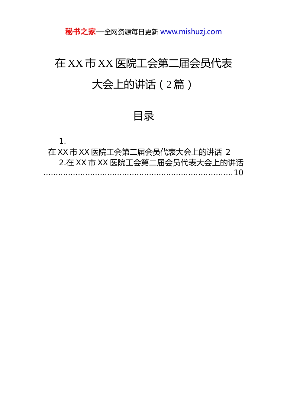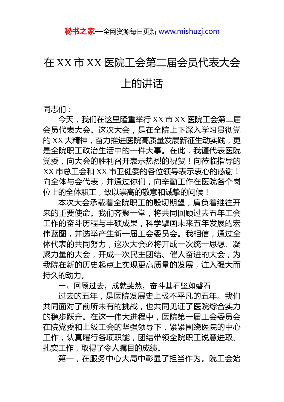 秘书之家—全网资源每日更新 www.mishuzj.com在 XX 市 XX 医院工会第二届会员代表大会上的讲话(2 篇)目录1.在 XX 市 XX 医院工会第二届会员代表大会上的讲话 22.在 XX 市 XX 医院工会第二届会员代表大会上的讲话.............................................................................10秘书之家—全网资源每日更新 www.mishuzj.com在 XX 市 XX 医院工会第二届会员代表大会上的讲话同志们:今天,我们在这里隆重举行 XX 市 XX 医院工会第二届会员代表大会。这次大会,是在全院上下深入学习贯彻党的 XX 大精神,奋力推进医院高质量发展新征生动实践,更是全院职工政治生活中的一件大事。在此,我谨代表医院党委,向大会的胜利召开表示热烈的祝贺!向莅临指导的XX 市总工会和 XX 市卫健委的各位领导表示衷心的感谢!向全体与会代表,并通过你们,向辛勤工作在医院各个岗位上的全体职工,致以崇高的敬意和诚挚的问候!本次大会承载着全院职工的殷切期望,肩负着继往开来的重要使命。我们齐聚一堂,将共同回顾过去五年工会工作的奋斗历程与丰硕成果,科学擘画未来五年发展的宏伟蓝图,并选举产生新一届工会委员会。我相信,通过全体代表的共同努力,这次大会必将开成一次统一思想、凝聚力量的大会,开成一次民主团结、催人奋进的大会,为我院在新的历史起点上实现更高质量的发展,注入强大而持久的动力。一、回顾过去,成就斐然,奋斗基石坚如磐石过去的五年,是医院发展史上极不平凡的五年。我们共同面对了前所未有的挑战,也共同见证了医院综合实力的稳步跃升。在这一伟大进程中,医院第一届工会委员会在院党委和上级工会的坚强领导下,紧紧围绕医院的中心工作,认真履行各项职能,团结带领全院职工锐意进取、扎实工作,取得了令人瞩目的成绩。第一,在服务中心大局中彰显了担当作为。院工会始秘书之家—全网资源每日更新 www.mishuzj.com终坚持将自身工作置于医院发展全局之中谋划和推进,组织动员广大职工积极投身于医疗服务、学科建设、疫情防控等各项重点工作。特别是在攻坚克难的关键时刻,广大职工响应号召,挺身而出,以高度的责任感和无私的奉献精神,筑起了一道道守护人民生命健康的坚固防线。同时工会积极弘扬劳模精神、劳动精神、工匠精神,广泛开展各类劳动竞赛和技能比武。过去五年,我院积极响应 XX 市总工会号召,广泛参与各类竞赛活动,据不完全统计,全院累计组织开展内部岗位技能竞赛超过 50 场次,参与职工逾 3000 人次,有效激发了广大职工钻研业务、提升技能的热情,为医院培养了一大批技术能手和业务骨干。这一系列活动与 XX 市总工会近年来大力推动的竞赛热潮同频共振,在 2023 年,全市就举办了各层级各类竞赛 886 场,参赛职工达 88000 余人,我院职工正是这股浪潮中一朵朵闪亮的浪花。第二,在维护职工权益中展现了“娘家”温暖。工会始终将竭诚服务职工作为一切工作的出发点和落脚点,用心用情用力解决职工群众最关心、最直接、最现实的利益问题。在职工权益保障方面,严格履行监督职能,确保各项政策法规落到实处。在困难帮扶方面,更是建立健全了常态化帮扶机制。过去五年,我们的帮扶工作不仅是医院内部的小循环,更是融入了全市帮扶工作的大格局。例如XX 市总工会仅 2022 年一年就救助困难职工 311 人、发放救助金 214.44 万元。在这一背景下,我院工会累计走访慰问困难职工、患病职工及家属超过 500 人次,发放各类慰问金、救助金近 80 万元,用实际行动传递了组织的关怀与温暖,真正成为了职工信赖的“娘家人”。第三,在推进民主管理中汇聚了磅礴力量。工会坚持和完善以职工代表大会为基本形式的民主管理制度,切实保障职工的知情权、参与权、表达权和监督权。职代会的提案工作质量不断提升,成为反映民意、汇集民智的重要秘书之家—全网资源每日更新 www.mishuzj.com渠道。上一届职代会期间,共收到来自一线职工的有效提案近百件,内容涵盖学科发展、人才培养、后勤保障、福利待遇等方方面面。院工会与相关职能部门紧密协作,建立了高效的提案办理与反馈机制,参照一些先进...