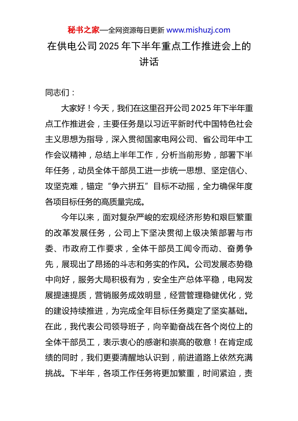 秘书之家—全网资源每日更新 www.mishuzj.com在供电公司 2025 年下半年重点工作推进会上的讲话 同志们:大家好!今天,我们在这里召开公司 2025 年下半年重点工作推进会,主要任务是以习近平新时代中国特色社会主义思想为指导,深入贯彻国家电网公司、省公司年中工作会议精神,总结上半年工作,分析当前形势,部署下半年任务,动员全体干部员工进一步统一思想、坚定信心、攻坚克难,锚定“争六拼五”目标不动摇,全力确保年度各项目标任务的高质量完成。今年以来,面对复杂严峻的宏观经济形势和艰巨繁重的改革发展任务,公司上下坚决贯彻上级决策部署与市委、市政府工作要求,全体干部员工闻令而动、奋勇争先,展现出了昂扬的斗志和务实的作风。公司发展态势稳中向好,服务大局积极有为,安全生产总体平稳,电网发展提速提质,营销服务成效明显,经营管理稳健优化,党的建设持续推进,为完成全年目标任务奠定了坚实基础。在此,我代表公司领导班子,向辛勤奋战在各个岗位上的全体干部员工,表示衷心的感谢和崇高的敬意!在肯定成绩的同时,我们更要清醒地认识到,前进道路上依然充满挑战。下半年,各项工作任务将更加繁重,时间紧迫,责秘书之家—全网资源每日更新 www.mishuzj.com任重大。我们必须以“等不起”的紧迫感、“慢不得”的危机感、“坐不住”的责任感,全面抓好各项工作落实。下面,我讲几点意见。一、深刻洞察战略内涵,精准锚定发展方位,以更高站位谋划未来推动高质量发展,首要在于战略引领。我们必须准确领会国家电网公司战略体系和战略指标体系的核心要义,坚持战略引领,把握战略机遇,以做好省公司“三个结合”、答好“三张答卷”为逻辑起点,清晰回答三个关键问题:第一,结合公司坐标方位,要明确我们在全省电网高质量发展中处于什么位置。我们不仅是*区域的电力供应者,更是全省能源互联网建设的重要节点和坚强骨干网架的关键一环。我们的发展水平、安全绩效、服务质量,直接关系到全省电网的整体形象和综合实力。我们必须跳出*看*,将自身发展置于全省乃至全国的大棋局中去考量,主动作为,争先进位。第二,结合新电系统建设,要明确*电网在省级示范区建设中处于什么位置。当前,以新能源为主体的新型电力系统建设正在加速推进。我们所在的*革命老区,正致力于打造高质量发展示范区,这对能源电力提出了更高要求。我们必须勇当排头兵,积极探索微电网、多能互补和储能秘书之家—全网资源每日更新 www.mishuzj.com等创新模式,加快推进能源互联网产业园建设,像*镇的绿色“零碳”微电网示范项目一样,为破解分布式能源并网消纳难题提供“*方案”。这既是我们的责任,也是我们实现跨越式发展的重大机遇。第三,结合革命老区建设,要明确经济社会发展需要我们作出什么贡献。电力是经济社会发展的“先行官”和“压舱石”。服务好*革命老区的高质量发展,是我们义不容辞的政治责任和社会责任。我们要主动对接地方发展规划,全力保障省市重点项目用电需求,持续深化新时代电力“双满意”工程,通过“电力爱心教室”“智慧电烤烟集群”等项目,深度参与乡村振兴,让电力发展的成果惠及更多人民群众,为政府评估振兴发展成效提供坚实的电力数据支撑。二、聚焦六大关键领域,实施精准攻坚突破,以更实举措推动工作落地做好下半年工作,千头万绪,必须纲举目张,抓住主要矛盾。我们要紧紧围绕国家电网公司和省公司的部署,重点在以下六个方面下功夫、求实效。(一)筑牢安全生产“压舱石”,坚决守住电网生命线安全是电力企业的“天字号”工程,是不可逾越的红线和底线。任何时候都不能有丝毫麻痹和松懈。一要以铁秘书之家—全网资源每日更新 www.mishuzj.com的决心深化反违章治理。违章是事故的温床,反违章是保障安全最直接、最有效的手段。上半年,我们在这方面做了大量工作,下半年要持续加压。要创新管控模式,充分运用智能视频监控等技术手段,实现对作业现场的全时段、全方位监督,有效查处不易发现的“瞬间性违章”。要聚焦特殊场景,严格落实带电作业、有限空间作业、动火作业等高风险操作的管控规范,确保每一项安全措施都执行到位,比如,带电作...