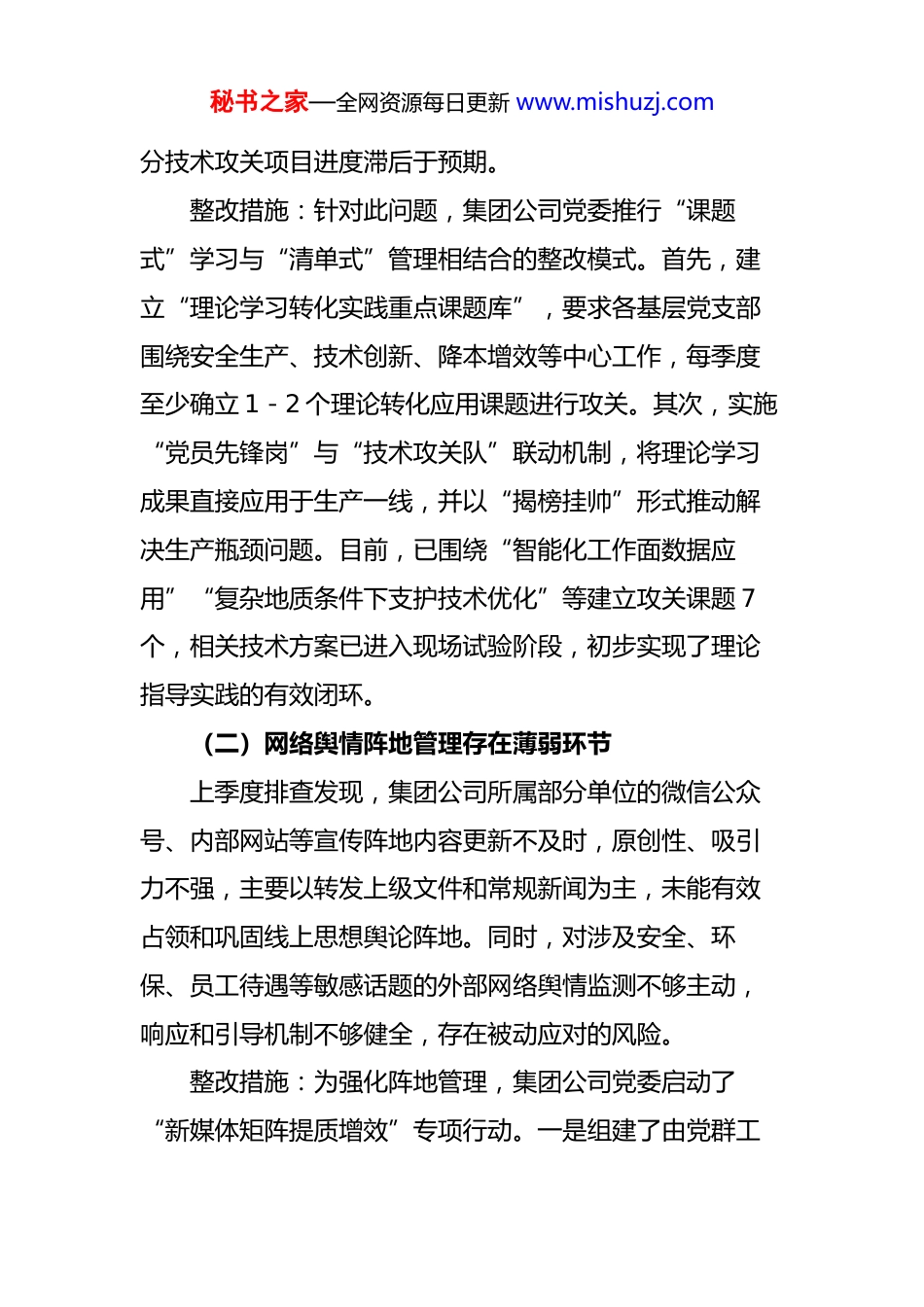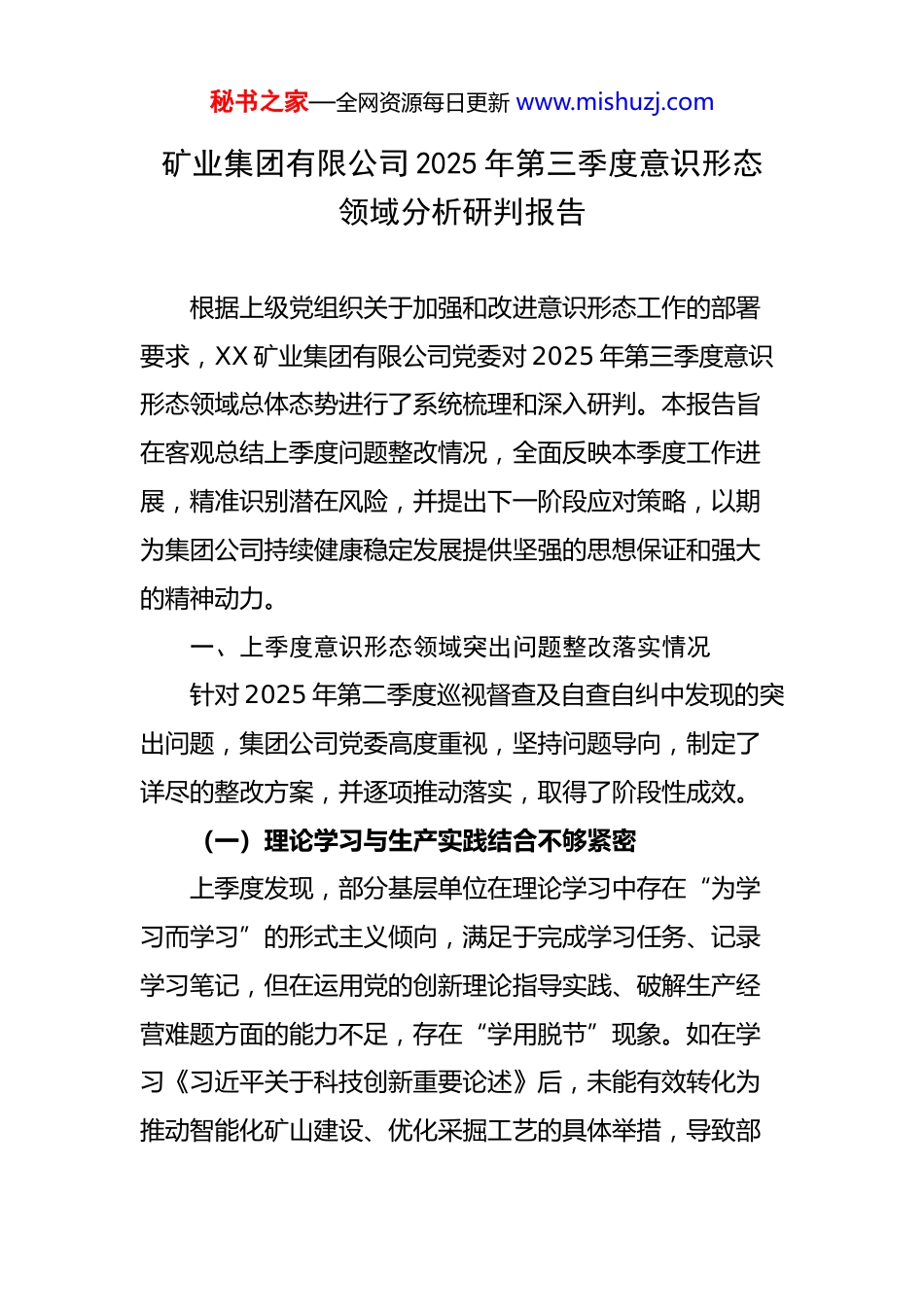 秘书之家—全网资源每日更新 www.mishuzj.com矿业集团有限公司 2025 年第三季度意识形态领域分析研判报告 根据上级党组织关于加强和改进意识形态工作的部署要求,XX 矿业集团有限公司党委对 2025 年第三季度意识形态领域总体态势进行了系统梳理和深入研判。本报告旨在客观总结上季度问题整改情况,全面反映本季度工作进展,精准识别潜在风险,并提出下一阶段应对策略,以期为集团公司持续健康稳定发展提供坚强的思想保证和强大的精神动力。一、上季度意识形态领域突出问题整改落实情况针对 2025 年第二季度巡视督查及自查自纠中发现的突出问题,集团公司党委高度重视,坚持问题导向,制定了详尽的整改方案,并逐项推动落实,取得了阶段性成效。(一)理论学习与生产实践结合不够紧密上季度发现,部分基层单位在理论学习中存在“为学习而学习”的形式主义倾向,满足于完成学习任务、记录学习笔记,但在运用党的创新理论指导实践、破解生产经营难题方面的能力不足,存在“学用脱节”现象。如在学习《习近平关于科技创新重要论述》后,未能有效转化为推动智能化矿山建设、优化采掘工艺的具体举措,导致部秘书之家—全网资源每日更新 www.mishuzj.com分技术攻关项目进度滞后于预期。整改措施:针对此问题,集团公司党委推行“课题式”学习与“清单式”管理相结合的整改模式。首先,建立“理论学习转化实践重点课题库”,要求各基层党支部围绕安全生产、技术创新、降本增效等中心工作,每季度至少确立 1-2 个理论转化应用课题进行攻关。其次,实施“党员先锋岗”与“技术攻关队”联动机制,将理论学习成果直接应用于生产一线,并以“揭榜挂帅”形式推动解决生产瓶颈问题。目前,已围绕“智能化工作面数据应用”“复杂地质条件下支护技术优化”等建立攻关课题 7个,相关技术方案已进入现场试验阶段,初步实现了理论指导实践的有效闭环。(二)网络舆情阵地管理存在薄弱环节上季度排查发现,集团公司所属部分单位的微信公众号、内部网站等宣传阵地内容更新不及时,原创性、吸引力不强,主要以转发上级文件和常规新闻为主,未能有效占领和巩固线上思想舆论阵地。同时,对涉及安全、环保、员工待遇等敏感话题的外部网络舆情监测不够主动,响应和引导机制不够健全,存在被动应对的风险。整改措施:为强化阵地管理,集团公司党委启动了“新媒体矩阵提质增效”专项行动。一是组建了由党群工秘书之家—全网资源每日更新 www.mishuzj.com作部牵头,各单位通讯员共同参与的融媒体中心,建立内容策划、采编、审核、发布一体化工作流程,确保信息发布的时效性与权威性。三季度以来,集团公司公众号原创稿件发布量提升 40%,推出了《一线奋斗者说》《安全生产微课堂》等多个广受职工欢迎的专栏。二是引入第三方舆情监测服务,并指定专人 24 小时负责监测涉企信息,制定了《网络突发舆情事件应急处置预案》,明确了从发现、研判、处置到报告的完整流程。本季度成功处置潜在负面舆情 2 起,平均响应时间控制在 1 小时以内,有效维护了企业良好形象。(三)基层党组织“一岗双责”压力传导不足上季度调研显示,少数基层单位的党政负责人对意识形态工作“一岗双责”的认识存在偏差,存在“重业务、轻思想”的倾向,认为抓好生产经营是“硬指标”,而意识形态工作是“软任务”,导致在实际工作中对职工思想动态的关注和引导投入精力不足。整改措施:集团公司党委从制度层面强化压力传导,确保责任层层落实。第一,修订《党建工作责任制考核评价办法》,将意识形态工作责任制落实情况的考核权重由10%提升至 15%,并增设“网络意识形态阵地管理”等具体考核指标。第二,全面推行基层党支部书记季度述职制秘书之家—全网资源每日更新 www.mishuzj.com度,要求其在报告生产经营情况的同时,必须专题报告本单位意识形态工作开展情况、风险研判及应对措施。第三,集团公司党委委员带头落实包保联系点制度,每季度至少一次深入基层联系点,通过列席支部会议、与一线职工谈心谈话等方式,实地督导意识形态工作责任制落实情况,并将督导结果作为评价基层领导班子和干部的重要依据。二、...