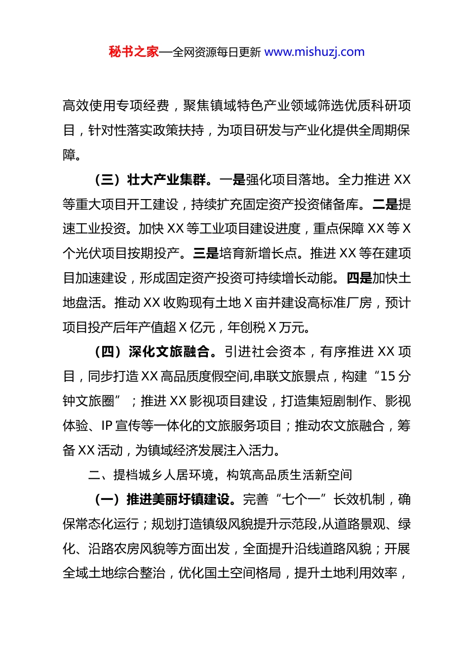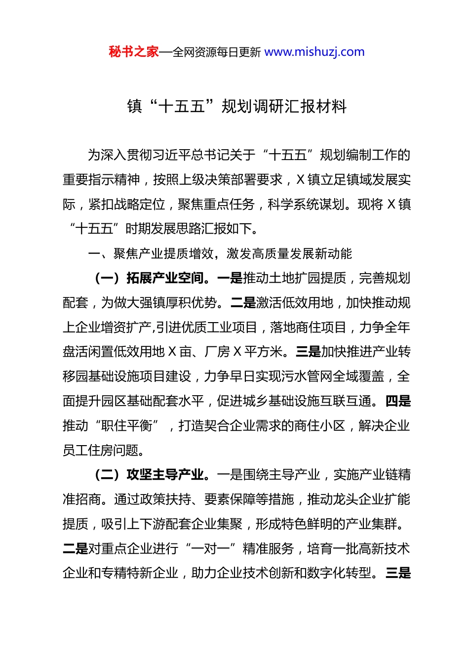 秘书之家—全网资源每日更新 www.mishuzj.com镇“十五五”规划调研汇报材料 为深入贯彻习近平总书记关于“十五五”规划编制工作的重要指示精神,按照上级决策部署要求,X 镇立足镇域发展实际,紧扣战略定位,聚焦重点任务,科学系统谋划。现将 X 镇“十五五”时期发展思路汇报如下。一、聚焦产业提质增效,激发高质量发展新动能(一)拓展产业空间。一是推动土地扩园提质,完善规划配套,为做大强镇厚积优势。二是激活低效用地,加快推动规上企业增资扩产,引进优质工业项目,落地商住项目,力争全年盘活闲置低效用地 X 亩、厂房 X 平方米。三是加快推进产业转移园基础设施项目建设,力争早日实现污水管网全域覆盖,全面提升园区基础配套水平,促进城乡基础设施互联互通。四是推动“职住平衡”,打造契合企业需求的商住小区,解决企业员工住房问题。(二)攻坚主导产业。一是围绕主导产业,实施产业链精准招商。通过政策扶持、要素保障等措施,推动龙头企业扩能提质,吸引上下游配套企业集聚,形成特色鲜明的产业集群。二是对重点企业进行“一对一”精准服务,培育一批高新技术企业和专精特新企业,助力企业技术创新和数字化转型。三是秘书之家—全网资源每日更新 www.mishuzj.com高效使用专项经费,聚焦镇域特色产业领域筛选优质科研项目,针对性落实政策扶持,为项目研发与产业化提供全周期保障。(三)壮大产业集群。一是强化项目落地。全力推进 XX等重大项目开工建设,持续扩充固定资产投资储备库。二是提速工业投资。加快 XX 等工业项目建设进度,重点保障 XX 等 X个光伏项目按期投产。三是培育新增长点。推进 XX 等在建项目加速建设,形成固定资产投资可持续增长动能。四是加快土地盘活。推动 XX 收购现有土地 X 亩并建设高标准厂房,预计项目投产后年产值超 X 亿元,年创税 X 万元。(四)深化文旅融合。引进社会资本,有序推进 XX 项目,同步打造 XX 高品质度假空间,串联文旅景点,构建“15 分钟文旅圈”;推进 XX 影视项目建设,打造集短剧制作、影视体验、IP 宣传等一体化的文旅服务项目;推动农文旅融合,筹备 XX 活动,为镇域经济发展注入活力。二、提档城乡人居环境,构筑高品质生活新空间(一)推进美丽圩镇建设。完善“七个一”长效机制,确保常态化运行;规划打造镇级风貌提升示范段,从道路景观、绿化、沿路农房风貌等方面出发,全面提升沿线道路风貌;开展全域土地综合整治,优化国土空间格局,提升土地利用效率,秘书之家—全网资源每日更新 www.mishuzj.com为城镇扩容提质提供空间保障。(二)精筑特色示范路段。以 XX 为核心推进整街提升,融入市级风貌带建设,雕琢 XX 特色村节点,修缮 XX 景观亭,以“绿化+文化”策略注入生机与文脉。实施“见缝插绿”行动,完成 XX 绿化升级。(三)提升圩镇功能配套。扎实推进 XX 城镇污水处理提质增效工程,投资 XX 万元实施 XX 污水管网改造项目,新建污水管网 X 公里并接入污水处理厂主干管网系统。投资 X 万元启动特色农产品加工体验中心建设项目,规划用地 X 亩,打造集农产品精深加工、电商寄递、物流配送、旅客候车休憩、新能源车充电等多元化服务功能于一体的综合性服务平台。三、深化全域环境治理,擦亮绿美发展生态底色(一)深化人居环境整治。依托“镇村一体”网格化治理模式,落实河道清淤、垃圾日产日清等举措,建立长效管护机制,力争全域达到省级示范标准。以“全民清洁日”活动为抓手,组织群众清理主次干道、绿化带、沟渠河塘等 5 类重点区域垃圾,确保全域实现“路净、水净”;通过“大手拉小手”“全民认养”等创新模式,广泛动员社会各界力量参与其中,重点打造辖区内 XX 等道路的绿化工程,让绿色成为城镇发展最动人的底色;全面完成农村黑臭水体动态排查,按“一村一秘书之家—全网资源每日更新 www.mishuzj.com策”制定治污方案。(二)提升典型村建设质效。升级巩固 XX 建设成果,推动XX 村对标省级标准争创省典型村,制定“一村一策”推进重点任务,挖掘文化特色谋划产业发展,打造和美乡村示范样板。因地制宜,推行“光伏+”...