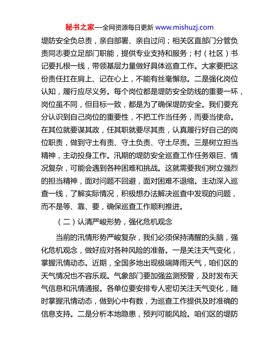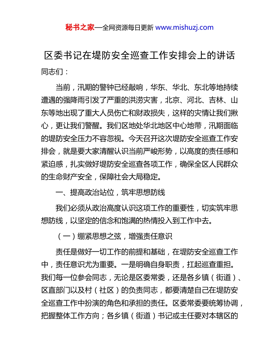 秘书之家—全网资源每日更新 www.mishuzj.com区委书记在堤防安全巡查工作安排会上的讲话同志们:当前,汛期的警钟已经敲响,华东、华北、东北等地持续遭遇的强降雨引发了严重的洪涝灾害,北京、河北、吉林、山东等地出现了重大人员伤亡和财政损失,这样的灾情让我们揪心,更让我们警醒。我们区地处华北地区中心地带,汛期面临的堤防安全压力不容忽视。今天召开这次堤防安全巡查工作安排会,就是要大家清醒认识当前严峻形势,以高度的责任感和紧迫感,扎实做好堤防安全巡查各项工作,确保全区人民群众的生命财产安全,保障社会大局稳定。一、提高政治站位,筑牢思想防线我们必须从政治高度认识这项工作的重要性,切实筑牢思想防线,以坚定的信念和饱满的热情投入到工作中去。(一)绷紧思想之弦,增强责任意识责任是做好一切工作的前提和基础,在堤防安全巡查工作中,责任意识尤为重要。一是明确自身职责,扛起巡查重担。我们每一位参会同志,无论是区委常委,还是各乡镇(街道)、区直部门以及村(社区)的负责同志,都要清楚自己在堤防安全巡查工作中扮演的角色和承担的责任。区委常委要统筹协调,把握整体工作方向;各乡镇(街道)书记或主任要对本辖区的秘书之家—全网资源每日更新 www.mishuzj.com堤防安全负总责,亲自部署、亲自过问;相关区直部门分管负责同志要立足部门职能,提供专业支持和服务;村(社区)书记要扎根一线,带领基层力量做好具体巡查工作。大家要把这份责任扛在肩上、记在心上,不能有丝毫懈怠。二是强化岗位认知,履行应尽义务。每个岗位都是堤防安全防线的重要一环,岗位虽不同,但目标一致,都是为了确保堤防安全。我们要充分认识到自己岗位的重要性,不把工作当任务,而要当使命。在其位就要谋其政,任其职就要尽其责,认真履行好自己的岗位职责,做到守土有责、守土负责、守土尽责。三是树立担当精神,主动投身工作。汛期的堤防安全巡查工作任务艰巨、情况复杂,可能会遇到各种困难和挑战。这就需要我们树立强烈的担当精神,面对问题不回避,面对困难不退缩。主动深入巡查一线,了解实际情况,积极想办法解决巡查中发现的问题,而不是等、靠、要,确保巡查工作顺利推进。(二)认清严峻形势,强化危机观念当前的汛情形势严峻复杂,我们必须保持清醒的头脑,强化危机观念,做好应对各种风险的准备。一是关注天气变化,掌握汛情动态。近期,全国多地出现极端降雨天气,咱们区的天气情况也不容乐观。气象部门要加强监测预警,及时发布天气信息和汛情通报。各单位要安排专人密切关注天气变化,随时掌握汛情动态,做到心中有数,为巡查工作提供及时准确的信息支持。二是分析本地隐患,预判可能风险。咱们区的堤防秘书之家—全网资源每日更新 www.mishuzj.com建设年代不同,存在的隐患也各有差异。有的堤防可能存在结构老化问题,有的可能在历史上就发生过险情。我们要组织专业人员对全区的堤防进行全面排查,分析存在的隐患点,根据隐患的性质和程度,预判可能发生的风险,做到早发现、早预防。三是对比外地灾害,警醒自身不足。北京、河北等地的洪涝灾害给我们敲响了警钟,我们要认真对比分析这些地区灾害发生的原因和过程,反思咱们区在堤防建设、巡查管理、应急处置等方面存在的不足。不能有侥幸心理,认为咱们区不会发生类似的灾害,要以别人的教训为镜鉴,查漏补缺,不断完善我们的工作。(三)汲取经验教训,树牢底线思维底线思维是一种重要的工作方法,在堤防安全巡查工作中我们要汲取各地的经验教训,树立底线思维,做好最坏的打算,争取最好的结果。一是学习受灾地区教训,反思自身工作。受灾地区在灾害应对过程中,既有成功的经验,也有深刻的教训。我们要组织学习研讨,深入分析他们在巡查不到位、预警不及时、处置不当等方面的问题,对照检查我们自己的工作流程和方法,找出存在的漏洞和薄弱环节,及时加以改进。二是查找巡查薄弱环节,及时加以改进。在以往的巡查工作中,可能存在一些容易被忽视的薄弱环节,比如偏远地段的巡查频次不够、夜间巡查力度不足等。我们要结合实际情况,全面查找这些薄弱环节,制定针对性的改进措施,增加巡查...