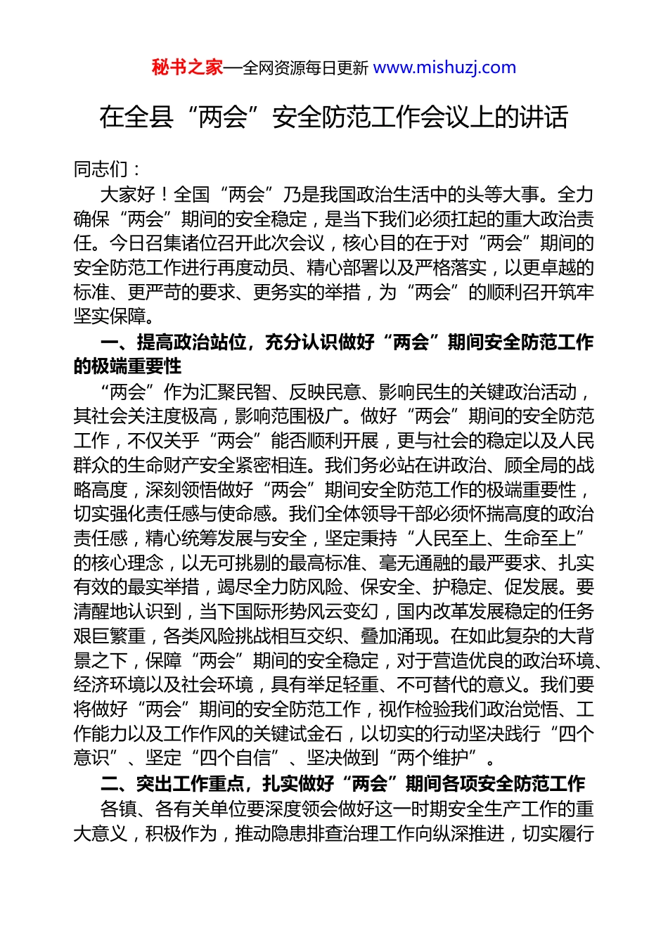 秘书之家—全网资源每日更新 www.mishuzj.com在全县“两会”安全防范工作会议上的讲话同志们: 大家好!全国“两会”乃是我国政治生活中的头等大事。全力确保“两会”期间的安全稳定,是当下我们必须扛起的重大政治责任。今日召集诸位召开此次会议,核心目的在于对“两会”期间的安全防范工作进行再度动员、精心部署以及严格落实,以更卓越的标准、更严苛的要求、更务实的举措,为“两会”的顺利召开筑牢坚实保障。 一、提高政治站位,充分认识做好“两会”期间安全防范工作的极端重要性 “两会”作为汇聚民智、反映民意、影响民生的关键政治活动,其社会关注度极高,影响范围极广。做好“两会”期间的安全防范工作,不仅关乎“两会”能否顺利开展,更与社会的稳定以及人民群众的生命财产安全紧密相连。我们务必站在讲政治、顾全局的战略高度,深刻领悟做好“两会”期间安全防范工作的极端重要性,切实强化责任感与使命感。我们全体领导干部必须怀揣高度的政治责任感,精心统筹发展与安全,坚定秉持“人民至上、生命至上”的核心理念,以无可挑剔的最高标准、毫无通融的最严要求、扎实有效的最实举措,竭尽全力防风险、保安全、护稳定、促发展。要清醒地认识到,当下国际形势风云变幻,国内改革发展稳定的任务艰巨繁重,各类风险挑战相互交织、叠加涌现。在如此复杂的大背景之下,保障“两会”期间的安全稳定,对于营造优良的政治环境、经济环境以及社会环境,具有举足轻重、不可替代的意义。我们要将做好“两会”期间的安全防范工作,视作检验我们政治觉悟、工作能力以及工作作风的关键试金石,以切实的行动坚决践行“四个意识”、坚定“四个自信”、坚决做到“两个维护”。 二、突出工作重点,扎实做好“两会”期间各项安全防范工作 各镇、各有关单位要深度领会做好这一时期安全生产工作的重大意义,积极作为,推动隐患排查治理工作向纵深推进,切实履行秘书之家—全网资源每日更新 www.mishuzj.com好安全生产综合监管职责,牢牢盯紧、看牢重点地区、重点行业领域,倾尽全力确保社会大局安稳有序。 (一)加强社会治安防控,凝聚强大社会氛围。公安机关、镇派出所要强化沟通协作,统筹民警、网格员、群众志愿者等各方力量,进一步加大巡逻防控的力度和密度,显著提高街面见警率,以雷霆之势严厉打击各类违法犯罪活动。要对重点区域、重点部位、重点人员实施更为严密的管控,尤其是要对车站、机场、商场、学校等人员密集场所的安全防范工作进行再强化,严格落实三人应急小组、防撞墩和监控设置等关键措施,确保社会治安秩序坚如磐石、稳如泰山。 (二)强化安全生产监管,保证大局稳定安然。应急管理部门要对矿山、危险化学品、烟花爆竹、建筑施工、道路交通、消防等重点行业领域的安全监管进行再升级,督促企业精心制定并严格落实消防安全应急预案及相关防控措施,深入、细致、全面地开展隐患排查治理工作,以零容忍的态度严厉打击违法违规生产经营行为。特别要强化电动自行车消防安全管理工作,加大隐患排查的深度和广度,加强宣传教育的力度和精度,严防电动车火灾事故的发生。要督促企业切实落实安全生产主体责任,不断加强安全管理,确保生产过程安全无虞。 (三)抓好信访维稳工作,就地化解矛盾纠纷。县有关部门和各镇要对各类信访矛盾纠纷进行全面、深入、细致的梳理排查,严格落实领导包案和干部联系跟进制度,积极主动、想方设法化解信访积案。要对重点信访人员实施更为有效的稳控,不折不扣地落实每天见面、每天报平安的工作要求,耐心做好思想教育和疏导工作,坚决防止发生越级上访和非正常上访事件。要充分借助大数据和无人机等先进技术,快速、精准监测重点人物的动向,时刻做好维稳工作的充分准备。 (四)做好网络安全保障,强化网络监测监管。县委宣传部、网信部门要对网络舆情监测和分析研判工作进行再优化、再加强,对于不正确的言论要做到及时发现、迅速制止、有效引导。对于具秘书之家—全网资源每日更新 www.mishuzj.com有较大不良倾向的网络信息,一旦必要,必须当机立断处置有害信息,坚决防止网络舆情的恶意炒作。要进一步加强网络安全防护...