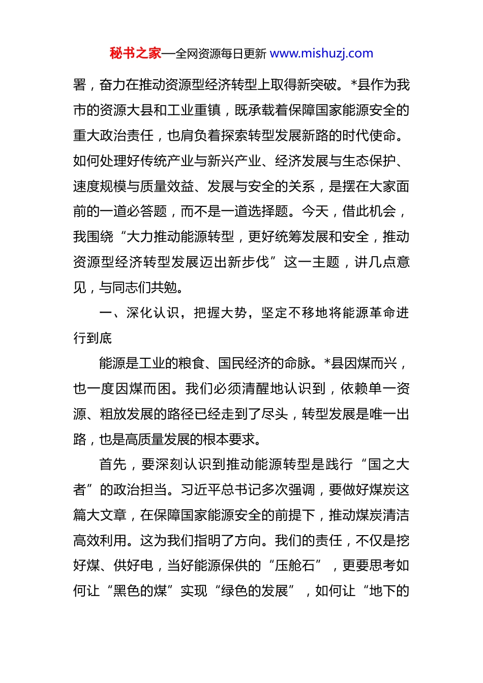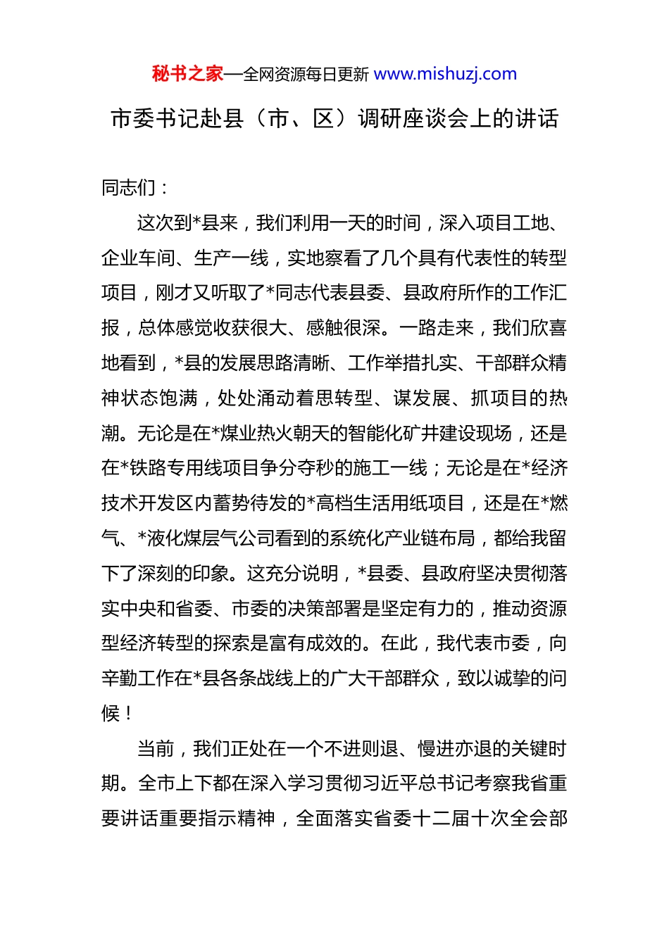 秘书之家—全网资源每日更新 www.mishuzj.com市委书记赴县(市、区)调研座谈会上的讲话 同志们:这次到*县来,我们利用一天的时间,深入项目工地、企业车间、生产一线,实地察看了几个具有代表性的转型项目,刚才又听取了*同志代表县委、县政府所作的工作汇报,总体感觉收获很大、感触很深。一路走来,我们欣喜地看到,*县的发展思路清晰、工作举措扎实、干部群众精神状态饱满,处处涌动着思转型、谋发展、抓项目的热潮。无论是在*煤业热火朝天的智能化矿井建设现场,还是在*铁路专用线项目争分夺秒的施工一线;无论是在*经济技术开发区内蓄势待发的*高档生活用纸项目,还是在*燃气、*液化煤层气公司看到的系统化产业链布局,都给我留下了深刻的印象。这充分说明,*县委、县政府坚决贯彻落实中央和省委、市委的决策部署是坚定有力的,推动资源型经济转型的探索是富有成效的。在此,我代表市委,向辛勤工作在*县各条战线上的广大干部群众,致以诚挚的问候!当前,我们正处在一个不进则退、慢进亦退的关键时期。全市上下都在深入学习贯彻习近平总书记考察我省重要讲话重要指示精神,全面落实省委十二届十次全会部秘书之家—全网资源每日更新 www.mishuzj.com署,奋力在推动资源型经济转型上取得新突破。*县作为我市的资源大县和工业重镇,既承载着保障国家能源安全的重大政治责任,也肩负着探索转型发展新路的时代使命。如何处理好传统产业与新兴产业、经济发展与生态保护、速度规模与质量效益、发展与安全的关系,是摆在大家面前的一道必答题,而不是一道选择题。今天,借此机会,我围绕“大力推动能源转型,更好统筹发展和安全,推动资源型经济转型发展迈出新步伐”这一主题,讲几点意见,与同志们共勉。一、深化认识,把握大势,坚定不移地将能源革命进行到底能源是工业的粮食、国民经济的命脉。*县因煤而兴,也一度因煤而困。我们必须清醒地认识到,依赖单一资源、粗放发展的路径已经走到了尽头,转型发展是唯一出路,也是高质量发展的根本要求。首先,要深刻认识到推动能源转型是践行“国之大者”的政治担当。习近平总书记多次强调,要做好煤炭这篇大文章,在保障国家能源安全的前提下,推动煤炭清洁高效利用。这为我们指明了方向。我们的责任,不仅是挖好煤、供好电,当好能源保供的“压舱石”,更要思考如何让“黑色的煤”实现“绿色的发展”,如何让“地下的秘书之家—全网资源每日更新 www.mishuzj.com宝藏”转化为“地上的产业集群”。我们这次在*煤业看到的,不仅仅是一个年产 500 万吨的矿井,更是一个集绿色开采、智能管控、循环利用于一体的现代化能源企业样板。这说明,传统煤炭产业通过科技赋能,完全可以焕发新的生机与活力。我们必须站在保障国家能源安全和落实“双碳”目标的政治高度,坚定有序推进转型,确保能源的饭碗牢牢端在自己手里,而且要吃得更健康、更长远。其次,要深刻认识到推动能源转型是抢抓新质生产力发展机遇的战略选择。当前,新一轮科技革命和产业变革方兴未艾,以高端化、多元化、低碳化为特征的新质生产力,正在重塑产业格局。对于我们这样的资源型地区而言,发展新质生产力,最大的增量、最广阔的舞台就在能源领域。一方面,要用新技术改造提升传统优势产业。煤炭的智能化改造、煤层气的高效抽采利用,都是在用新质生产力为传统动能赋能。另一方面,要用新赛道培育壮大新兴产业。要积极布局风能、光伏、储能等新能源产业,不能满足于单个项目的“点上开花”,而要追求整个产业链的“面上结果”,构建起煤电与“风、光、水、储”多元互补的能源供应体系,抢占未来发展的制高点。再次,要深刻认识到推动能源转型是实现县域经济高质量发展的必由之路。*县被确定为县域经济高质量发展的秘书之家—全网资源每日更新 www.mishuzj.com试点,这是省委、市委寄予的厚望。试点的“试”字,核心就是要敢闯敢试、先行先试,在转型发展上蹚出一条新路来。这条路绝不能再走资源依赖的老路,必须构建起多元支撑的现代化产业体系。我们高兴地看到,*县经济技术开发区正在朝着这个方向努力,围绕先进制造业,集中精力做好延链补链强链文章。像*高档生...