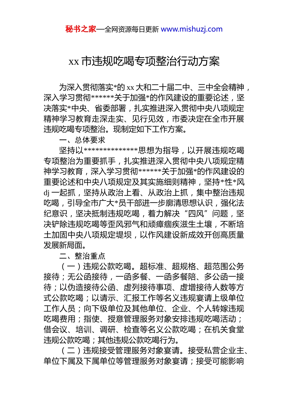 秘书之家—全网资源每日更新 www.mishuzj.comxx 市违规吃喝专项整治行动方案为深入贯彻落实*的 xx 大和二十届二中、三中全会精神,深入学习贯彻******关于加强*的作风建设的重要论述,坚决落实*中央、省委部署,扎实推进深入贯彻中央八项规定精神学习教育走深走实、见行见效,市委决定在全市开展违规吃喝专项整治。现制定如下工作方案。一、总体要求坚持以**************思想为指导,以开展违规吃喝专项整治为重要抓手,扎实推进深入贯彻中央八项规定精神学习教育,深入学习贯彻******关于加强*的作风建设的重要论述和中央八项规定及其实施细则精神,坚持*性*风dj 一起抓,坚持从政治上看、从政治上抓,集中整治违规吃喝,引导全市广大*员干部进一步廓清思想认识,强化法纪意识,坚决抵制违规吃喝,着力解决“四风”问题,坚决铲除违规吃喝等歪风邪气和顽瘴痼疾滋生土壤,不断培土加固中央八项规定堤坝,以作风建设新成效开创高质量发展新局面。二、整治重点(一)违规公款吃喝。超标准、超规格、超范围公务接待;无公函接待,一函多餐、一函多餐陪、多公函一接待;以伪造接待公函、虚列接待事项、虚增接待人数等方式公款吃喝;以请示、汇报工作等名义违规宴请上级单位工作人员;向下级单位及其他单位、企业、个人转嫁违规吃喝费用;指使、授意管理服务对象安排违规吃喝活动;借会议、培训、调研、检查等名义公款吃喝;在机关食堂违规公款吃喝;其他违规公款吃喝行为。(二)违规接受管理服务对象宴请。接受私营企业主、单位下属及下属单位等管理服务对象宴请;接受可能影响秘书之家—全网资源每日更新 www.mishuzj.com公正执行公务的宴请;在工作时间内及会议、培训、检查调研、值班等活动期间饮酒;接受管理服务对象安排的可能影响公正执行公务的旅游、健身、娱乐等活动;其他违规接受管理服务对象宴请行为。(三)违规组织或参加“小圈子”吃喝。上下级、同事之间违规组织饭局,搞拉帮结派、利益交换、说情打招呼;组织参加带有“小圈子”性质的“老乡会”“校友会”“战友会”等违规吃喝;其他违规组织或参加“小圈子”吃喝行为。(四)违规出入私人会所或“一桌餐”场所吃喝。违规出入实行会员制、只有会员才能出入的会所或不向公众开放、只对少数人开放的餐饮服务、休闲娱乐、美容健身等场所吃喝;在“一桌餐”场所违规吃喝;其他违规出入私人会所或“一桌餐”场所吃喝行为。(五)违规饮酒。在工作时间内饮酒;在值班期间饮酒;在执行公务任务期间饮酒;酒后驾车;其他违规饮酒行为。三、方法步骤专项整治从 2025 年 6 开始,到 2025 年 12 月结束,分四个阶段进行。(一)动员部署阶段。召开全市违规吃喝专项整治动员部署会,深入学习贯彻******关于加强*的作风建设的重要论述,坚决落实*中央、省委部署,对全市违规吃喝专项整治工作进行动员部署。各县区、各部门、各单位要召开专题会议,传达学习全市违规吃喝专项整治动员部署会精神,研究制定本地区、本部门、本单位专项整治工作方案成立工作专班,明确责任分工,迅速启动专项整治工作。充分利用报纸、电视、广播、网络等媒体,广泛宣传违规吃喝专项整治的重要意义、整治重点和工作要求,营造浓厚的整治氛围。(二)自查自纠阶段。各县区、各部门、各单位要组秘书之家—全网资源每日更新 www.mishuzj.com织*员干部认真学习中央八项规定及其实施细则精神,学习dj 国法和有关规章制度,深刻认识违规吃喝的严重危害,切实增强纪律意识和规矩意识。组织*员干部对照整治重点,深入开展自查自纠,认真查找自身存在的问题,如实填写《违规吃喝问题自查自纠情况登记表》,并作出承诺。对自查出的问题,要制定整改措施,明确整改时限,认真进行整改。各县区、各部门、各单位要对本地区、本部门、本单位公务接待、公务用车、差旅费报销等制度执行情况进行全面自查,查找制度漏洞和监管薄弱环节,完善相关制度,加强日常监管。各县区、各部门、各单位要将自查自纠情况形成书面报告,经主要负责同志签字后,于 xx 月前报市违规吃喝专项整治工作专班。(三)监督检查阶段。市纪委监委成立监督检查组,采取明察暗访...