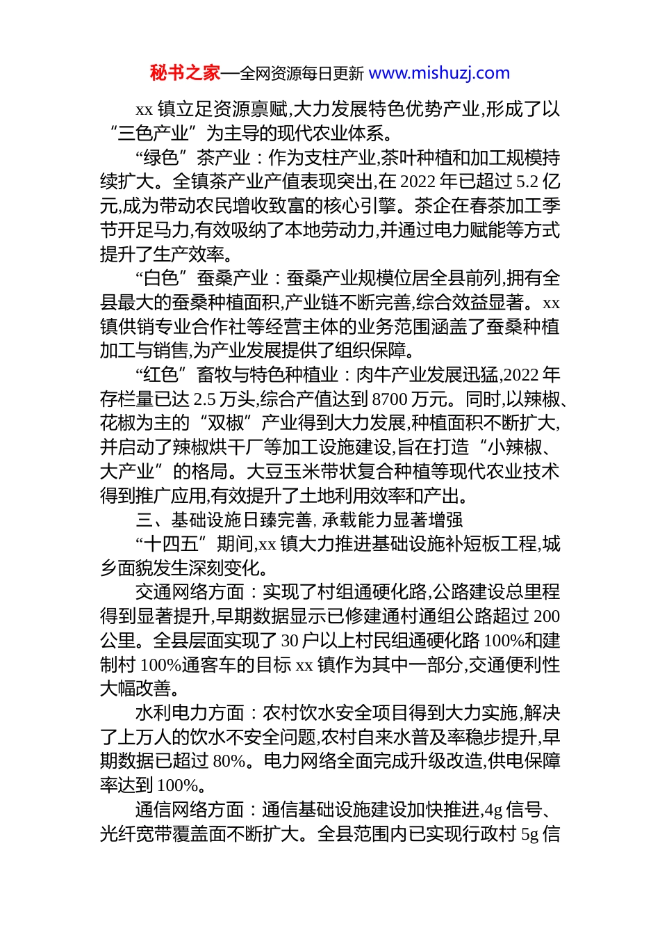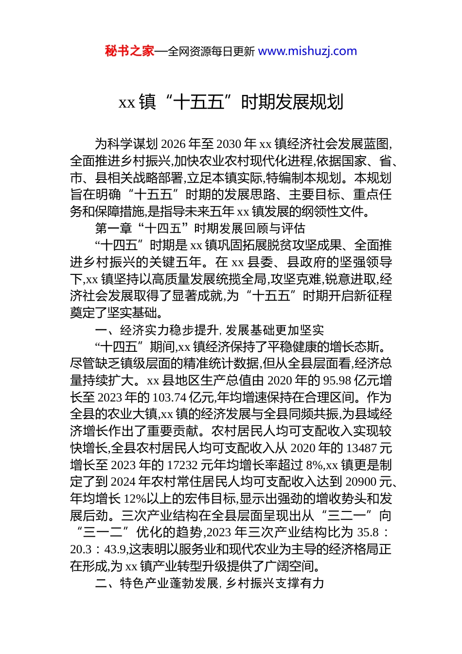 秘书之家—全网资源每日更新 www.mishuzj.comxx 镇“十五五”时期发展规划为科学谋划 2026 年至 2030 年 xx 镇经济社会发展蓝图,全面推进乡村振兴,加快农业农村现代化进程,依据国家、省、市、县相关战略部署,立足本镇实际,特编制本规划。本规划旨在明确“十五五”时期的发展思路、主要目标、重点任务和保障措施,是指导未来五年 xx 镇发展的纲领性文件。第一章“十四五”时期发展回顾与评估“十四五”时期是 xx 镇巩固拓展脱贫攻坚成果、全面推进乡村振兴的关键五年。在 xx 县委、县政府的坚强领导下,xx 镇坚持以高质量发展统揽全局,攻坚克难,锐意进取,经济社会发展取得了显著成就,为“十五五”时期开启新征程奠定了坚实基础。一、经济实力稳步提升,发展基础更加坚实“十四五”期间,xx 镇经济保持了平稳健康的增长态斯。尽管缺乏镇级层面的精准统计数据,但从全县层面看,经济总量持续扩大。xx 县地区生产总值由 2020 年的 95.98 亿元增长至 2023 年的 103.74 亿元,年均增速保持在合理区间。作为全县的农业大镇,xx 镇的经济发展与全县同频共振,为县域经济增长作出了重要贡献。农村居民人均可支配收入实现较快增长,全县农村居民人均可支配收入从 2020 年的 13487 元增长至 2023 年的 17232 元年均增长率超过 8%,xx 镇更是制定了到 2024 年农村常住居民人均可支配收入达到 20900 元、年均增长 12%以上的宏伟目标,显示出强劲的增收势头和发展后劲。三次产业结构在全县层面呈现出从“三二一”向“三一二”优化的趋势,2023 年三次产业结构比为 35.8:20.3:43.9,这表明以服务业和现代农业为主导的经济格局正在形成,为 xx 镇产业转型升级提供了广阔空间。二、特色产业蓬勃发展,乡村振兴支撑有力秘书之家—全网资源每日更新 www.mishuzj.comxx 镇立足资源禀赋,大力发展特色优势产业,形成了以“三色产业”为主导的现代农业体系。“绿色”茶产业:作为支柱产业,茶叶种植和加工规模持续扩大。全镇茶产业产值表现突出,在 2022 年已超过 5.2 亿元,成为带动农民增收致富的核心引擎。茶企在春茶加工季节开足马力,有效吸纳了本地劳动力,并通过电力赋能等方式提升了生产效率。“白色”蚕桑产业:蚕桑产业规模位居全县前列,拥有全县最大的蚕桑种植面积,产业链不断完善,综合效益显著。xx镇供销专业合作社等经营主体的业务范围涵盖了蚕桑种植加工与销售,为产业发展提供了组织保障。“红色”畜牧与特色种植业:肉牛产业发展迅猛,2022 年存栏量已达 2.5 万头,综合产值达到 8700 万元。同时,以辣椒、花椒为主的“双椒”产业得到大力发展,种植面积不断扩大,并启动了辣椒烘干厂等加工设施建设,旨在打造“小辣椒、大产业”的格局。大豆玉米带状复合种植等现代农业技术得到推广应用,有效提升了土地利用效率和产出。三、基础设施日臻完善,承载能力显著增强“十四五”期间,xx 镇大力推进基础设施补短板工程,城乡面貌发生深刻变化。交通网络方面:实现了村组通硬化路,公路建设总里程得到显著提升,早期数据显示已修建通村通组公路超过 200公里。全县层面实现了 30 户以上村民组通硬化路 100%和建制村 100%通客车的目标 xx 镇作为其中一部分,交通便利性大幅改善。水利电力方面:农村饮水安全项目得到大力实施,解决了上万人的饮水不安全问题,农村自来水普及率稳步提升,早期数据已超过 80%。电力网络全面完成升级改造,供电保障率达到 100%。通信网络方面:通信基础设施建设加快推进,4g 信号、光纤宽带覆盖面不断扩大。全县范围内已实现行政村 5g 信秘书之家—全网资源每日更新 www.mishuzj.com号全覆盖,为 xx 镇数字乡村建设和电商产业发展奠定了网络基础。人居环境方面:生活垃圾收运处置体系逐步健全,全县行政村覆盖率已达到较高水平,部分区域实现 100%覆盖。生活污水治理工作有序推进,实施了污水处理设施及配套管网提升工程。四、民生福祉持续增进,社会事业全面进步xx 镇始终坚持以人民为中心的发展思想,持续加大民生投入,公共服务水平稳步提高。公共服务供给:根据历史数据,镇内拥有幼儿园、小学、初中等教育机构,以及卫生院、文化站、...