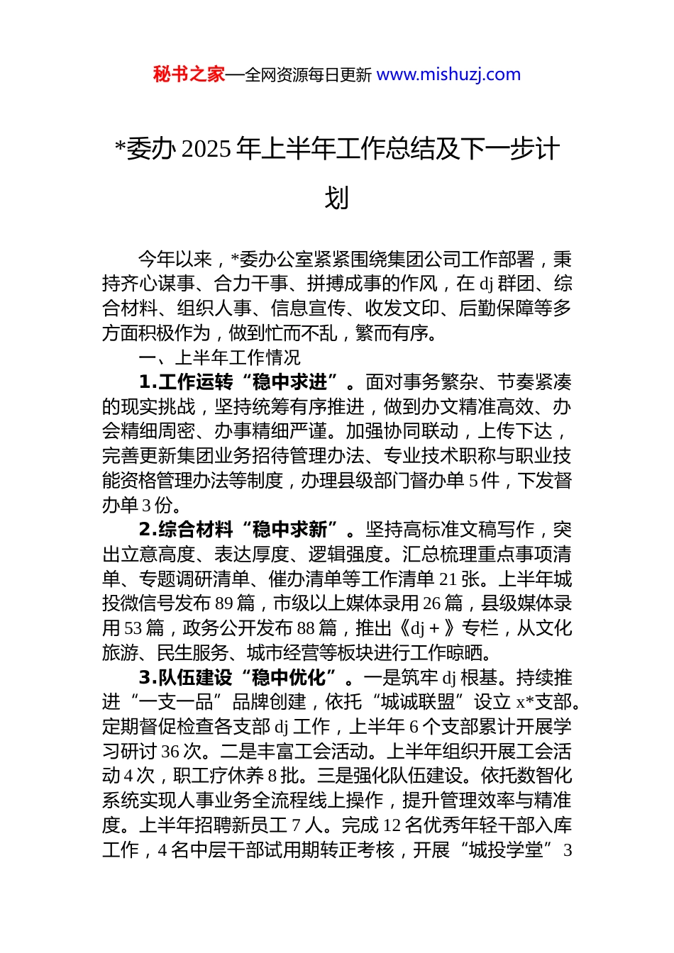 秘书之家—全网资源每日更新 www.mishuzj.com*委办 2025 年上半年工作总结及下一步计划今年以来,*委办公室紧紧围绕集团公司工作部署,秉持齐心谋事、合力干事、拼搏成事的作风,在 dj 群团、综合材料、组织人事、信息宣传、收发文印、后勤保障等多方面积极作为,做到忙而不乱,繁而有序。一、上半年工作情况1.工作运转“稳中求进”。面对事务繁杂、节奏紧凑的现实挑战,坚持统筹有序推进,做到办文精准高效、办会精细周密、办事精细严谨。加强协同联动,上传下达,完善更新集团业务招待管理办法、专业技术职称与职业技能资格管理办法等制度,办理县级部门督办单 5 件,下发督办单 3 份。2.综合材料“稳中求新”。坚持高标准文稿写作,突出立意高度、表达厚度、逻辑强度。汇总梳理重点事项清单、专题调研清单、催办清单等工作清单 21 张。上半年城投微信号发布 89 篇,市级以上媒体录用 26 篇,县级媒体录用 53 篇,政务公开发布 88 篇,推出《dj+》专栏,从文化旅游、民生服务、城市经营等板块进行工作晾晒。3.队伍建设“稳中优化”。一是筑牢 dj 根基。持续推进“一支一品”品牌创建,依托“城诚联盟”设立 x*支部。定期督促检查各支部 dj 工作,上半年 6 个支部累计开展学习研讨 36 次。二是丰富工会活动。上半年组织开展工会活动 4 次,职工疗休养 8 批。三是强化队伍建设。依托数智化系统实现人事业务全流程线上操作,提升管理效率与精准度。上半年招聘新员工 7 人。完成 12 名优秀年轻干部入库工作,4 名中层干部试用期转正考核,开展“城投学堂”3秘书之家—全网资源每日更新 www.mishuzj.com场。4.服务保障“稳中提质”。督促办理建议提案 28 件;信访件答复 27 件;政务服务热线和智慧城管交办 524 件;形成项目档案案卷 457 卷、文书档案 1315 件。二、下半年工作措施1.dj 工作创特色、强引领。围绕“固本强基”dj 全域提升及“提亮增色”基层 dj 特色品牌提升行动,进一步夯实“五城红”dj 品牌,加强支部规范化建设、品牌矩阵合力、*业融合提质发展。2.人事管理开新局、提效能。加强与国资对接协调,做好上对下综合考核工作;持续完善绩效考核机制,加快考核任务分解,严谨细致开展员工月度考核与部门季度考核,推进人事管理信息化建设。夯实“城投学堂”培训品牌,采用课堂式授课与现场实践教学相结合的方式,全面提高员工能力。根据集团战略与业务发展需求,精准定位人才需求。3.宣传工作亮品牌、扩影响。策划城市软文专栏宣传,聚焦街区特色美食(如老字号小吃、街巷烟火味、时令限定美味等)、醉人美景(如自然风光、城市新地标等),兼顾城市发展中的民生温度、建设成果等多元内容,以生动笔触展现城市魅力。4.服务保障加速度、优质量。加强部门间的统筹兼顾、协同联动,提升文字撰写实效性、办文及时性、协调系统性。加快档案数字化转换进度,开展后勤服务标准化建设从食堂管理、会务保障到公车使用,规范服务流程,提高服务保障质量与水平。