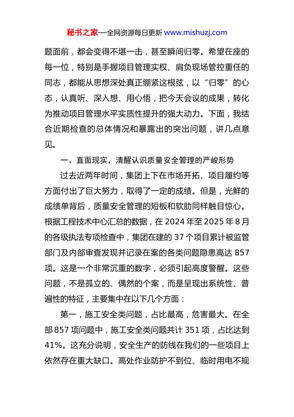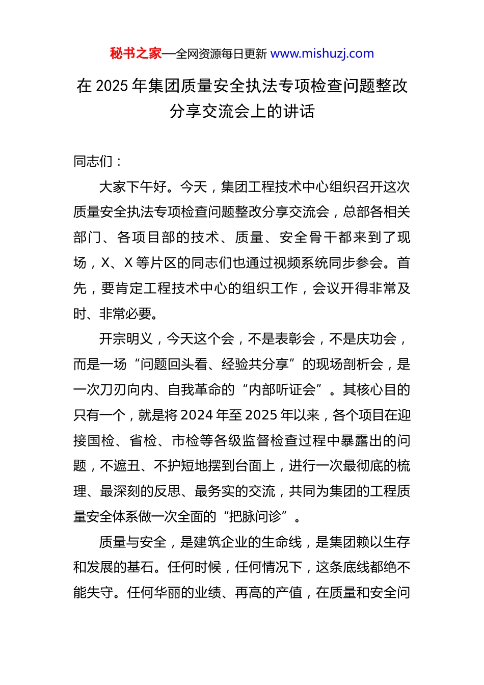 秘书之家—全网资源每日更新 www.mishuzj.com在 2025 年集团质量安全执法专项检查问题整改分享交流会上的讲话 同志们:大家下午好。今天,集团工程技术中心组织召开这次质量安全执法专项检查问题整改分享交流会,总部各相关部门、各项目部的技术、质量、安全骨干都来到了现场,X、X 等片区的同志们也通过视频系统同步参会。首先,要肯定工程技术中心的组织工作,会议开得非常及时、非常必要。开宗明义,今天这个会,不是表彰会,不是庆功会,而是一场“问题回头看、经验共分享”的现场剖析会,是一次刀刃向内、自我革命的“内部听证会”。其核心目的只有一个,就是将 2024 年至 2025 年以来,各个项目在迎接国检、省检、市检等各级监督检查过程中暴露出的问题,不遮丑、不护短地摆到台面上,进行一次最彻底的梳理、最深刻的反思、最务实的交流,共同为集团的工程质量安全体系做一次全面的“把脉问诊”。质量与安全,是建筑企业的生命线,是集团赖以生存和发展的基石。任何时候,任何情况下,这条底线都绝不能失守。任何华丽的业绩、再高的产值,在质量和安全问秘书之家—全网资源每日更新 www.mishuzj.com题面前,都会变得不堪一击,甚至瞬间归零。希望在座的每一位,特别是手握项目管理实权、肩负现场管控重任的同志,都能从思想深处真正绷紧这根弦,以“归零”的心态,认真听、深入想、用心悟,把今天会议的成果,转化为推动项目管理水平实质性提升的强大动力。下面,我结合近期检查的总体情况和暴露出的突出问题,讲几点意见。一、直面现实,清醒认识质量安全管理的严峻形势过去近两年时间,集团上下在市场开拓、项目履约等方面付出了巨大努力,取得了一定的成绩。但是,光鲜的成绩单背后,质量安全管理的短板和软肋同样触目惊心。根据工程技术中心汇总的数据,在 2024 年至 2025 年 8 月的各级执法专项检查中,集团在建的 37 个项目累计被监管部门及内部审查发现并记录在案的各类问题隐患高达 857项。这是一个非常沉重的数字,必须引起高度警醒。这些问题,不是孤立的、偶然的个案,而是呈现出系统性、普遍性的特征,主要集中在以下几个方面:第一,施工安全类问题,占比最高,危害最大。在全部 857 项问题中,施工安全类问题共计 351 项,占比达到41%。这充分说明,安全生产的防线在我们的一些项目上依然存在重大缺口。高处作业防护不到位、临时用电不规秘书之家—全网资源每日更新 www.mishuzj.com范、大型机械设备维保记录不全、危大工程方案执行脱节等问题,依然是老大难。例如,XX 市住建部门在今年上半年的飞行检查中通报,XX 新城一期项目塔吊的力矩限制器存在人为短接现象,安全装置形同虚设,这是极其严重的违规行为,是拿生命当儿戏。又如,在 XX 区域的中心项目中,检查组发现临边洞口的防护栏杆使用锈蚀严重的钢管,且连接方式不符合规范要求,一旦发生人员倚靠或物料撞击,后果不堪设想。这些问题看似细节,实则招招致命。安全生产绝非口号,每一个微小的疏忽,都可能是压垮骆驼的最后一根稻草。第二,现场管理类问题,点多面广,积弊甚深。此类问题共计 266 项,占比约为 31%。涵盖了文明施工、环境保护、材料堆放、消防管理、内业资料管理等方方面面。部分项目现场管理混乱,建筑垃圾清运不及时,道路硬化和喷淋降尘措施落实不力,被主管单位挂牌督办,严重影响了集团的品牌形象。更有甚者,一些项目的内业资料管理与现场施工“两张皮”,施工日志记录不全、安全技术交底流于形式、隐蔽工程验收记录缺失等问题屡见不鲜。内业资料是工程质量安全管理过程的“履历”,其不规范、不真实,直接反映出现场管理的无序和失控。这暴露出项目管理团队的基本功不扎实,精细化管理水平亟待提秘书之家—全网资源每日更新 www.mishuzj.com升。第三,工程质量类问题,虽有下降,仍存隐患。此类问题共发现 171 项,占比约 20%。虽然近两年来集团大力推行质量提升行动,实体质量总体可控,但在一些关键工序和细节上,问题依然突出。例如,在 XX 保障房项目中,抽查发现部分构造柱、圈梁的混凝土振捣不密实,存在蜂窝、麻面现象;在 XX ...