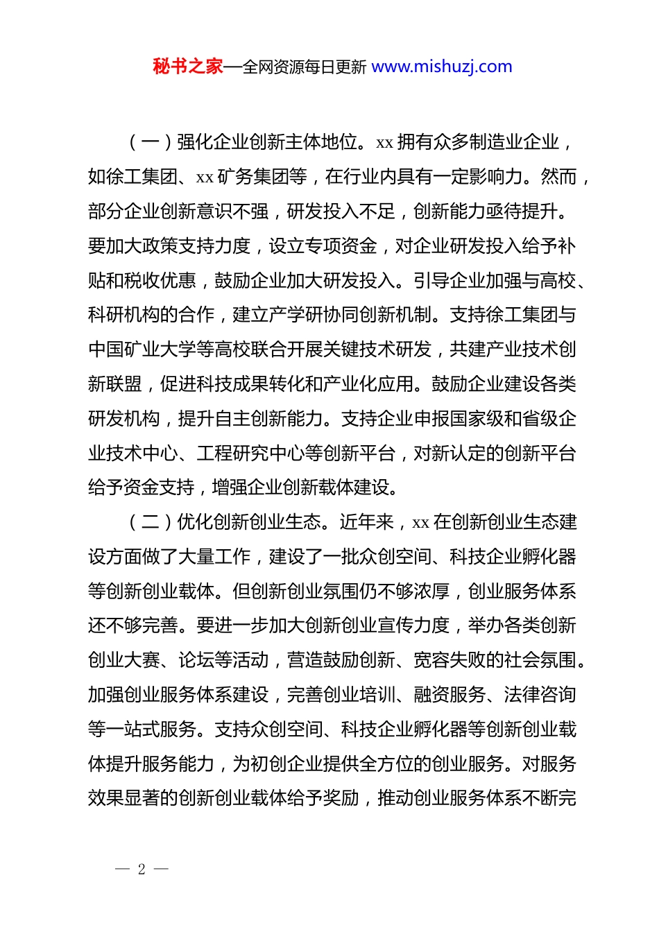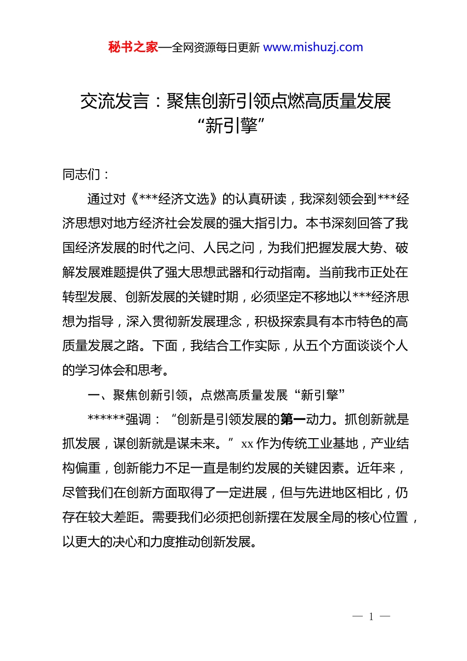秘书之家—全网资源每日更新 www.mishuzj.com交流发言:聚焦创新引领点燃高质量发展“新引擎”同志们:通过对《***经济文选》的认真研读,我深刻领会到***经济思想对地方经济社会发展的强大指引力。本书深刻回答了我国经济发展的时代之问、人民之问,为我们把握发展大势、破解发展难题提供了强大思想武器和行动指南。当前我市正处在转型发展、创新发展的关键时期,必须坚定不移地以***经济思想为指导,深入贯彻新发展理念,积极探索具有本市特色的高质量发展之路。下面,我结合工作实际,从五个方面谈谈个人的学习体会和思考。一、聚焦创新引领,点燃高质量发展“新引擎”******强调:“创新是引领发展的第一动力。抓创新就是抓发展,谋创新就是谋未来。”xx 作为传统工业基地,产业结构偏重,创新能力不足一直是制约发展的关键因素。近年来,尽管我们在创新方面取得了一定进展,但与先进地区相比,仍存在较大差距。需要我们必须把创新摆在发展全局的核心位置,以更大的决心和力度推动创新发展。— 1 —秘书之家—全网资源每日更新 www.mishuzj.com(一)强化企业创新主体地位。xx 拥有众多制造业企业,如徐工集团、xx 矿务集团等,在行业内具有一定影响力。然而,部分企业创新意识不强,研发投入不足,创新能力亟待提升。要加大政策支持力度,设立专项资金,对企业研发投入给予补贴和税收优惠,鼓励企业加大研发投入。引导企业加强与高校、科研机构的合作,建立产学研协同创新机制。支持徐工集团与中国矿业大学等高校联合开展关键技术研发,共建产业技术创新联盟,促进科技成果转化和产业化应用。鼓励企业建设各类研发机构,提升自主创新能力。支持企业申报国家级和省级企业技术中心、工程研究中心等创新平台,对新认定的创新平台给予资金支持,增强企业创新载体建设。(二)优化创新创业生态。近年来,xx 在创新创业生态建设方面做了大量工作,建设了一批众创空间、科技企业孵化器等创新创业载体。但创新创业氛围仍不够浓厚,创业服务体系还不够完善。要进一步加大创新创业宣传力度,举办各类创新创业大赛、论坛等活动,营造鼓励创新、宽容失败的社会氛围。加强创业服务体系建设,完善创业培训、融资服务、法律咨询等一站式服务。支持众创空间、科技企业孵化器等创新创业载体提升服务能力,为初创企业提供全方位的创业服务。对服务效果显著的创新创业载体给予奖励,推动创业服务体系不断完— 2 —秘书之家—全网资源每日更新 www.mishuzj.com善。此外,还要加强知识产权保护,加大对侵权行为的打击力度,维护创新者的合法权益,为创新创业营造良好的法治环境。(三)培育新兴产业集群。xx 在装备与智能制造、新能源、集成电路与 ict、生物医药与大健康等战略性新兴产业方面已具备一定基础,但产业规模较小,产业链不够完善。要明确产业发展重点,制定新兴产业发展规划,加大政策扶持力度。设立新兴产业发展基金,重点支持新兴产业项目建设和企业发展,对符合产业发展方向的重大新兴产业项目,给予土地、资金、税收等方面的优惠政策,吸引优质项目落地。加强产业链招商,围绕新兴产业产业链关键环节,引进一批具有核心竞争力的企业和项目,完善产业链条。支持本地企业开展技术改造和产品升级,推动传统产业向新兴产业转型,培育壮大新兴产业集群。二、着眼协调共进,绘就均衡发展“新画卷”******指出:“协调发展注重的是解决发展不平衡问题。”当前,xx 城乡发展差距仍然存在,区域发展不够均衡,产业结构有待优化。我们必须牢固树立协调发展理念,着力解决发展不平衡不充分问题,推动经济社会协调发展。(一)促进城乡融合发展。xx 是农业大市,农村人口众多,城乡发展不平衡问题较为突出。为促进城乡融合发展,我们要加大对农村基础设施建设的投入,改善农村生产生活条件。加— 3 —秘书之家—全网资源每日更新 www.mishuzj.com强农村道路、水利、电力、通信等基础设施建设,实施农村公路提档升级工程,提高农村公路通行能力,推动城乡基础设施互联互通。推进城乡基本公共服务均等化,提高农村教育、医疗、文化等公共服务水平。加大对农村教育的投入,改善...
