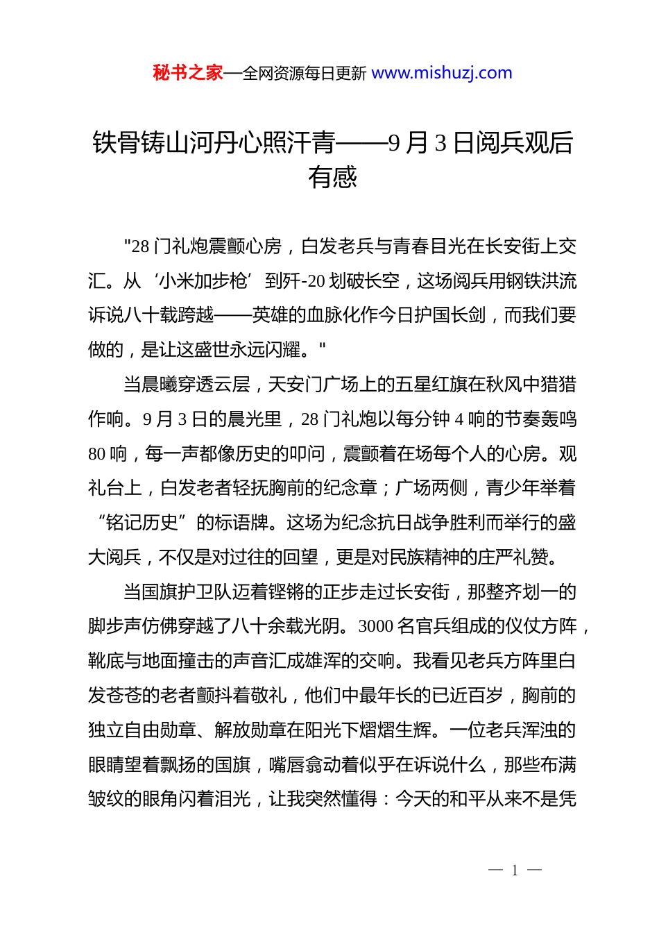 秘书之家—全网资源每日更新 www.mishuzj.com铁骨铸山河丹心照汗青——9 月 3 日阅兵观后有感"28 门礼炮震颤心房,白发老兵与青春目光在长安街上交汇。从‘小米加步枪’到歼-20 划破长空,这场阅兵用钢铁洪流诉说八十载跨越——英雄的血脉化作今日护国长剑,而我们要做的,是让这盛世永远闪耀。"当晨曦穿透云层,天安门广场上的五星红旗在秋风中猎猎作响。9 月 3 日的晨光里,28 门礼炮以每分钟 4 响的节奏轰鸣80 响,每一声都像历史的叩问,震颤着在场每个人的心房。观礼台上,白发老者轻抚胸前的纪念章;广场两侧,青少年举着“铭记历史”的标语牌。这场为纪念抗日战争胜利而举行的盛大阅兵,不仅是对过往的回望,更是对民族精神的庄严礼赞。当国旗护卫队迈着铿锵的正步走过长安街,那整齐划一的脚步声仿佛穿越了八十余载光阴。3000 名官兵组成的仪仗方阵,靴底与地面撞击的声音汇成雄浑的交响。我看见老兵方阵里白发苍苍的老者颤抖着敬礼,他们中最年长的已近百岁,胸前的独立自由勋章、解放勋章在阳光下熠熠生辉。一位老兵浑浊的眼睛望着飘扬的国旗,嘴唇翕动着似乎在诉说什么,那些布满皱纹的眼角闪着泪光,让我突然懂得:今天的和平从来不是凭— 1 —秘书之家—全网资源每日更新 www.mishuzj.com空而来,而是无数先烈用血肉之躯在枪林弹雨中筑起的长城。分列式行进中,受阅将士的钢枪在阳光下泛着冷冽的光,徒步方阵如移动的长城般气势恢宏。“平型关大战突击连”“百团大战白刃格斗英雄连”“狼牙山五壮士连”……一面面荣誉旗帜通过主席台时,历史的画卷在眼前徐徐展开。太行山下的伏击战、黄河岸边的阻击战、长城内外的游击战,那些在硝烟中冲锋的身影,与今日英姿勃发的官兵重叠在一起,构成跨越时空的精神传承。铁甲洪流中,国产新型主战坦克以箭形编队驶过,洲际弹道导弹在牵引车牵引下缓缓前行,钢铁巨阵的轰鸣里,我听见了一个民族从积贫积弱到富强振兴的铿锵足音——从缴获的“万国牌”武器到自主研发的大国重器,八十余年的跨越在长安街上铺成壮丽的轨迹。空中梯队呼啸而过时,拉出的七彩烟带在湛蓝的天空中勾勒出绚丽的弧线。歼-20 战机编队以“人”字形掠过广场上空,发动机的轰鸣震得空气微微颤抖。这一刻,广场上响起的欢呼声浪让人心潮澎湃。我想起 80 多年前,我们的军队曾用“小米加步枪”对抗侵略者的飞机大炮,飞行员甚至要驾着老式战机撞向敌机;而今天,隐形战机、预警机、加油机组成的空中梯队,昭示着一支战略空军的崛起。大国重器列阵长空,护佑着九百六十万平方公里的山河无恙,这种今昔对比的震撼,让— 2 —秘书之家—全网资源每日更新 www.mishuzj.com“民族复兴”四个字不再是抽象的概念,而成为看得见、摸得着的现实图景。最让我动容的是群众游行中的“致敬方阵”,青少年手捧黄色菊花向老兵致敬,两代人的目光在时空交汇。白发与黑发的对视里,有岁月的流转,更有精神的传承。紧随其后的“众志成城”方阵中,各行各业的建设者举着“强军梦”“中国梦”的标语牌,展现着新时代的精神风貌。当《歌唱祖国》的旋律响起,全场自发合唱的声音汇聚成澎湃的洪流,我忽然明白:阅兵展示的不仅是威武之师的实力,更是一个民族不忘来路、砥砺前行的精神密码。礼炮余音渐息,国旗在风中舒展。这场盛大的阅兵,是对历史的深刻铭记,是对和平的庄严宣誓,更是对未来的坚定昭示。作为新时代的见证者,我们既要仰望先辈用鲜血染红的旗帜,更要接过他们手中的接力棒。当夕阳为广场镀上金边,我望着缓缓降下的国旗暗下决心:要用奋斗的姿态守护这盛世中华,让英雄的精神在岁月长河中永远闪耀,让和平的光芒照亮民族复兴的征程。— 3 —