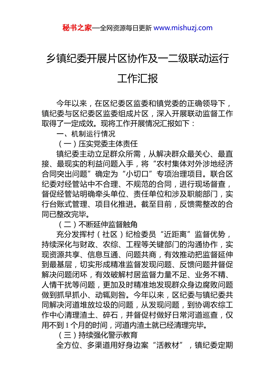 秘书之家—全网资源每日更新 www.mishuzj.com乡镇纪委开展片区协作及一二级联动运行工作汇报今年以来,在区纪委区监委和镇党委的正确领导下,镇纪委与区纪委区监委组成片区,深入开展联动监督工作取得了一定成效。现将工作开展情况汇报如下:一、机制运行情况(一)压实党委主体责任镇纪委主动立足群众所需,从解决群众最关心、最直接、最现实的利益问题入手,将“农村集体对外涉地经济合同突出问题”确定为“小切口”专项治理项目。联合区纪委对经管站中不合理、不规范的合同,进行现场督查,督促经管站明确牵头单位、责任单位和涉及职能部门,实行台账式管理、项目化推进。截至目前,反馈需整改的合同已整改完毕。(二)不断延伸监督触角充分发挥村(社区)纪检委员“近距离”监督优势,持续深化与财政、农综、工程等关键部门的沟通协作,实现资源共享、信息互通、问题共商,有效推动把监督延伸到最基层,切实形成精准监督发现问题、反馈问题并督促解决问题闭环,有效破解村居监督力量不足、业务不精、人情干扰等问题,更加及时精准地发现群众身边腐败问题做到抓早抓小、动辄则咎。今年以来,区纪委与镇纪委共同解决河道堆放垃圾的问题,从发现问题,到协调农综工作中心清理渣土、碎石,并督促村做好日常河道巡查,仅用不到 1 个月的时间,河道内渣土就已经清理完毕。(三)持续强化警示教育全方位、多渠道用好身边案“活教材”,镇纪委定期秘书之家—全网资源每日更新 www.mishuzj.com分类通报全市因受刑事处罚、行政处罚,被处分的监察对象,用“案中人”警醒“身边人”。重点聚焦工程建设领域廉政风险,通过组织镇域内在建工程项目负责人观看警示教育片、通报典型案例、深入施工现场面对面提醒等方式,督促建设廉洁工程。在区纪委指导下,积极开展工程建设项目备案监督工作,及时组织相关业务科室、各村居纪检委员就如何填报备案表开展培训。每季度按时向区纪委报送相关情况,截至目前,已备案 4 项工程建设项目。(四)驰而不息正风肃纪始终保持高压态势,严肃查处各类违纪违法问题。今年以来,镇纪委共受理信访举报[X]件,立案[X]件,给予党纪政务处分[X]人,移送司法机关[X]人。同时,注重抓早抓小,运用“第一种形态”处理[X]人次,切实将问题解决在萌芽状态。二、工作成效(一)问题解决效率显著提高通过片区协作及一二级联动机制,实现了监督力量的整合与优化,有效解决了以往监督工作中存在的力量分散协调不畅等问题。如在河道垃圾清理问题上,区纪委与镇纪委协同作战,仅用不到 1 个月的时间就完成了清理工作,大大提高了问题解决效率。(二)基层监督效能大幅提升村(社区)纪检委员“近距离”监督优势得到充分发挥,与财政、农综、工程等关键部门的沟通协作更加紧密实现了资源共享、信息互通、问题共商,有效破解了村居监督力量不足、业务不精、人情干扰等问题,基层监督效能大幅提升。(三)廉政风险防控更加有力通过持续强化警示教育,全方位、多渠道用好身边案“活教材”,切实增强了党员干部的廉洁自律意识。同时积极开展工程建设项目备案监督工作,及时组织相关业务秘书之家—全网资源每日更新 www.mishuzj.com科室、各村居纪检委员开展培训,每季度按时向区纪委报送相关情况,有效防范了工程建设领域的廉政风险。三、存在问题(一)监督力量仍需进一步加强虽然通过片区协作及一二级联动机制,整合了监督力量,但在面对一些复杂问题时,仍存在力量不足的情况。特别是在一些专业性强的领域,如工程建设、财政资金管理等,缺乏专业的监督人员和技术支持,影响了监督效果。(二)监督机制仍需进一步完善在实际工作中,虽然已经建立了一些监督机制,但在具体操作过程中,仍存在一些漏洞和不足。如在监督发现问题的整改落实环节,缺乏有效的跟踪问效机制,导致部分问题整改不到位,影响了监督工作的权威性和严肃性。(三)基层监督能力仍需进一步提升部分村(社区)纪检委员业务能力不足,对监督工作的认识不够深刻,存在不敢监督、不会监督的问题。同时由于人情干扰等因素的影响,基层监督的独立性和公正性也受到一定影响。四、下一步工作打算(一)加强...