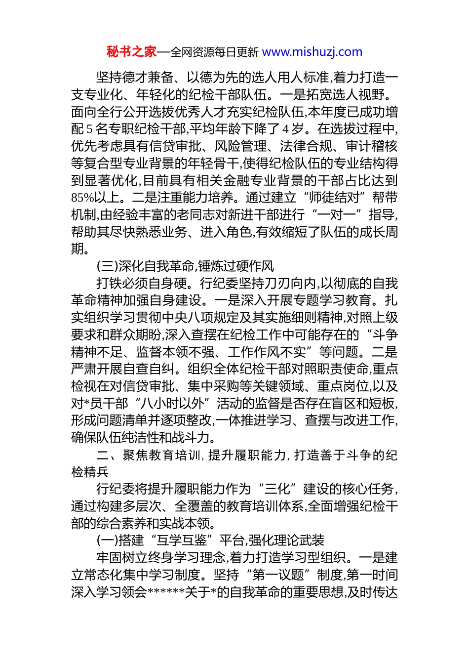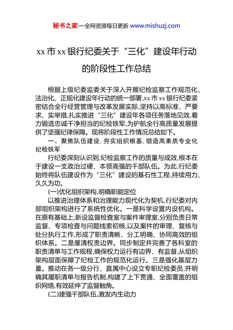 秘书之家—全网资源每日更新 www.mishuzj.comxx 市 xx 银行纪委关于“三化”建设年行动的阶段性工作总结根据上级纪委监委关于深入开展纪检监察工作规范化、法治化、正规化建设年行动的统一部署,xx 市 xx 银行纪委紧密结合全行经营管理与改革发展实际,坚持以高标准、严要求、实举措,扎实推进“三化”建设年各项任务落地见效,着力锻造忠诚干净担当的纪检铁军,为护航全行高质量发展提供了坚强纪律保障。现将阶段性工作情况总结如下。一、聚焦队伍建设,夯实组织根基,锻造高素质专业化纪检铁军行纪委深刻认识到,纪检监察工作的质量与成效,根本在于建设一支政治过硬、本领高强的干部队伍。为此,行纪委始终将队伍建设作为“三化”建设的基石性工程,持续用力、久久为功。(一)优化组织架构,明确职能定位以推进治理体系和治理能力现代化为契机,行纪委对内部组织架构进行了系统性优化。一是科学设置内设机构。在原有基础上,新设监督检查室与案件审理室,分别负责日常监督、专项检查与问题线索初核,以及案件的审理、复核与处分执行工作,形成了职责清晰、分工明确、协同高效的组织体系。二是厘清权责边界。同步制定并完善了各科室的职责清单与工作规程,确保权力运行有边界、有监督,从组织架构层面保障了纪检工作的规范化运行。三是强化基层力量。推动在各一级分行、直属中心设立专职纪检委员,并明确其履职清单与报告机制,构建了上下贯通、全面覆盖的组织网络,有效延伸了监督触角。(二)建强干部队伍,激发内生动力秘书之家—全网资源每日更新 www.mishuzj.com坚持德才兼备、以德为先的选人用人标准,着力打造一支专业化、年轻化的纪检干部队伍。一是拓宽选人视野。面向全行公开选拔优秀人才充实纪检队伍,本年度已成功增配 5 名专职纪检干部,平均年龄下降了 4 岁。在选拔过程中,优先考虑具有信贷审批、风险管理、法律合规、审计稽核等复合型专业背景的年轻骨干,使得纪检队伍的专业结构得到显著优化,目前具有相关金融专业背景的干部占比达到85%以上。二是注重能力培养。通过建立“师徒结对”帮带机制,由经验丰富的老同志对新进干部进行“一对一”指导,帮助其尽快熟悉业务、进入角色,有效缩短了队伍的成长周期。(三)深化自我革命,锤炼过硬作风打铁必须自身硬。行纪委坚持刀刃向内,以彻底的自我革命精神加强自身建设。一是深入开展专题学习教育。扎实组织学习贯彻中央八项规定及其实施细则精神,对照上级要求和群众期盼,深入查摆在纪检工作中可能存在的“斗争精神不足、监督本领不强、工作作风不实”等问题。二是严肃开展自查自纠。组织全体纪检干部对照职责使命,重点检视在对信贷审批、集中采购等关键领域、重点岗位,以及对*员干部“八小时以外”活动的监督是否存在盲区和短板,形成问题清单并逐项整改,一体推进学习、查摆与改进工作,确保队伍纯洁性和战斗力。二、聚焦教育培训,提升履职能力,打造善于斗争的纪检精兵行纪委将提升履职能力作为“三化”建设的核心任务,通过构建多层次、全覆盖的教育培训体系,全面增强纪检干部的综合素养和实战本领。(一)搭建“互学互鉴”平台,强化理论武装牢固树立终身学习理念,着力打造学习型组织。一是建立常态化集中学习制度。坚持“第一议题”制度,第一时间深入学习领会******关于*的自我革命的重要思想,及时传达秘书之家—全网资源每日更新 www.mishuzj.com贯彻中央纪委及上级纪委监委全会精神。年内已组织集中学习 24 次,专题研讨 6 次。二是坚持问题导向按需施教。紧密围绕日常监督执纪工作中的重点难点,秉持“干什么就学什么、缺什么就补什么”的原则,定期组织学习*内法规、金融监管政策和相关法律知识,推动理论学习与业务实践深度融合,有效提升了纪检干部运用法治思维和法治方式解决问题的能力。(二)创新“跟案实训”模式,锤炼实战本领注重在干中学、在战中练,积极探索实战化练兵模式。一是参与上级专案。主动争取机会,选派 2 名年轻纪检骨干全程参与了上级纪委监委组织的重要专案查办工作,使其在复杂案件的突破、证据的固定、笔录的制作等方面得到了系统性锻炼。二是融入内部监督。安排纪检干部深度参与行内组织的年度信贷专项巡察、内控合规...