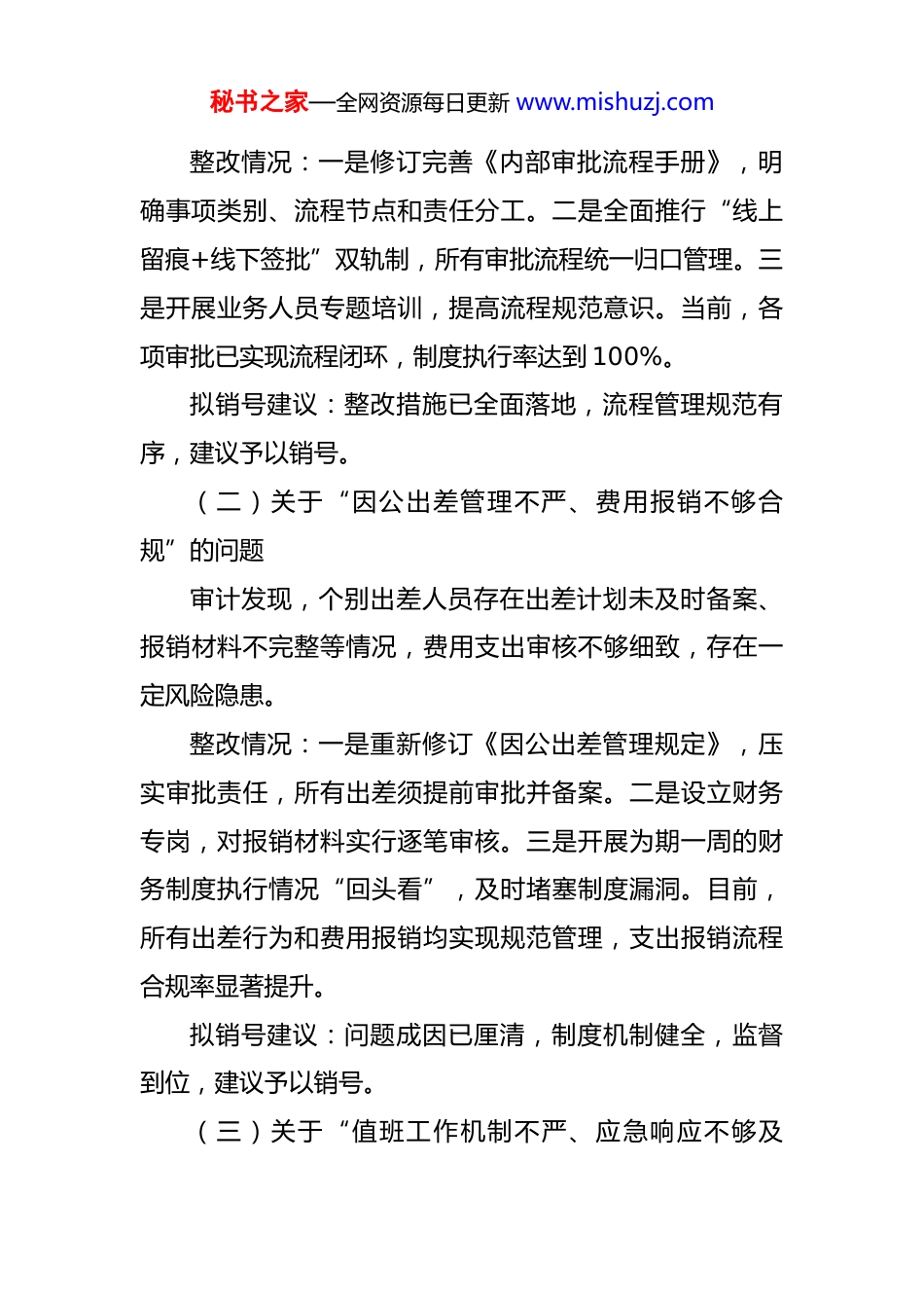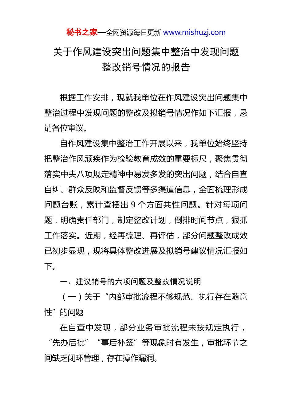 秘书之家—全网资源每日更新 www.mishuzj.com关于作风建设突出问题集中整治中发现问题整改销号情况的报告 根据工作安排,现就我单位在作风建设突出问题集中整治过程中发现问题的整改及拟销号情况作如下汇报,恳请各位审议。自作风建设集中整治工作开展以来,我单位始终坚持把整治作风顽疾作为检验教育成效的重要标尺,聚焦贯彻落实中央八项规定精神中易发多发的突出问题,结合自查自纠、群众反映和监督反馈等多渠道信息,全面梳理形成问题台账,累计查摆出 9 个方面共性问题。针对每项问题,明确责任部门,制定整改计划,倒排时间节点,狠抓工作落实。近期,经再梳理、再评估,部分问题整改成效已初步显现,现将具体整改进展及拟销号建议情况汇报如下。一、建议销号的六项问题及整改情况说明(一)关于“内部审批流程不够规范、执行存在随意性”的问题在自查中发现,部分业务审批流程未按规定执行,“先办后批”“事后补签”等现象时有发生,审批环节之间缺乏闭环管理,存在操作漏洞。秘书之家—全网资源每日更新 www.mishuzj.com整改情况:一是修订完善《内部审批流程手册》,明确事项类别、流程节点和责任分工。二是全面推行“线上留痕+线下签批”双轨制,所有审批流程统一归口管理。三是开展业务人员专题培训,提高流程规范意识。当前,各项审批已实现流程闭环,制度执行率达到 100%。拟销号建议:整改措施已全面落地,流程管理规范有序,建议予以销号。(二)关于“因公出差管理不严、费用报销不够合规”的问题审计发现,个别出差人员存在出差计划未及时备案、报销材料不完整等情况,费用支出审核不够细致,存在一定风险隐患。整改情况:一是重新修订《因公出差管理规定》,压实审批责任,所有出差须提前审批并备案。二是设立财务专岗,对报销材料实行逐笔审核。三是开展为期一周的财务制度执行情况“回头看”,及时堵塞制度漏洞。目前,所有出差行为和费用报销均实现规范管理,支出报销流程合规率显著提升。拟销号建议:问题成因已厘清,制度机制健全,监督到位,建议予以销号。(三)关于“值班工作机制不严、应急响应不够及秘书之家—全网资源每日更新 www.mishuzj.com时”的问题在日常检查和突发事项处理中发现,个别工作日值班存在脱岗、替岗未备案等情况,节假日应急响应机制不畅,值班记录不规范,存在“人在岗、责不明”的风险隐患。整改情况:一是修订完善《值班工作管理制度》,明确值班人员职责、交接程序及请假替岗流程,实行“谁值班、谁负责”。二是推行值班日报制度,确保各项情况有据可查、责任可追。三是建立应急响应快速联动机制,明确各类突发事件的首报程序、响应时限和处置流程。四是开展不定期抽查,严肃处理值班纪律问题。今年以来,未再发生值班脱岗或响应迟缓情况。拟销号建议:目前值班工作安排规范有序,应急体系运转高效,整改目标已基本实现,建议予以销号。(四)关于“文件审批中层层转签、传递时间过长”的问题部分材料审批涉及部门较多、流程节点不清晰,出现“文件流转周期长”“催办频次高”等问题,影响办事效率。整改情况:一是整合文件流转路径,优化签批顺序,减少无效环节。二是建设电子流转平台,设立办理时限提秘书之家—全网资源每日更新 www.mishuzj.com示机制。三是加强流程节点督办,推动“限时办结、闭环管理”。目前,内部文件流转效率明显提高,材料平均审批时间压缩 30%以上。拟销号建议:流程已重构,效率显著提升,问题基本解决,建议予以销号。(五)关于“专项工作推进留痕化倾向明显、实际成效不够突出”的问题部分专项任务在落实中存在“重台账、轻实效”现象,材料痕迹较多、实际推进不足,存在以形式代替实质的问题。整改情况:一是建立“实绩台账”制度,以任务完成质效为主要考评依据。二是开展专项工作实地抽查,对照计划查效果、看落实。三是完善任务督办机制,实行“问题清单+销号管理”。目前,专项工作材料与推进实际更加一致,务实导向逐步树立。拟销号建议:形式主义倾向已有效遏制,任务管理机制健全,建议予以销号。(六)关于“干部日常管理存在宽松软现象、考勤制度落实不到位”的问题个别干...