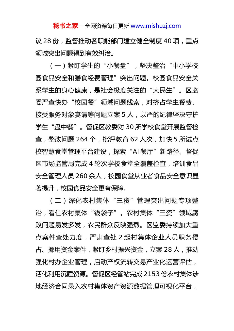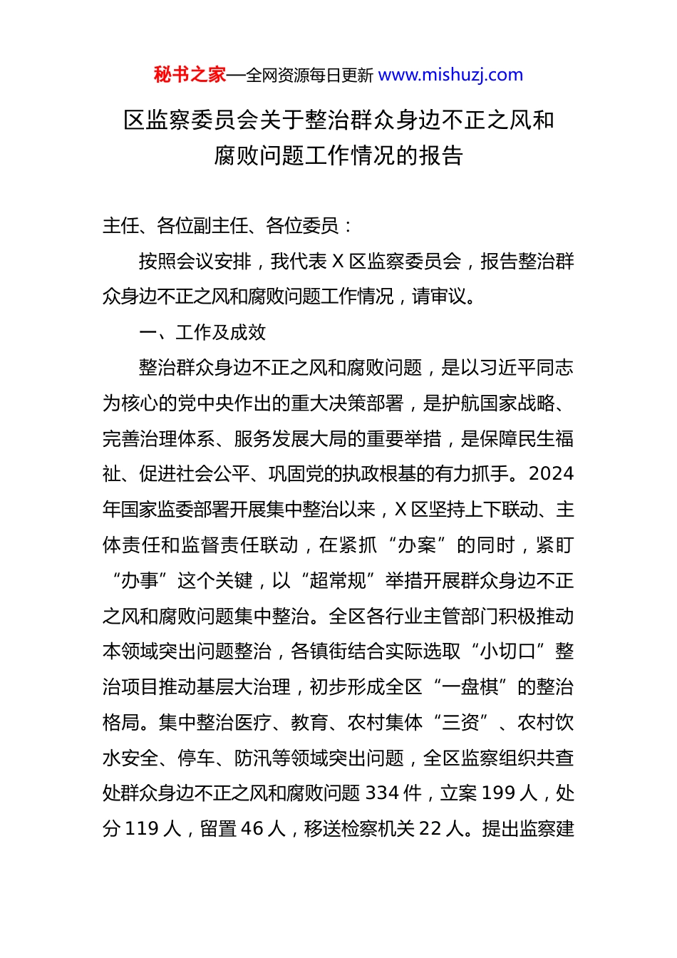 秘书之家—全网资源每日更新 www.mishuzj.com区监察委员会关于整治群众身边不正之风和腐败问题工作情况的报告 主任、各位副主任、各位委员:按照会议安排,我代表 X 区监察委员会,报告整治群众身边不正之风和腐败问题工作情况,请审议。一、工作及成效整治群众身边不正之风和腐败问题,是以习近平同志为核心的党中央作出的重大决策部署,是护航国家战略、完善治理体系、服务发展大局的重要举措,是保障民生福祉、促进社会公平、巩固党的执政根基的有力抓手。2024年国家监委部署开展集中整治以来,X 区坚持上下联动、主体责任和监督责任联动,在紧抓“办案”的同时,紧盯“办事”这个关键,以“超常规”举措开展群众身边不正之风和腐败问题集中整治。全区各行业主管部门积极推动本领域突出问题整治,各镇街结合实际选取“小切口”整治项目推动基层大治理,初步形成全区“一盘棋”的整治格局。集中整治医疗、教育、农村集体“三资”、农村饮水安全、停车、防汛等领域突出问题,全区监察组织共查处群众身边不正之风和腐败问题 334 件,立案 199 人,处分 119 人,留置 46 人,移送检察机关 22 人。提出监察建秘书之家—全网资源每日更新 www.mishuzj.com议 28 份,监督推动各职能部门建立健全制度 40 项,重点领域突出问题得到有效纠治。(一)紧盯学生的“小餐盘”,坚决整治“中小学校园食品安全和膳食经费管理”突出问题。校园食品安全关系学生的身心健康,是社会极度关注的“大民生”。区监委严查快办“校园餐”领域问题线索,对挤占学生餐费、接受服务对象宴请等问题立案 5 人,以严的纪律坚决守护学生“盘中餐”。督促区教委对 30 所学校食堂开展监督检查,整改问题 264 个,批评教育 62 人次,加快 5 所试点校智慧食堂管理平台建设,探索“AI 餐厅”新路径。督促区市场监管局完成 4 轮次学校食堂全覆盖检查,培训食品安全管理人员 260 余人,校园食堂从业者食品安全意识显著提升,校园食品安全更有保障。(二)深化农村集体“三资”管理突出问题专项整治,看住农村集体“钱袋子”。农村集体“三资”领域腐败问题易发多发,农民群众反映强烈。区监委持续加大重点案件查处力度,严肃查处 2 起村集体企业人员职务侵占、挪用资金案件,紧盯乡村振兴资金,立案 28 人,推动强化村办企业管理,启动产权流转交易产业化运营评估,活化利用沉睡资源。督促区经管站完成 2153 份农村集体涉地经济合同录入农村集体资产资源数据管理可视化平台,秘书之家—全网资源每日更新 www.mishuzj.com梳理期限超 70 年合同 133 份,整改欠款合同 34 份,清理到期合同 300 份。共收回农村集体土地 5200 余亩,房屋6000 余平米,欠款 580 余万元,初步完成整改一批、规范一批、清理一批的目标。(三)持续开展“药品、医用耗材采购及管理”专项治理,守护人民群众“救命钱”。医药领域突出问题关系群众生命健康,社会高度关注。区监委监督区市场监管局办理非法收购药品案 3 件,查处药品、医用耗材采购及管理领域腐败和作风问题 3 个,批评教育和处理处分 6 人次,挽回经济损失 4 万余元。督促区医保局聚焦医保就医管理问题开展自查,追回欺诈骗保资金 111.37 万元。开展健康讲座 13 场、大型义诊活动 46 场,受益群众 3681 人次,获得人民群众广泛好评。(四)深入抓好“为基层减负”专项治理,为基层干部“松绑”。形式主义、官僚主义问题,群众极为反感,干部深受其累,严重影响干事创业积极性。区监委对“控制发文数量成效不明显”等 5 个方面 8 个问题跟进监督,推动整改。2024 年,召开全区性会议同比减少 19.6%。印发全区性文件同比减少 14.4%,进一步规范干部借调工作,全区“为基层减负”氛围初步形成,活力逐步释放。(五)紧盯“灾后恢复重建”强化监督,推动涉灾工秘书之家—全网资源每日更新 www.mishuzj.com程项目稳步推进。海河“23·7”流域性特大洪水灾害发生后,我区按照“一年基本恢复、三年全面提升、长远高质量发展”总体思路,全面推进“灾后恢复重建”。区监委督促区发改委强化统筹调度,全...