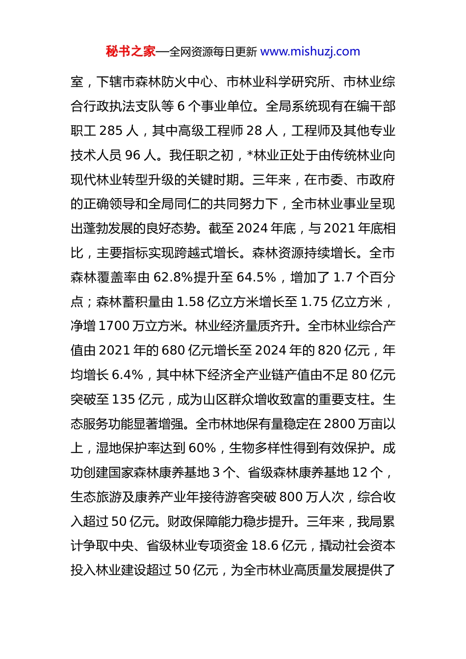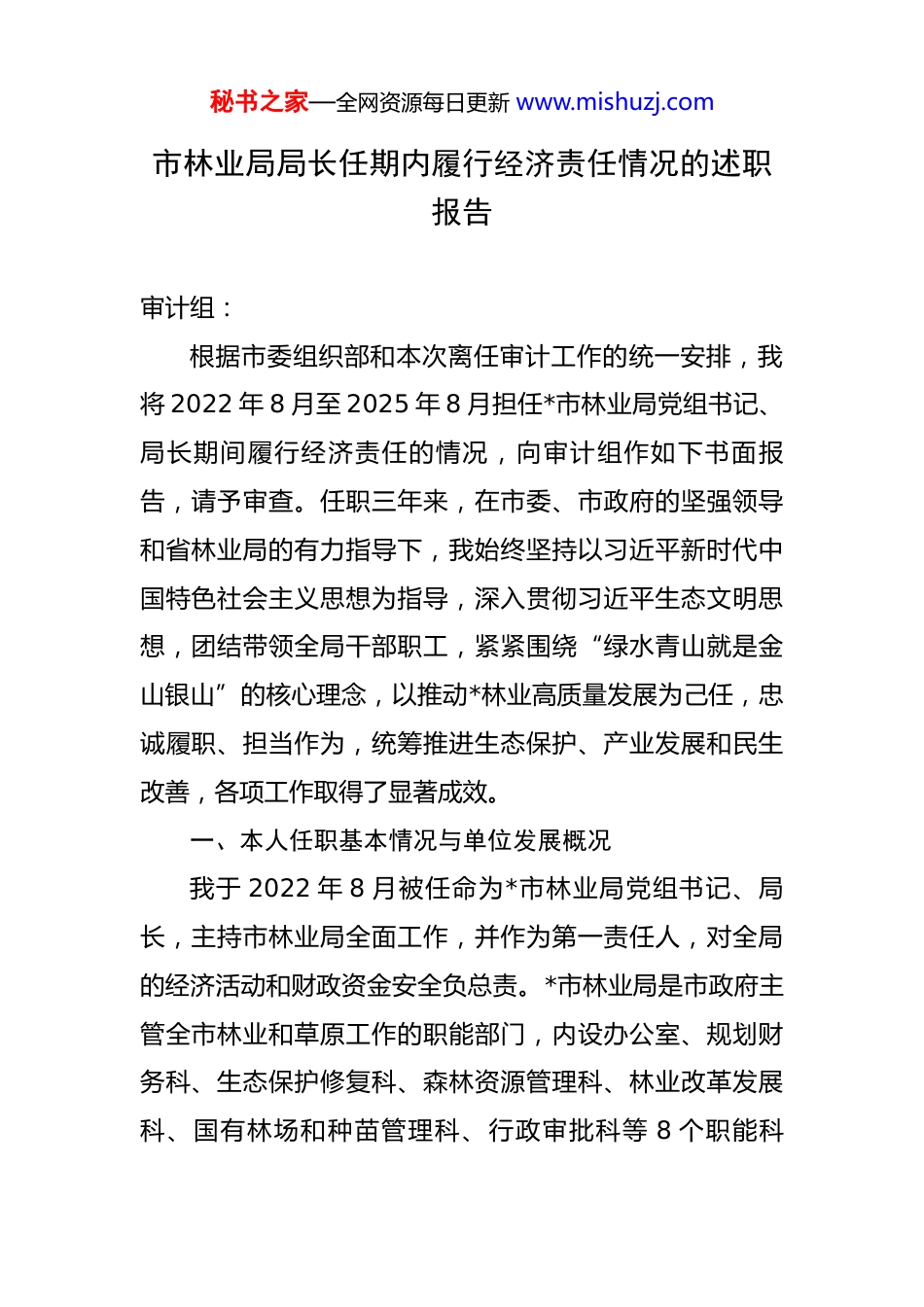 秘书之家—全网资源每日更新 www.mishuzj.com市林业局局长任期内履行经济责任情况的述职报告 审计组:根据市委组织部和本次离任审计工作的统一安排,我将 2022 年 8 月至 2025 年 8 月担任*市林业局党组书记、局长期间履行经济责任的情况,向审计组作如下书面报告,请予审查。任职三年来,在市委、市政府的坚强领导和省林业局的有力指导下,我始终坚持以习近平新时代中国特色社会主义思想为指导,深入贯彻习近平生态文明思想,团结带领全局干部职工,紧紧围绕“绿水青山就是金山银山”的核心理念,以推动*林业高质量发展为己任,忠诚履职、担当作为,统筹推进生态保护、产业发展和民生改善,各项工作取得了显著成效。一、本人任职基本情况与单位发展概况我于 2022 年 8 月被任命为*市林业局党组书记、局长,主持市林业局全面工作,并作为第一责任人,对全局的经济活动和财政资金安全负总责。*市林业局是市政府主管全市林业和草原工作的职能部门,内设办公室、规划财务科、生态保护修复科、森林资源管理科、林业改革发展科、国有林场和种苗管理科、行政审批科等 8 个职能科秘书之家—全网资源每日更新 www.mishuzj.com室,下辖市森林防火中心、市林业科学研究所、市林业综合行政执法支队等 6 个事业单位。全局系统现有在编干部职工 285 人,其中高级工程师 28 人,工程师及其他专业技术人员 96 人。我任职之初,*林业正处于由传统林业向现代林业转型升级的关键时期。三年来,在市委、市政府的正确领导和全局同仁的共同努力下,全市林业事业呈现出蓬勃发展的良好态势。截至 2024 年底,与 2021 年底相比,主要指标实现跨越式增长。森林资源持续增长。全市森林覆盖率由 62.8%提升至 64.5%,增加了 1.7 个百分点;森林蓄积量由 1.58 亿立方米增长至 1.75 亿立方米,净增 1700 万立方米。林业经济量质齐升。全市林业综合产值由 2021 年的 680 亿元增长至 2024 年的 820 亿元,年均增长 6.4%,其中林下经济全产业链产值由不足 80 亿元突破至 135 亿元,成为山区群众增收致富的重要支柱。生态服务功能显著增强。全市林地保有量稳定在 2800 万亩以上,湿地保护率达到 60%,生物多样性得到有效保护。成功创建国家森林康养基地 3 个、省级森林康养基地 12 个,生态旅游及康养产业年接待游客突破 800 万人次,综合收入超过 50 亿元。财政保障能力稳步提升。三年来,我局累计争取中央、省级林业专项资金 18.6 亿元,撬动社会资本投入林业建设超过 50 亿元,为全市林业高质量发展提供了秘书之家—全网资源每日更新 www.mishuzj.com坚实的资金保障。二、贯彻执行党和国家经济方针政策和决策部署情况任职期间,我始终将学习、领会和贯彻执行党中央、国务院和省、市的重大经济方针政策作为首要政治任务和工作遵循,确保政令畅通、令行禁止,推动各项决策部署在*林业系统落地生根、开花结果。(一)坚定不移贯彻“两山”理念,筑牢长江上游生态屏障。我深刻认识到*作为长江上游重要生态屏障的战略地位,始终将生态保护置于最优先位置。一是全面落实“长江大保护”战略部署。针对*地处长江一级支流*河、*流域的实际,我牵头组织编制并实施了《*市长江上游生态屏障建设规划(2023-2030)》。三年来,我们累计投入资金*亿元,重点实施了*河、*流域水土流失综合治理、石漠化治理和森林质量精准提升工程。例如,我们成功申报并实施了总投资达*万元的“*河及*流域外来入侵生物防控体系建设项目”,其中争取中央预算内投资*万元,有效遏制了互花米草等外来物种的扩散,保护了流域生物多样性。二是积极响应国家“双碳”战略目标。我组织全局力量,率先在全省开展林业碳汇资源调查与潜力评估工作。制定了《*市林业碳汇能力提升行动方案》,通过实施大规模国土绿化、森林抚育和退化林修复,三年来累计完成营秘书之家—全网资源每日更新 www.mishuzj.com造林 150 万亩,森林抚育 280 万亩,预计年均新增碳汇量超过 200 万吨。我们还积极探索林业碳汇交易,与数家大型企业达成碳汇购买意向协议,为生态价值的实现开辟了新路径。三是...