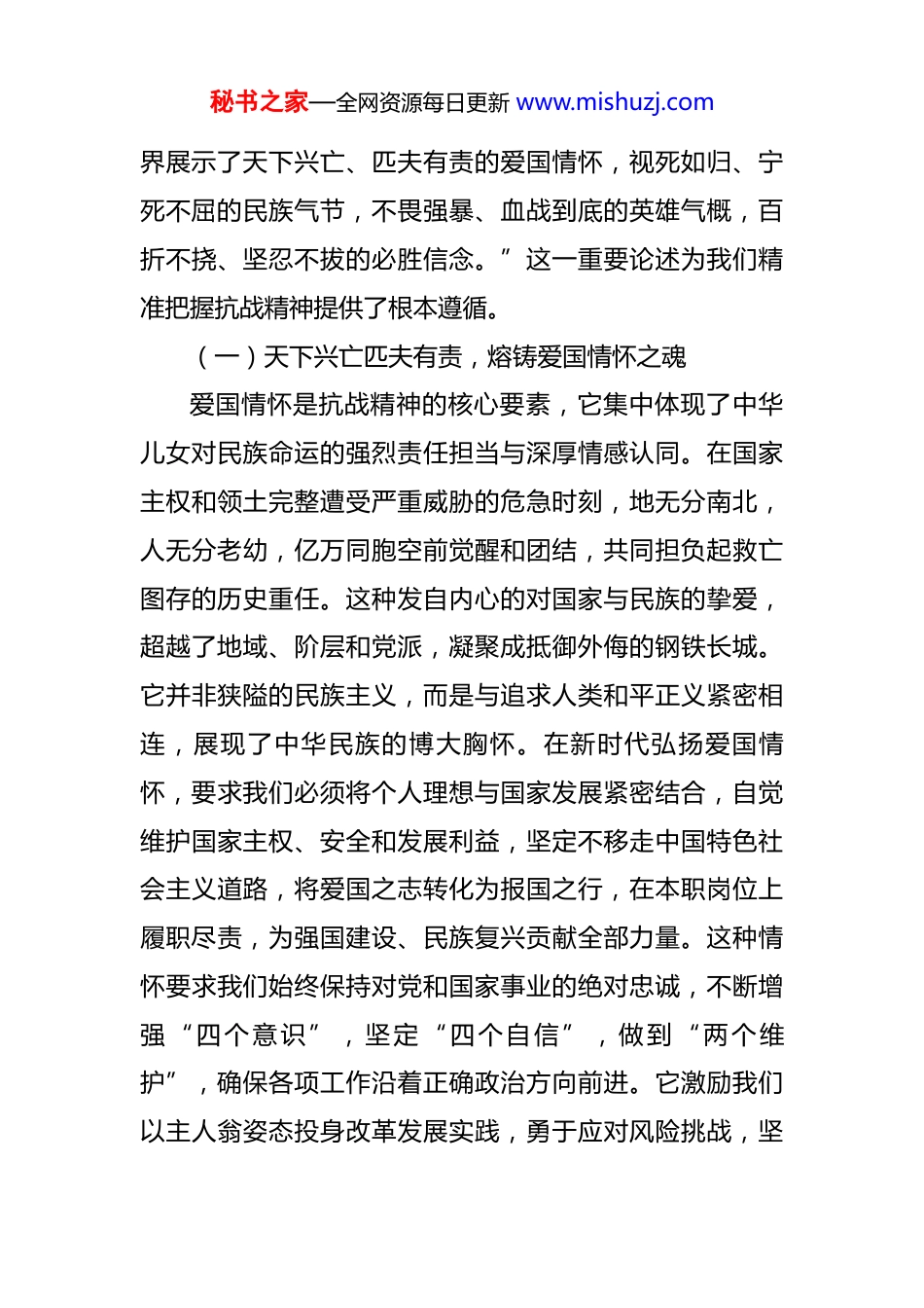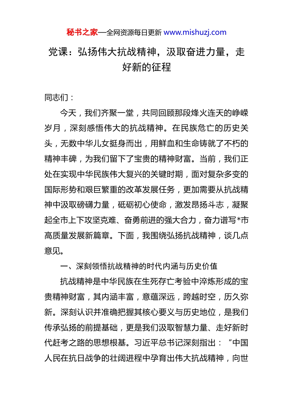 秘书之家—全网资源每日更新 www.mishuzj.com党课:弘扬伟大抗战精神,汲取奋进力量,走好新的征程 同志们:今天,我们齐聚一堂,共同回顾那段烽火连天的峥嵘岁月,深刻感悟伟大的抗战精神。在民族危亡的历史关头,无数中华儿女挺身而出,用鲜血和生命铸就了不朽的精神丰碑,为我们留下了宝贵的精神财富。当前,我们正处在实现中华民族伟大复兴的关键时期,面对复杂多变的国际形势和艰巨繁重的改革发展任务,更加需要从抗战精神中汲取磅礴力量,砥砺初心使命,激发昂扬斗志,凝聚起全市上下攻坚克难、奋勇前进的强大合力,奋力谱写*市高质量发展新篇章。下面,我围绕弘扬抗战精神,谈几点意见。一、深刻领悟抗战精神的时代内涵与历史价值抗战精神是中华民族在生死存亡考验中淬炼形成的宝贵精神财富,其内涵丰富,意蕴深远,跨越时空,历久弥新。深刻认识并准确把握其核心要义与历史地位,是我们传承弘扬的前提基础,更是我们汲取智慧力量、走好新时代赶考之路的思想根基。习近平总书记深刻指出:“中国人民在抗日战争的壮阔进程中孕育出伟大抗战精神,向世秘书之家—全网资源每日更新 www.mishuzj.com界展示了天下兴亡、匹夫有责的爱国情怀,视死如归、宁死不屈的民族气节,不畏强暴、血战到底的英雄气概,百折不挠、坚忍不拔的必胜信念。”这一重要论述为我们精准把握抗战精神提供了根本遵循。(一)天下兴亡匹夫有责,熔铸爱国情怀之魂爱国情怀是抗战精神的核心要素,它集中体现了中华儿女对民族命运的强烈责任担当与深厚情感认同。在国家主权和领土完整遭受严重威胁的危急时刻,地无分南北,人无分老幼,亿万同胞空前觉醒和团结,共同担负起救亡图存的历史重任。这种发自内心的对国家与民族的挚爱,超越了地域、阶层和党派,凝聚成抵御外侮的钢铁长城。它并非狭隘的民族主义,而是与追求人类和平正义紧密相连,展现了中华民族的博大胸怀。在新时代弘扬爱国情怀,要求我们必须将个人理想与国家发展紧密结合,自觉维护国家主权、安全和发展利益,坚定不移走中国特色社会主义道路,将爱国之志转化为报国之行,在本职岗位上履职尽责,为强国建设、民族复兴贡献全部力量。这种情怀要求我们始终保持对党和国家事业的绝对忠诚,不断增强“四个意识”,坚定“四个自信”,做到“两个维护”,确保各项工作沿着正确政治方向前进。它激励我们以主人翁姿态投身改革发展实践,勇于应对风险挑战,坚秘书之家—全网资源每日更新 www.mishuzj.com决捍卫国家核心利益与民族尊严。(二)视死如归宁死不屈,彰显民族气节之魄民族气节是抗战精神的铮铮铁骨,它深刻反映了中华民族固有的尊严与操守,以及在强敌面前绝不低头的顽强意志。面对侵略者的残暴行径和诱降阴谋,广大军民表现出了惊人的意志力,宁可战斗到底,绝不屈服妥协。无数英雄儿女在战场上舍生取义,在刑场上大义凛然,用生命捍卫了民族的尊严与气节。这种气节源于对中华文化的深刻认同与自信,是对民族独立和人民解放事业的坚定信念。它教育我们,在任何困难和压力面前,都要保持崇高的精神追求和独立的人格力量。新时代传承民族气节,就是要坚定文化自信,坚守社会主义核心价值观,在复杂意识形态斗争中保持清醒头脑,坚决抵制各种错误思潮和腐朽文化的侵蚀。要发扬斗争精神,增强斗争本领,在原则问题上寸步不让,在风险挑战面前敢于亮剑,坚决维护国家政治安全和社会稳定,保持共产党人的风骨、气节、胆魄。(三)不畏强暴血战到底,淬炼英雄气概之勇英雄气概是抗战精神的战斗姿态,它生动展现了中国人民压倒一切敌人而不被任何敌人所压倒的英雄主义精神。抗日战争是一场实力对比极其悬殊的战争,但中国人秘书之家—全网资源每日更新 www.mishuzj.com民没有被吓倒,而是奋起反抗,以血肉之躯对抗武装到牙齿的侵略者,进行了艰苦卓绝的持久战。这种气概体现在战略上的持久坚守与战术上的灵活机动,体现在正面战场与敌后战场的相互配合,体现在每一场战役战斗的英勇顽强。它彰显了中华民族不畏强权、敢于斗争、敢于胜利的宝贵品质。在新的历史条件下,弘扬英雄气概,要求我们必须具备迎接挑战、战胜风险的巨大勇气和坚强决心。...