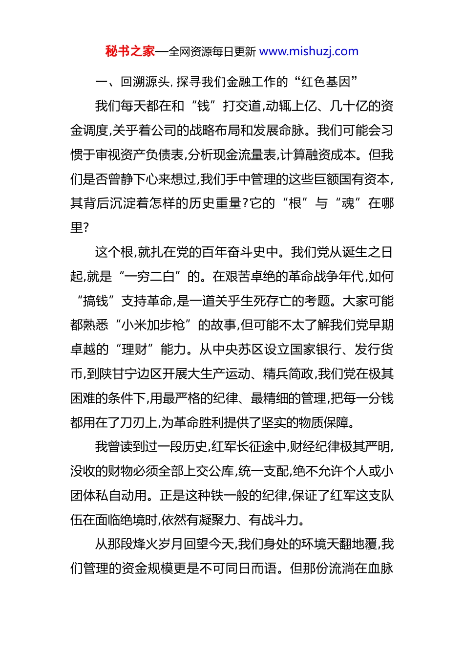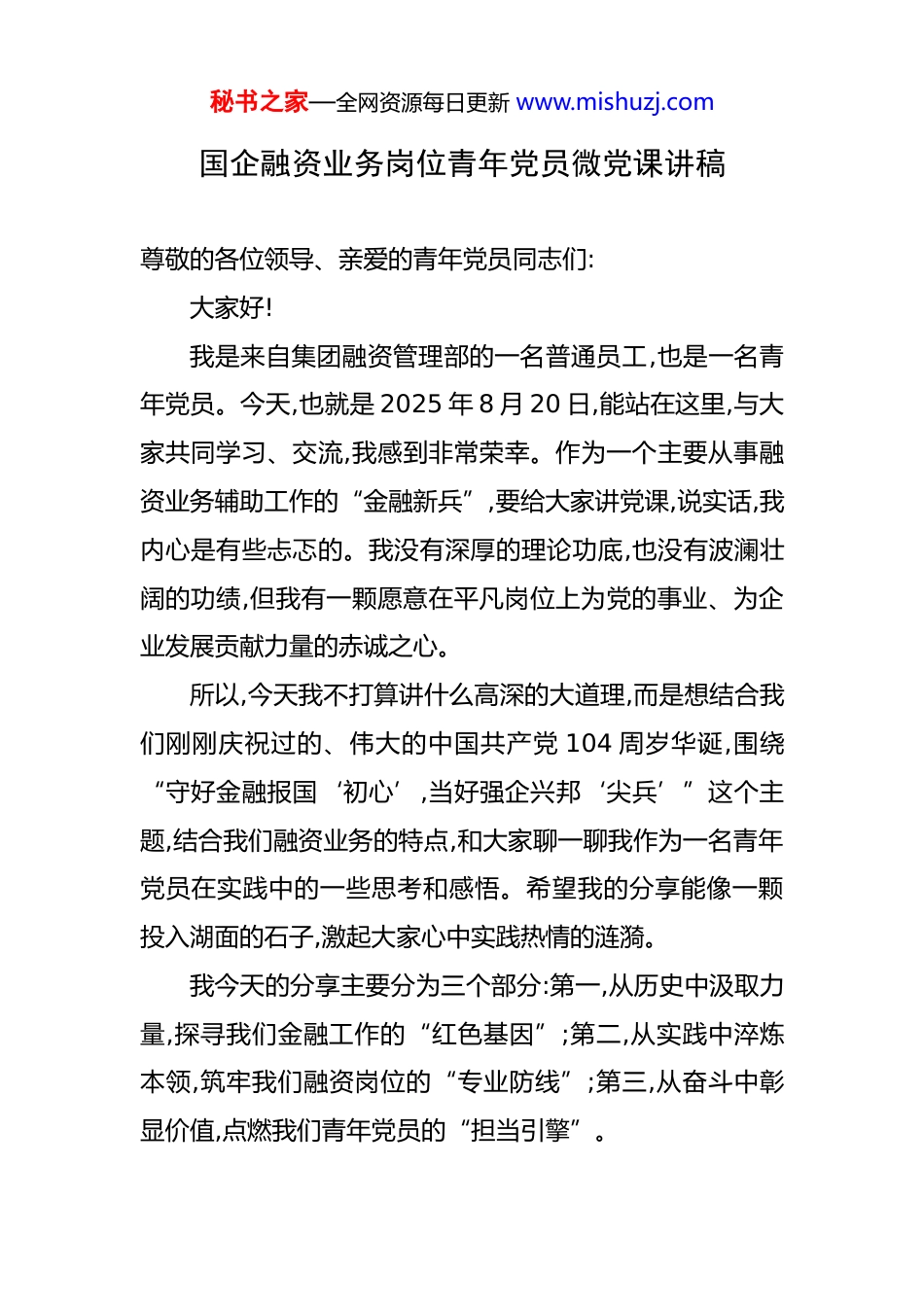 秘书之家—全网资源每日更新 www.mishuzj.com国企融资业务岗位青年党员微党课讲稿 尊敬的各位领导、亲爱的青年党员同志们:大家好!我是来自集团融资管理部的一名普通员工,也是一名青年党员。今天,也就是 2025 年 8 月 20 日,能站在这里,与大家共同学习、交流,我感到非常荣幸。作为一个主要从事融资业务辅助工作的“金融新兵”,要给大家讲党课,说实话,我内心是有些忐忑的。我没有深厚的理论功底,也没有波澜壮阔的功绩,但我有一颗愿意在平凡岗位上为党的事业、为企业发展贡献力量的赤诚之心。所以,今天我不打算讲什么高深的大道理,而是想结合我们刚刚庆祝过的、伟大的中国共产党 104 周岁华诞,围绕“守好金融报国‘初心’,当好强企兴邦‘尖兵’”这个主题,结合我们融资业务的特点,和大家聊一聊我作为一名青年党员在实践中的一些思考和感悟。希望我的分享能像一颗投入湖面的石子,激起大家心中实践热情的涟漪。我今天的分享主要分为三个部分:第一,从历史中汲取力量,探寻我们金融工作的“红色基因”;第二,从实践中淬炼本领,筑牢我们融资岗位的“专业防线”;第三,从奋斗中彰显价值,点燃我们青年党员的“担当引擎”。秘书之家—全网资源每日更新 www.mishuzj.com一、回溯源头,探寻我们金融工作的“红色基因”我们每天都在和“钱”打交道,动辄上亿、几十亿的资金调度,关乎着公司的战略布局和发展命脉。我们可能会习惯于审视资产负债表,分析现金流量表,计算融资成本。但我们是否曾静下心来想过,我们手中管理的这些巨额国有资本,其背后沉淀着怎样的历史重量?它的“根”与“魂”在哪里?这个根,就扎在党的百年奋斗史中。我们党从诞生之日起,就是“一穷二白”的。在艰苦卓绝的革命战争年代,如何“搞钱”支持革命,是一道关乎生死存亡的考题。大家可能都熟悉“小米加步枪”的故事,但可能不太了解我们党早期卓越的“理财”能力。从中央苏区设立国家银行、发行货币,到陕甘宁边区开展大生产运动、精兵简政,我们党在极其困难的条件下,用最严格的纪律、最精细的管理,把每一分钱都用在了刀刃上,为革命胜利提供了坚实的物质保障。我曾读到过一段历史,红军长征途中,财经纪律极其严明,没收的财物必须全部上交公库,统一支配,绝不允许个人或小团体私自动用。正是这种铁一般的纪律,保证了红军这支队伍在面临绝境时,依然有凝聚力、有战斗力。从那段烽火岁月回望今天,我们身处的环境天翻地覆,我们管理的资金规模更是不可同日而语。但那份流淌在血脉秘书之家—全网资源每日更新 www.mishuzj.com中的“红色金融基因”——对党和人民财产高度负责的精神、精打细算的优良作风、令行禁止的铁律意识,不仅没有过时,反而更具现实意义。我们现在经手的每一笔融资,无论是争取银行的低息贷款,还是发行公司的信用债券,本质上都是在为国有资产的保值增值而努力。我们每降低一个基点的融资成本,就是为国家节省了真金白银;我们每优化一个融资方案,就是为公司的重大项目建设增添了动力。我们不是简单的金融从业者,我们是新时代的“红色管家人”,是国有资本的守护者和价值的创造者。认识到这一点,我们才能在面对繁杂的数据和流程时,找到工作的崇高感和使命感。二、立足岗位,筑牢我们融资业务的“专业防线”党的二十大报告和历次中央金融工作会议都强调,金融是国民经济的血脉,金融工作具有鲜明的政治性和人民性。要把防控风险作为金融工作的永恒主题。这段论述,对于我们从事融资业务的同志们来说,可谓是字字千钧。融资业务,看似是“找钱”,但其核心是风险管理。我们部门地处资金密集、权力相对集中的关键领域,是企业抵御金融风险的第一道,也是最重要的一道防线。任何一个环节的疏忽,任何一点作风上的不严不实,都可能酿成巨大的风险敞口。秘书之家—全网资源每日更新 www.mishuzj.com在这里,我想分享一个我亲身经历的小事。去年,我们公司在 XX 地有一个重大的新能源项目急需一笔大额银团贷款。时间紧、任务重,大家都在加班加点地准备材料。在最后的审核阶段,我发现合作方提供的一份关键资产证明文件中,有一个地块的编号和我们前期尽调报告里的记录有细微的出入。当时已经是深夜,大家都非常疲惫,有人说,“可能就是笔误,...