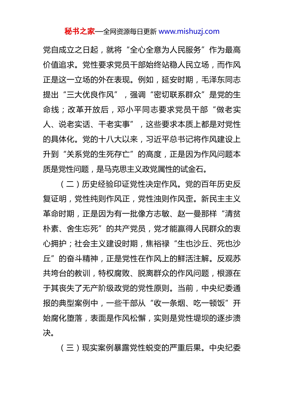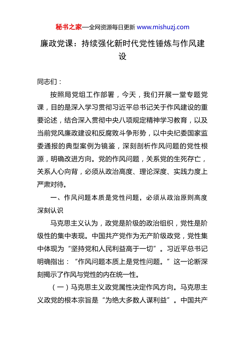 秘书之家—全网资源每日更新 www.mishuzj.com廉政党课:持续强化新时代党性锤炼与作风建设 同志们:按照局党组工作部署,今天,我们开展一堂专题党课,目的是深入学习贯彻习近平总书记关于作风建设的重要论述,结合深入贯彻中央八项规定精神学习教育,以及当前党风廉政建设和反腐败斗争形势,以中央纪委国家监委通报的典型案例为镜鉴,深刻剖析作风问题的党性根源,明确改进方向。党的作风问题,关系党的生死存亡,关系人心向背,必须从政治高度、理论深度、实践力度上严肃对待。一、作风问题本质是党性问题,必须从政治原则高度深刻认识马克思主义认为,政党是阶级的政治组织,党性是阶级性的集中表现。中国共产党作为无产阶级政党,党性集中体现为“坚持党和人民利益高于一切”。习近平总书记明确指出:“作风问题本质上是党性问题。”这一论断深刻揭示了作风与党性的内在统一性。(一)马克思主义政党属性决定作风方向。马克思主义政党的根本宗旨是“为绝大多数人谋利益”。中国共产秘书之家—全网资源每日更新 www.mishuzj.com党自成立之日起,就将“全心全意为人民服务”作为最高价值追求。党性要求党员干部始终站稳人民立场,而作风正是这一立场的外在表现。例如,延安时期,毛泽东同志提出“三大优良作风”,强调“密切联系群众”是党的生命线;改革开放后,邓小平同志要求党员干部“做老实人、说老实话、干老实事”,这些要求本质上都是对党性的具体化。党的十八大以来,习近平总书记将作风建设上升到“关系党的生死存亡”的高度,正是因为作风问题本质是党性问题,是马克思主义政党属性的试金石。(二)历史经验印证党性决定作风。党的百年历史反复证明,党性纯则作风正,党性浊则作风歪。新民主主义革命时期,正是因为有一批像方志敏、赵一曼那样“清贫朴素、舍生忘死”的共产党员,党才能赢得人民群众的衷心拥护;社会主义建设时期,焦裕禄“生也沙丘、死也沙丘”的奋斗精神,正是党性在作风上的鲜活注解。反观苏共垮台的教训,特权腐败、脱离群众的作风问题,根源在于其丧失了无产阶级政党的党性原则。当前,中央纪委通报的典型案例中,一些干部从“收一条烟、吃一顿饭”开始腐化堕落,表面是作风松懈,实则是党性堤坝的逐步溃决。(三)现实案例暴露党性蜕变的严重后果。中央纪委秘书之家—全网资源每日更新 www.mishuzj.com国家监委通报的案例,为我们敲响了警钟。这些案例绝非孤立的作风失范,而是党性原则在权力、利益和私欲冲击下逐步崩塌的缩影,深刻揭示了作风问题与党性蜕变的因果链条。习近平总书记指出:“不正之风和腐败问题互为表里,是党面临的最大风险。”从近年来查处案件看,作风问题往往始于党性防线的细微松动,最终演变为政治立场、理想信念的全面溃退。二、加强党性锤炼是改进作风的根本途径,必须抓牢三大关键环节马克思主义政党建设的一条基本经验是,作风问题必须从党性根源上破题,从思想、制度和实践层面综合施治。习近平总书记强调,“党性教育是共产党人的‘心学’,是党员干部正心修身的必修课。”这一论断深刻揭示了党性锤炼与作风建设的逻辑关系,党性是党员干部立身之本,作风是党性的外在表现;只有从党性锤炼入手,才能根治作风顽疾。当前,面对“四大考验”“四种危险”,加强党性锤炼必须抓住三大关键环节,构建知、信、行统一的实践闭环。(一)以党章为根本遵循,筑牢思想根基。党章是党的根本大法,是全党意志的集中体现。习近平总书记指出:“学习党章是全体党员的基本功,不仅要原原本本秘书之家—全网资源每日更新 www.mishuzj.com学、反反复复学,做到知其然,而且要联系实际学、深入思考学,做到知其所以然。”这一要求明确了党章在党性锤炼中的核心地位。从历史经验看,延安整风运动之所以能扭转党内不正之风,关键在于将学习党章与整顿学风、党风、文风紧密结合。刘少奇同志在《论共产党员的修养》中提出,“共产党员的党性锻炼和修养,是党员本质的改造。”新时代加强党性锤炼,必须把党章作为“总纲”和“标尺”。某国企党委的实践提供了鲜活例证,该党委开展“党章学习月”活动,组织党员干部逐字逐句学习党章中...
