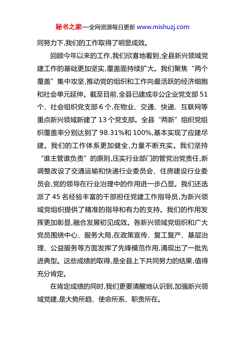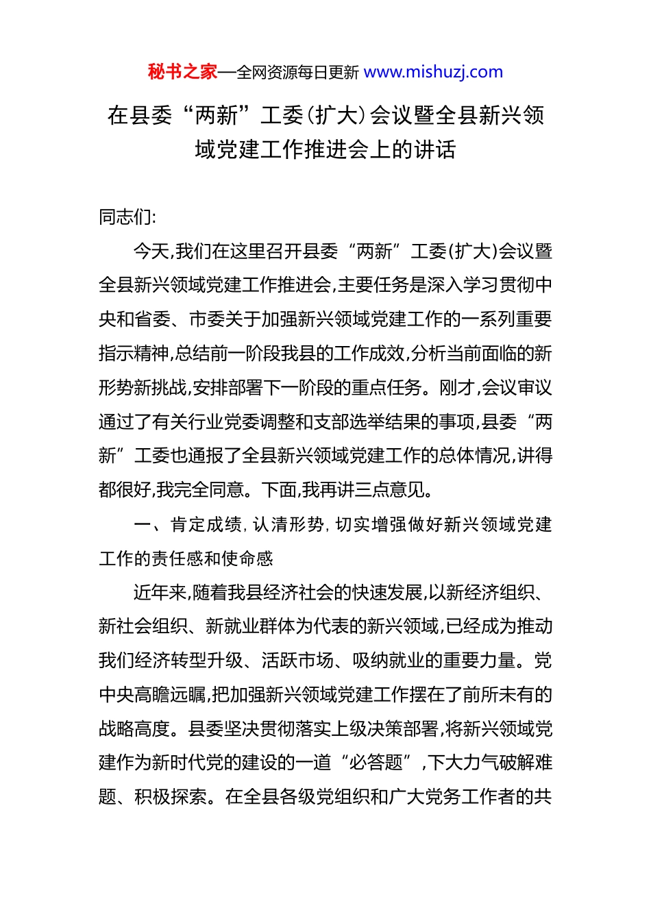 秘书之家—全网资源每日更新 www.mishuzj.com在县委“两新”工委(扩大)会议暨全县新兴领域党建工作推进会上的讲话 同志们:今天,我们在这里召开县委“两新”工委(扩大)会议暨全县新兴领域党建工作推进会,主要任务是深入学习贯彻中央和省委、市委关于加强新兴领域党建工作的一系列重要指示精神,总结前一阶段我县的工作成效,分析当前面临的新形势新挑战,安排部署下一阶段的重点任务。刚才,会议审议通过了有关行业党委调整和支部选举结果的事项,县委“两新”工委也通报了全县新兴领域党建工作的总体情况,讲得都很好,我完全同意。下面,我再讲三点意见。一、肯定成绩,认清形势,切实增强做好新兴领域党建工作的责任感和使命感近年来,随着我县经济社会的快速发展,以新经济组织、新社会组织、新就业群体为代表的新兴领域,已经成为推动我们经济转型升级、活跃市场、吸纳就业的重要力量。党中央高瞻远瞩,把加强新兴领域党建工作摆在了前所未有的战略高度。县委坚决贯彻落实上级决策部署,将新兴领域党建作为新时代党的建设的一道“必答题”,下大力气破解难题、积极探索。在全县各级党组织和广大党务工作者的共秘书之家—全网资源每日更新 www.mishuzj.com同努力下,我们的工作取得了明显成效。回顾今年以来的工作,我们欣喜地看到,全县新兴领域党建工作的基础更加坚实,覆盖面持续扩大。我们聚焦“两个覆盖”集中攻坚,推动党的组织和工作向最活跃的经济细胞和社会单元延伸。截至目前,全县已建成非公企业党支部 51个、社会组织党支部 6 个,在物业、交通、快递、互联网等重点新兴领域新建了 13 个党支部。全县“两新”组织党组织覆盖率分别达到了 98.31%和 100%,基本实现了应建尽建。我们的工作体系更加健全,力量不断充实。我们坚持“谁主管谁负责”的原则,压实行业部门的管党治党责任,新调整改设了交通运输和快递行业委员会、住房建设行业委员会,党的领导在行业治理中的作用进一步凸显。我们还选派了 45 名经验丰富的干部担任党建工作指导员,为新兴领域党组织提供了精准的指导和有力的支持。我们的作用发挥更加彰显,融合发展初见成效。各新兴领域党组织和广大党员围绕中心、服务大局,在政策宣传、复工复产、基层治理、公益服务等方面发挥了先锋模范作用,涌现出了一批先进典型。这些成绩的取得,是全县上下共同努力的结果,值得充分肯定。在肯定成绩的同时,我们更要清醒地认识到,加强新兴领域党建,是大势所趋、使命所系、职责所在。秘书之家—全网资源每日更新 www.mishuzj.com第一,这是巩固党的执政根基的必然要求。新兴领域是新的社会阶层人士和青年群体最集中的地方,也是各种思想文化交流交融交锋的前沿阵地。据统计,我县仅道路货运行业就有从业人员 3700 余人,这还不包括外卖配送员、网约车司机、电商主播等大量新就业形态劳动者。这个庞大的群体,是我们党必须团结和依靠的重要力量。如果我们不能及时地把他们组织起来,把党的领导覆盖过去,党的执政根基就可能出现“真空地带”。因此,我们必须站在巩固党的长期执政地位的政治高度,把新兴领域这个最大的增量,转化为党执政的最大正能量。第二,这是引领新业态新模式健康发展的根本保障。当前,以数字经济、平台经济、低空经济为代表的新业态蓬勃兴起,深刻改变着我们的生产生活方式。这些新业态在带来巨大发展机遇的同时,也伴随着资本无序扩张、劳动者权益保障不足、数据安全风险等一系列新问题。如何确保这些新业态始终沿着正确方向发展,实现经济效益和社会效益的统一?最根本的保障就是坚持和加强党的领导。通过党建引领,把党的政治优势、组织优势转化为企业的发展优势、治理优势,引导企业家增强家国情怀,自觉履行社会责任,推动整个行业规范、健康、可持续发展。第三,这是提升基层治理现代化水平的迫切需要。快递秘书之家—全网资源每日更新 www.mishuzj.com小哥、外卖骑手、网约车司机等新就业群体,就像一个个“移动的探头”,每天穿梭于城市的大街小巷,是基层社会治理中一支不可或缺的“流动力量”。他们既是服务的提供者,也是社情民意的感知者。将他们有效地组织起来、凝聚起来,引导他们有序参与到社区建设、文明创建、应急处置等工...