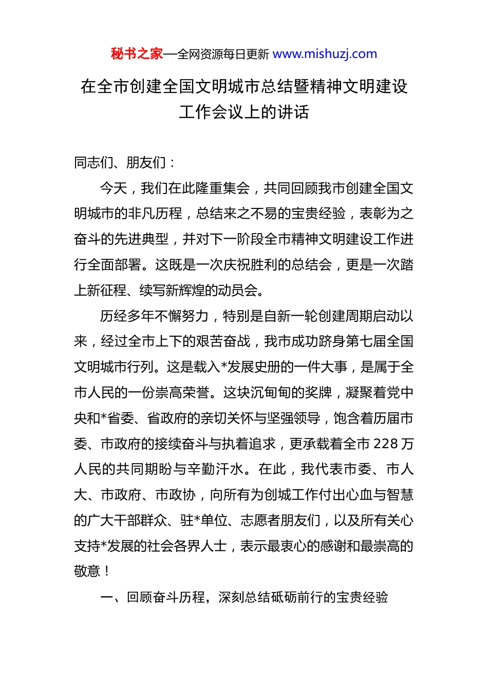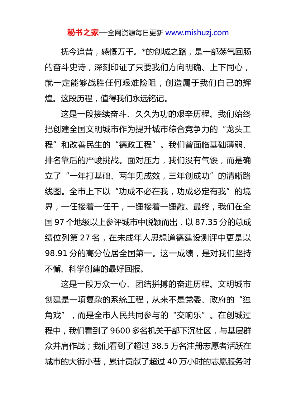 秘书之家—全网资源每日更新 www.mishuzj.com在全市创建全国文明城市总结暨精神文明建设工作会议上的讲话 同志们、朋友们:今天,我们在此隆重集会,共同回顾我市创建全国文明城市的非凡历程,总结来之不易的宝贵经验,表彰为之奋斗的先进典型,并对下一阶段全市精神文明建设工作进行全面部署。这既是一次庆祝胜利的总结会,更是一次踏上新征程、续写新辉煌的动员会。历经多年不懈努力,特别是自新一轮创建周期启动以来,经过全市上下的艰苦奋战,我市成功跻身第七届全国文明城市行列。这是载入*发展史册的一件大事,是属于全市人民的一份崇高荣誉。这块沉甸甸的奖牌,凝聚着党中央和*省委、省政府的亲切关怀与坚强领导,饱含着历届市委、市政府的接续奋斗与执着追求,更承载着全市 228 万人民的共同期盼与辛勤汗水。在此,我代表市委、市人大、市政府、市政协,向所有为创城工作付出心血与智慧的广大干部群众、驻*单位、志愿者朋友们,以及所有关心支持*发展的社会各界人士,表示最衷心的感谢和最崇高的敬意!一、回顾奋斗历程,深刻总结砥砺前行的宝贵经验秘书之家—全网资源每日更新 www.mishuzj.com抚今追昔,感慨万千。*的创城之路,是一部荡气回肠的奋斗史诗,深刻印证了只要我们方向明确、上下同心,就一定能够战胜任何艰难险阻,创造属于我们自己的辉煌。这段历程,值得我们永远铭记。这是一段接续奋斗、久久为功的艰辛历程。我们始终把创建全国文明城市作为提升城市综合竞争力的“龙头工程”和改善民生的“德政工程”。我们曾面临基础薄弱、排名靠后的严峻挑战。面对压力,我们没有气馁,而是确立了“一年打基础、两年见成效,三年创成功”的清晰路线图。全市上下以“功成不必在我,功成必定有我”的境界,一任接着一任干,一锤接着一锤敲。最终,我们在全国 97 个地级以上参评城市中脱颖而出,以 87.35 分的总成绩位列第 27 名,在未成年人思想道德建设测评中更是以98.91 分的高分位居全国第一。这一成绩,是对我们坚持不懈、科学创建的最好回报。这是一段万众一心、团结拼搏的奋进历程。文明城市创建是一项复杂的系统工程,从来不是党委、政府的“独角戏”,而是全市人民共同参与的“交响乐”。在创城过程中,我们看到了 9600 多名机关干部下沉社区,与基层群众并肩作战;我们看到了超过 38.5 万名注册志愿者活跃在城市的大街小巷,累计贡献了超过 40 万小时的志愿服务时秘书之家—全网资源每日更新 www.mishuzj.com长,用行动擦亮了“奉献、友爱、互助、进步”的志愿精神;我们看到了广大市民群众以主人翁的姿态,积极参与“清洁家园”“文明健步走”等活动,形成了共建共治共享的生动局面。正是这股发端于民间、汇聚于全城的磅礴力量,构筑了我们创城必胜的坚固基石。这是一段以文化人、浸润人心的滋养历程。我们深知,城市的文明,根植于文化的沃土,彰显于市民的素养。我们坚持以社会主义核心价值观为引领,深入开展公民道德建设。我们精心打造了“*之夏”文化艺术季等一系列群众喜闻乐见的文化品牌,三年来累计举办各类高品质文艺演出和群众性文化活动超过 2.4 万场,极大地丰富了市民的精神文化生活。我们建成了覆盖城乡的 902 个新时代文明实践中心(所、站),并延伸设立了 91 个文明实践点,让党的创新理论和文明新风飞入寻常百姓家。城市的人文气息日益浓厚,市民的文明素质在潜移默化中得到升华。这是一段共建共享、造福百姓的幸福历程。创建文明城市的出发点和落脚点,始终是为了人民对美好生活的向往。我们坚持“创城为民、创城惠民”,将财政资金更多地投向民生领域。四年间,我们见缝插针建设了 131 个“口袋公园”,让市民推窗见绿、出门入园;我们全力推秘书之家—全网资源每日更新 www.mishuzj.com进 298 个老旧小区改造,让昔日的老旧楼院焕发新生;我们新建和改造了一批公共卫生间,增设了 800 多处吸烟亭和便民充电桩,城市功能品质得到显著提升。城市的“颜值”更高了,群众的“幸福感”更强了,荣膺“全国最具幸福感城市”称号便是最好的证明。这是一段锤炼队伍、砥砺前行的成长历程。创城是一场硬仗,也是一个...