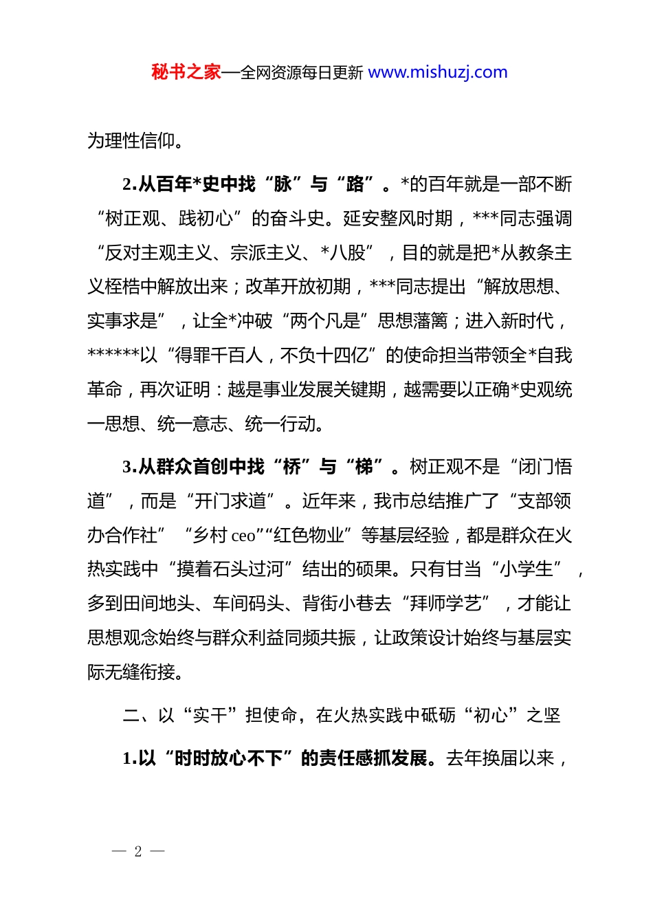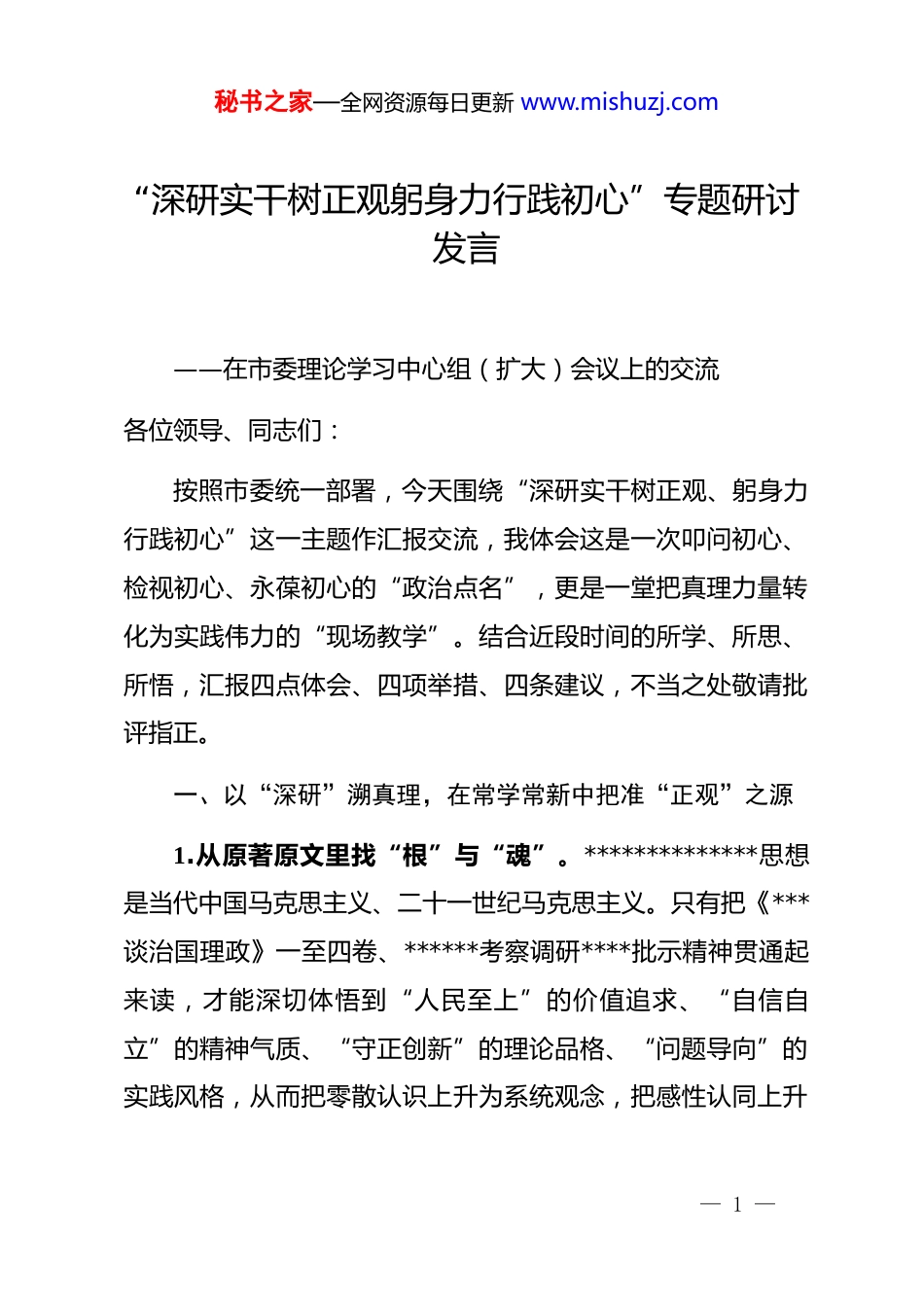 秘书之家—全网资源每日更新 www.mishuzj.com“深研实干树正观躬身力行践初心”专题研讨发言——在市委理论学习中心组(扩大)会议上的交流各位领导、同志们:按照市委统一部署,今天围绕“深研实干树正观、躬身力行践初心”这一主题作汇报交流,我体会这是一次叩问初心、检视初心、永葆初心的“政治点名”,更是一堂把真理力量转化为实践伟力的“现场教学”。结合近段时间的所学、所思、所悟,汇报四点体会、四项举措、四条建议,不当之处敬请批评指正。一、以“深研”溯真理,在常学常新中把准“正观”之源1.从原著原文里找“根”与“魂”。**************思想是当代中国马克思主义、二十一世纪马克思主义。只有把《***谈治国理政》一至四卷、******考察调研****批示精神贯通起来读,才能深切体悟到“人民至上”的价值追求、“自信自立”的精神气质、“守正创新”的理论品格、“问题导向”的实践风格,从而把零散认识上升为系统观念,把感性认同上升— 1 —秘书之家—全网资源每日更新 www.mishuzj.com为理性信仰。2.从百年*史中找“脉”与“路”。*的百年就是一部不断“树正观、践初心”的奋斗史。延安整风时期,***同志强调“反对主观主义、宗派主义、*八股”,目的就是把*从教条主义桎梏中解放出来;改革开放初期,***同志提出“解放思想、实事求是”,让全*冲破“两个凡是”思想藩篱;进入新时代,******以“得罪千百人,不负十四亿”的使命担当带领全*自我革命,再次证明:越是事业发展关键期,越需要以正确*史观统一思想、统一意志、统一行动。3.从群众首创中找“桥”与“梯”。树正观不是“闭门悟道”,而是“开门求道”。近年来,我市总结推广了“支部领办合作社”“乡村 ceo”“红色物业”等基层经验,都是群众在火热实践中“摸着石头过河”结出的硕果。只有甘当“小学生”,多到田间地头、车间码头、背街小巷去“拜师学艺”,才能让思想观念始终与群众利益同频共振,让政策设计始终与基层实际无缝衔接。二、以“实干”担使命,在火热实践中砥砺“初心”之坚1.以“时时放心不下”的责任感抓发展。去年换届以来,— 2 —秘书之家—全网资源每日更新 www.mishuzj.com市委把“项目为王、产业为基”写在发展旗帜上,建立“红黄绿”三色预警、“蜗牛项目”通报、“揭榜挂帅”赛马“三项机制”,推动固定资产投资增速连续 8 个月领跑全省。事实雄辩地说明:初心不是喊出来的,而是干出来的;树正观不能停留在口头表态,必须体现在抓项目、兴产业、惠民生的硬核成果上。2.以“事事紧抓不放”的韧劲促改革。聚焦群众“急难愁盼”,我们推出“一件事一次办”集成改革,把 25 个部门、217 项政务服务事项颗粒度细化到“最小单元”,平均材料压缩 46%、时限压缩 62%,企业开办实现“一个环节、零成本、半天办结”。改革深处是利益,触动利益比触动灵魂还难,只有秉持“功成不必在我、功成必定有我”的正确政绩观,才能以“自我割肉”的勇气打破部门藩篱、数据壁垒,让企业和群众真正感受到“初心”的温度。3.以“人人担当作为”的氛围保稳定。面对世纪疫情跌宕冲击,我们坚持“外防输入、内防反弹”总策略和“动态清零”总方针,创新“*员楼长+巷长+店长”网格化治理,全市2.6 万名*员干部下沉一线,累计排查重点人员 38.4 万人次,用“铁脚板”守护了“烟火气”。实践再次昭示:初心不是风平— 3 —秘书之家—全网资源每日更新 www.mishuzj.com浪静时的口号,而是关键时刻“我是*员我先上”的自觉,是危难面前“哪怕倒下也要向前”的血性。三、以“正观”纠偏差,在自我革命中筑牢“政治”之魂1.警惕“佛系心态”,破除“躺平”之弊。当前,少数干部把“稳中求进”曲解为“稳而不进”,把“风险可控”异化为“最好不干事”,遇到矛盾“击鼓传花”,面对任务“绕道而行”。根治“躺平”病灶,必须用好*性体检、谈心谈话、“三评一考”等利器,让“混日子”的没市场、让“躺平式”的躺不住。2.警惕“滤镜政绩”,铲除“盆景”之害。有的同志习惯“锦上添花”,热衷“垒大户、造盆景”,把资源过度集中到“可视范围”“公路沿线”,导致“重点村”一俊遮百丑、...