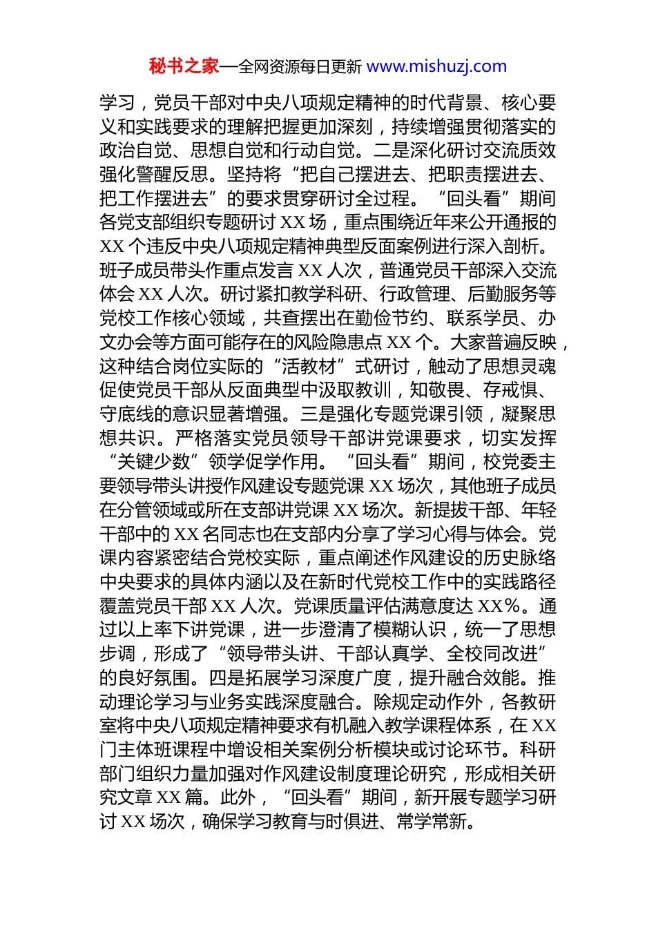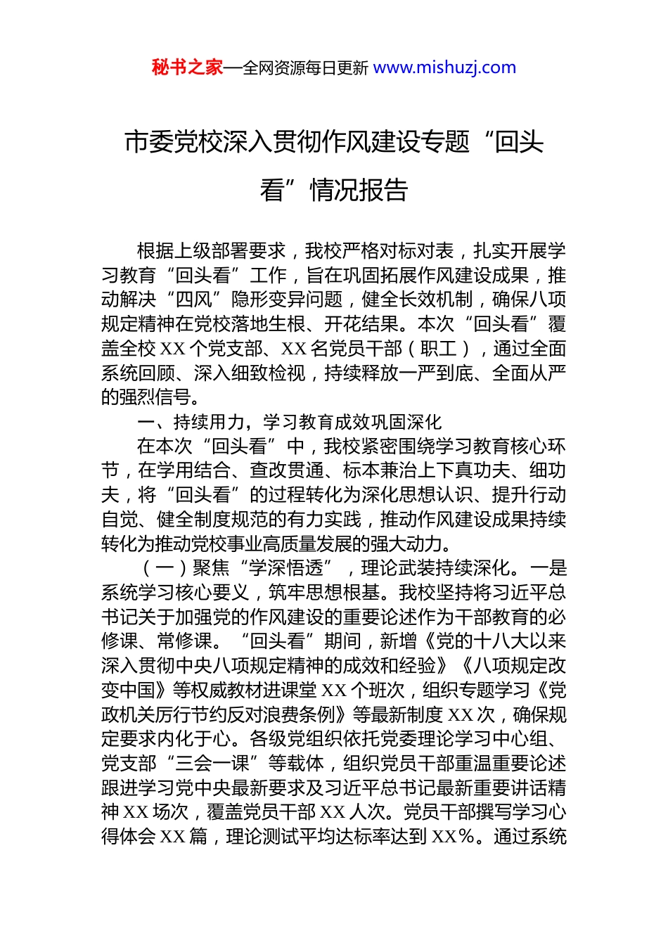 秘书之家—全网资源每日更新 www.mishuzj.com市委党校深入贯彻作风建设专题“回头看”情况报告根据上级部署要求,我校严格对标对表,扎实开展学习教育“回头看”工作,旨在巩固拓展作风建设成果,推动解决“四风”隐形变异问题,健全长效机制,确保八项规定精神在党校落地生根、开花结果。本次“回头看”覆盖全校 XX 个党支部、XX 名党员干部(职工),通过全面系统回顾、深入细致检视,持续释放一严到底、全面从严的强烈信号。一、持续用力,学习教育成效巩固深化在本次“回头看”中,我校紧密围绕学习教育核心环节,在学用结合、查改贯通、标本兼治上下真功夫、细功夫,将“回头看”的过程转化为深化思想认识、提升行动自觉、健全制度规范的有力实践,推动作风建设成果持续转化为推动党校事业高质量发展的强大动力。(一)聚焦“学深悟透”,理论武装持续深化。一是系统学习核心要义,筑牢思想根基。我校坚持将习近平总书记关于加强党的作风建设的重要论述作为干部教育的必修课、常修课。“回头看”期间,新增《党的十八大以来深入贯彻中央八项规定精神的成效和经验》《八项规定改变中国》等权威教材进课堂 XX 个班次,组织专题学习《党政机关厉行节约反对浪费条例》等最新制度 XX 次,确保规定要求内化于心。各级党组织依托党委理论学习中心组、党支部“三会一课”等载体,组织党员干部重温重要论述跟进学习党中央最新要求及习近平总书记最新重要讲话精神 XX 场次,覆盖党员干部 XX 人次。党员干部撰写学习心得体会 XX 篇,理论测试平均达标率达到 XX%。通过系统秘书之家—全网资源每日更新 www.mishuzj.com学习,党员干部对中央八项规定精神的时代背景、核心要义和实践要求的理解把握更加深刻,持续增强贯彻落实的政治自觉、思想自觉和行动自觉。二是深化研讨交流质效强化警醒反思。坚持将“把自己摆进去、把职责摆进去、把工作摆进去”的要求贯穿研讨全过程。“回头看”期间各党支部组织专题研讨 XX 场,重点围绕近年来公开通报的XX 个违反中央八项规定精神典型反面案例进行深入剖析。班子成员带头作重点发言 XX 人次,普通党员干部深入交流体会 XX 人次。研讨紧扣教学科研、行政管理、后勤服务等党校工作核心领域,共查摆出在勤俭节约、联系学员、办文办会等方面可能存在的风险隐患点 XX 个。大家普遍反映,这种结合岗位实际的“活教材”式研讨,触动了思想灵魂促使党员干部从反面典型中汲取教训,知敬畏、存戒惧、守底线的意识显著增强。三是强化专题党课引领,凝聚思想共识。严格落实党员领导干部讲党课要求,切实发挥“关键少数”领学促学作用。“回头看”期间,校党委主要领导带头讲授作风建设专题党课 XX 场次,其他班子成员在分管领域或所在支部讲党课 XX 场次。新提拔干部、年轻干部中的 XX 名同志也在支部内分享了学习心得与体会。党课内容紧密结合党校实际,重点阐述作风建设的历史脉络中央要求的具体内涵以及在新时代党校工作中的实践路径覆盖党员干部 XX 人次。党课质量评估满意度达 XX%。通过以上率下讲党课,进一步澄清了模糊认识,统一了思想步调,形成了“领导带头讲、干部认真学、全校同改进”的良好氛围。四是拓展学习深度广度,提升融合效能。推动理论学习与业务实践深度融合。除规定动作外,各教研室将中央八项规定精神要求有机融入教学课程体系,在 XX门主体班课程中增设相关案例分析模块或讨论环节。科研部门组织力量加强对作风建设制度理论研究,形成相关研究文章 XX 篇。此外,“回头看”期间,新开展专题学习研讨 XX 场次,确保学习教育与时俱进、常学常新。秘书之家—全网资源每日更新 www.mishuzj.com(二)聚焦“刀刃向内”,问题查摆精准深入。一是多维度扫描梳理,确保查摆全面覆盖。坚持开门搞检视,畅通问题反映渠道。一方面,严格对照上级点出的普遍性问题和党校自身确定的重点问题“两张清单”,确保不遗漏。另一方面,综合运用纪检监察部门日常监督反馈意见(提供线索 XX 条)、审计监督发现的问题(涉及 XX 个方面)、财会监督发现的 XX 项异常开支、督促检查和调研成果(反映问题 XX...