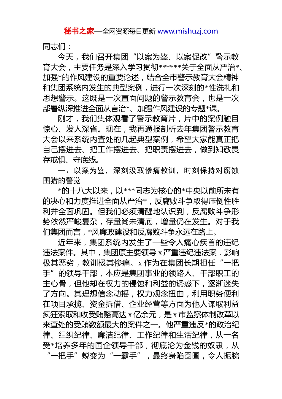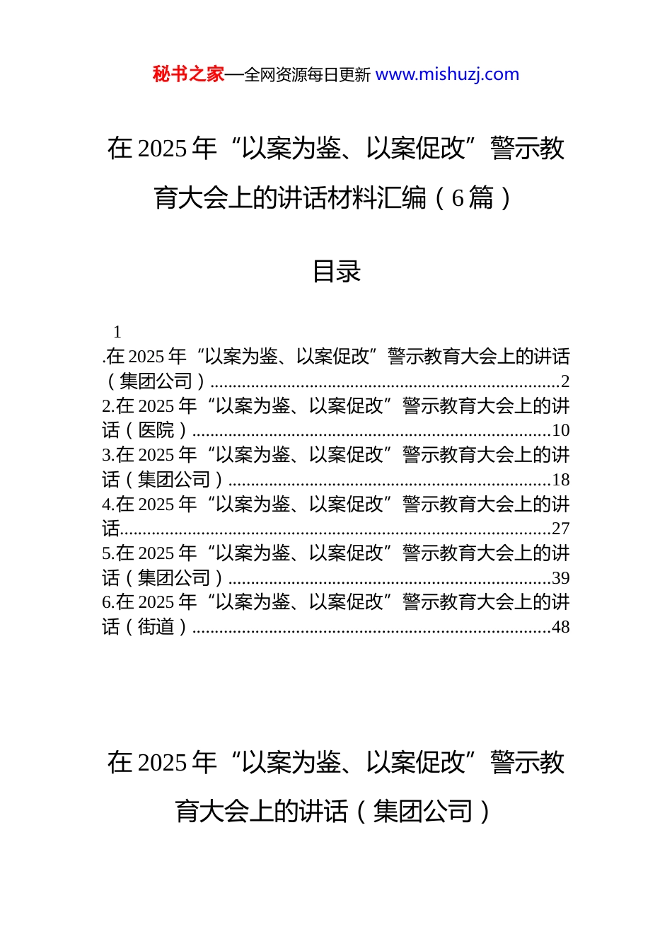秘书之家—全网资源每日更新 www.mishuzj.com在 2025 年“以案为鉴、以案促改”警示教育大会上的讲话材料汇编(6 篇)目录1.在 2025 年“以案为鉴、以案促改”警示教育大会上的讲话(集团公司).............................................................................22.在 2025 年“以案为鉴、以案促改”警示教育大会上的讲话(医院)...............................................................................103.在 2025 年“以案为鉴、以案促改”警示教育大会上的讲话(集团公司).......................................................................184.在 2025 年“以案为鉴、以案促改”警示教育大会上的讲话...............................................................................................275.在 2025 年“以案为鉴、以案促改”警示教育大会上的讲话(集团公司).......................................................................396.在 2025 年“以案为鉴、以案促改”警示教育大会上的讲话(街道)...............................................................................48在 2025 年“以案为鉴、以案促改”警示教育大会上的讲话(集团公司)秘书之家—全网资源每日更新 www.mishuzj.com同志们:今天,我们召开集团“以案为鉴、以案促改”警示教育大会,主要任务是深入学习贯彻******关于全面从严治*、加强*的作风建设的重要论述,结合全市警示教育大会精神和集团系统内发生的典型案例,进行一次深刻的*性洗礼和思想警示。这既是一次直面问题的警示教育会,也是一次部署纵深推进全面从言治*、加强作风建设的专题*课。刚才,我们集体观看了警示教育片,片中的案例触目惊心、发人深省。现在,我再通报剖析去年集团警示教育大会以来系统内查处的几起典型案例,希望大家能真正把自己摆进去、把工作摆进去、把职责摆进去,做到知敬畏存戒惧、守底线。一、以案为鉴,深刻汲取惨痛教训,时刻保持对腐蚀围猎的警觉*的十八大以来,以***同志为核心的*中央以前所未有的决心和力度推进全面从严治*,反腐败斗争取得压倒性胜利并全面巩固。但我们必须清醒地认识到,反腐败斗争形势依然严峻复杂,存量尚未清底,增量仍在发生。对于我们集团而言,*风廉政建设和反腐败斗争永远在路上。近年来,集团系统内发生了一些令人痛心疾首的违纪违法案件。其中,集团原主要领导 x 严重违纪违法案,影响极其恶劣,教训极其惨痛。x 作为在集团长期担任“一把手”的领导干部,本应是集团事业的领路人、干部职工的主心骨,但他却在权力的侵蚀和利益的诱惑下,逐渐迷失了方向。其理想信念动摇,权力观念扭曲,利用职务便利在项目承揽、资金拆借、企业经营等方面为他人谋取利益疯狂索取和收受贿赂高达 x 亿余元,是 x 市监察体制改革以来查处的受贿数额最大的案件之一。他严重违反*的政治纪律、组织纪律、廉洁纪律、工作纪律和生活纪律,从一名受*培养多年的国企领导干部,彻底沦为金钱的奴隶,从“一把手”蜕变为“一霸手”,最终身陷囹圄,令人扼腕秘书之家—全网资源每日更新 www.mishuzj.com叹息。x 案并非孤例。审视集团内部近年来查处的其他案件,我们可以清晰地看到一些共性问题和突出表现,必须引起我们全体*员干部的高度警惕。一是政治规矩和政治纪律意识淡薄。有的干部在贯彻落实*中央和市委决策部署上打折扣、搞变通,对集团*委的战略要求阳奉阴违,在自己的“一亩三分地”里另搞一套,热衷于搞“小圈子”,个人主义、本位主义思想严重,损害了集团的整体利益和政令畅通。二是“四风”问题顽固不化,隐形变异。形式主义官僚主义问题依然突出。有的干部习惯于当“甩手掌柜”工作满足于开会发文、听汇报,不愿深入基层、不愿直面矛盾,对一线情况“一问三不知”,导致决策“拍脑袋”执行“拍胸脯”、最后“拍大腿”。有的单位文件多、会议多、检查多的状况仍未得到根本扭转。享乐主义、奢靡之风禁而不绝,有的干部变换手法,以商务接待为名行违规吃喝之实,有的违规收受礼品礼金,有的在出差培训期间...