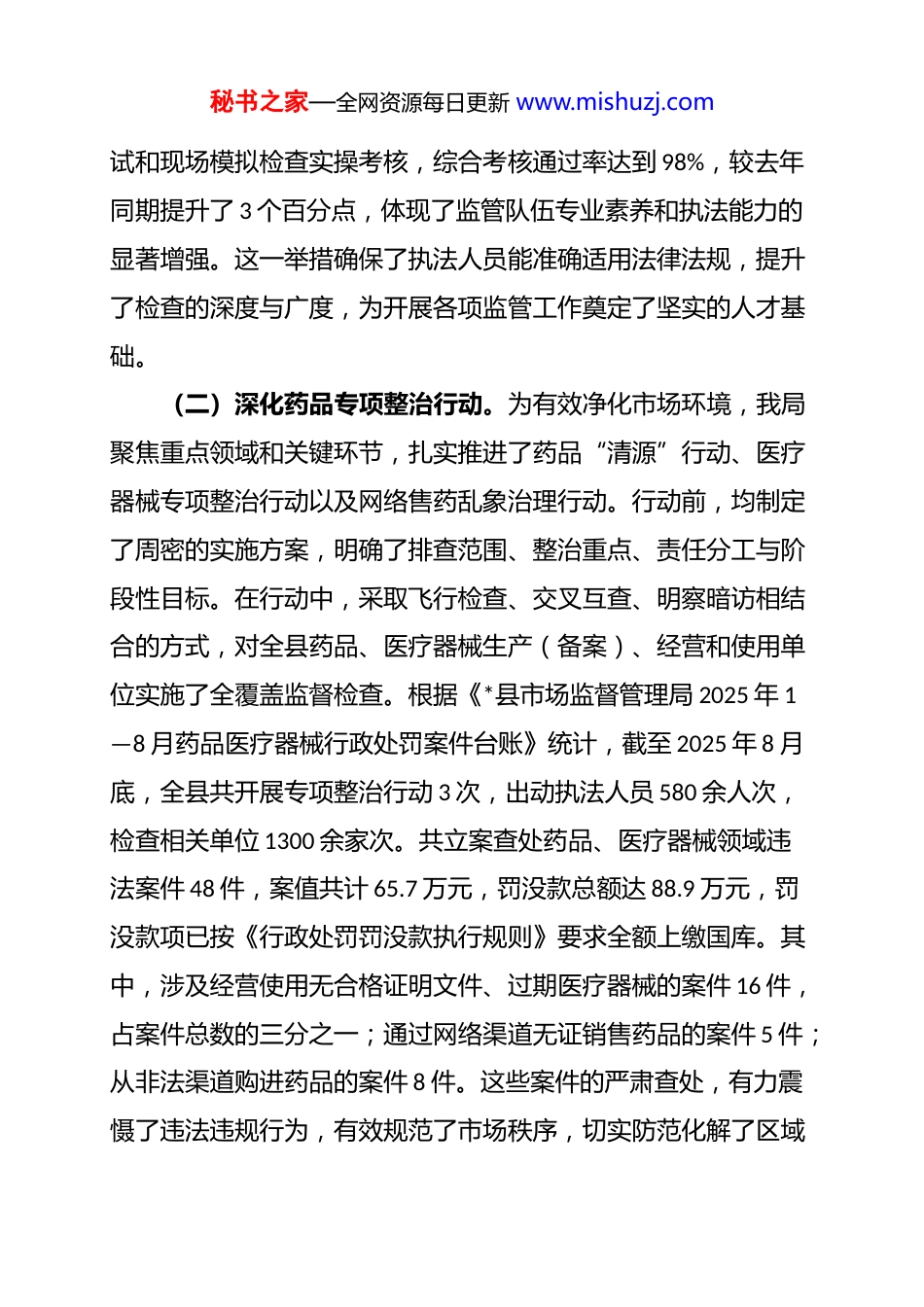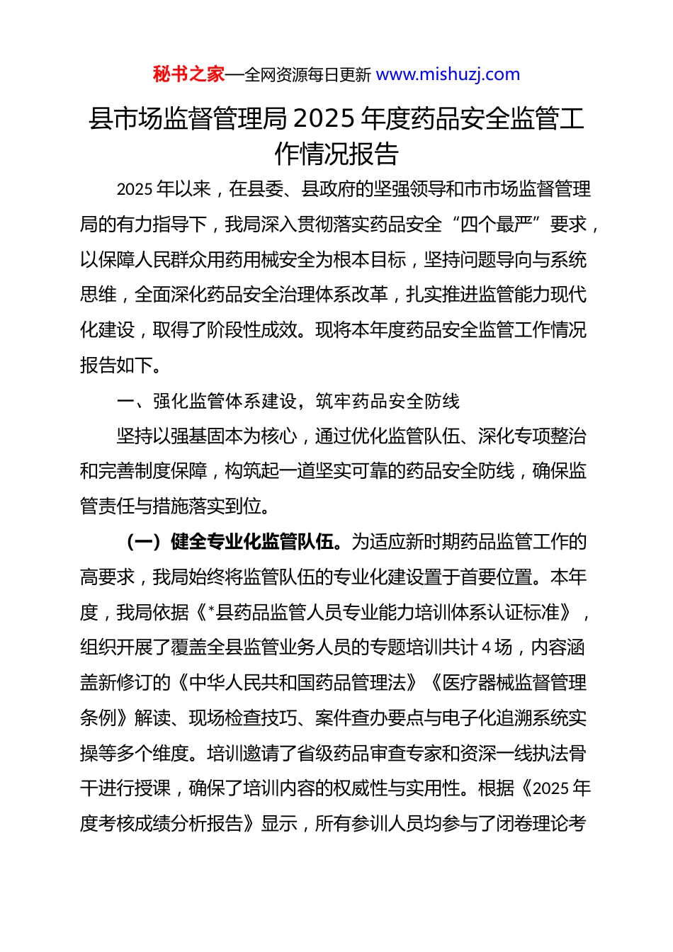 秘书之家—全网资源每日更新 www.mishuzj.com县市场监督管理局 2025 年度药品安全监管工作情况报告2025 年以来,在县委、县政府的坚强领导和市市场监督管理局的有力指导下,我局深入贯彻落实药品安全“四个最严”要求,以保障人民群众用药用械安全为根本目标,坚持问题导向与系统思维,全面深化药品安全治理体系改革,扎实推进监管能力现代化建设,取得了阶段性成效。现将本年度药品安全监管工作情况报告如下。一、强化监管体系建设,筑牢药品安全防线坚持以强基固本为核心,通过优化监管队伍、深化专项整治和完善制度保障,构筑起一道坚实可靠的药品安全防线,确保监管责任与措施落实到位。(一)健全专业化监管队伍。为适应新时期药品监管工作的高要求,我局始终将监管队伍的专业化建设置于首要位置。本年度,我局依据《*县药品监管人员专业能力培训体系认证标准》,组织开展了覆盖全县监管业务人员的专题培训共计 4 场,内容涵盖新修订的《中华人民共和国药品管理法》《医疗器械监督管理条例》解读、现场检查技巧、案件查办要点与电子化追溯系统实操等多个维度。培训邀请了省级药品审查专家和资深一线执法骨干进行授课,确保了培训内容的权威性与实用性。根据《2025 年度考核成绩分析报告》显示,所有参训人员均参与了闭卷理论考秘书之家—全网资源每日更新 www.mishuzj.com试和现场模拟检查实操考核,综合考核通过率达到 98%,较去年同期提升了 3 个百分点,体现了监管队伍专业素养和执法能力的显著增强。这一举措确保了执法人员能准确适用法律法规,提升了检查的深度与广度,为开展各项监管工作奠定了坚实的人才基础。(二)深化药品专项整治行动。为有效净化市场环境,我局聚焦重点领域和关键环节,扎实推进了药品“清源”行动、医疗器械专项整治行动以及网络售药乱象治理行动。行动前,均制定了周密的实施方案,明确了排查范围、整治重点、责任分工与阶段性目标。在行动中,采取飞行检查、交叉互查、明察暗访相结合的方式,对全县药品、医疗器械生产(备案)、经营和使用单位实施了全覆盖监督检查。根据《*县市场监督管理局 2025 年 1—8 月药品医疗器械行政处罚案件台账》统计,截至 2025 年 8 月底,全县共开展专项整治行动 3 次,出动执法人员 580 余人次,检查相关单位 1300 余家次。共立案查处药品、医疗器械领域违法案件 48 件,案值共计 65.7 万元,罚没款总额达 88.9 万元,罚没款项已按《行政处罚罚没款执行规则》要求全额上缴国库。其中,涉及经营使用无合格证明文件、过期医疗器械的案件 16 件,占案件总数的三分之一;通过网络渠道无证销售药品的案件 5 件;从非法渠道购进药品的案件 8 件。这些案件的严肃查处,有力震慑了违法违规行为,有效规范了市场秩序,切实防范化解了区域秘书之家—全网资源每日更新 www.mishuzj.com性、系统性药品安全风险。(三)完善风险防控机制。为构建全方位、多层次的药品安全风险防控体系,我局建立了药品安全风险研判制度,每月组织召开风险研判会议,对药品生产、流通、使用等环节的潜在风险进行全面排查和分析。同时,依托大数据、云计算等现代信息技术,搭建了药品安全风险监测预警平台,实时收集、分析药品质量安全数据,及时发现风险隐患并发出预警。此外,还制定了药品安全应急预案,明确了应急处置流程、责任分工和保障措施,确保在发生药品安全突发事件时能够迅速响应、有效处置。通过完善风险防控机制,我局实现了对药品安全风险的早发现、早预警、早处置,切实保障了人民群众用药安全。二、创新监管服务模式提升精准治理效能在筑牢安全底线的同时,我局积极探索监管与服务相结合的新路径,通过打造特色服务品牌和运用智慧监管技术,推动药品安全治理从被动应对向量化管理和精准防控转变。(一)打造“美丽有约”品牌守护公众用妆安全。针对化妆品消费领域的新特点和新需求,我局在全省率先建成了“美丽有约”工作室,探索化妆品安全精细化管理新模式。该工作室不仅是化妆品不良反应的监测前哨,更是一个集风险分析、科普宣传、消费预警于一体的综合服务平台。工作室建立了与...
