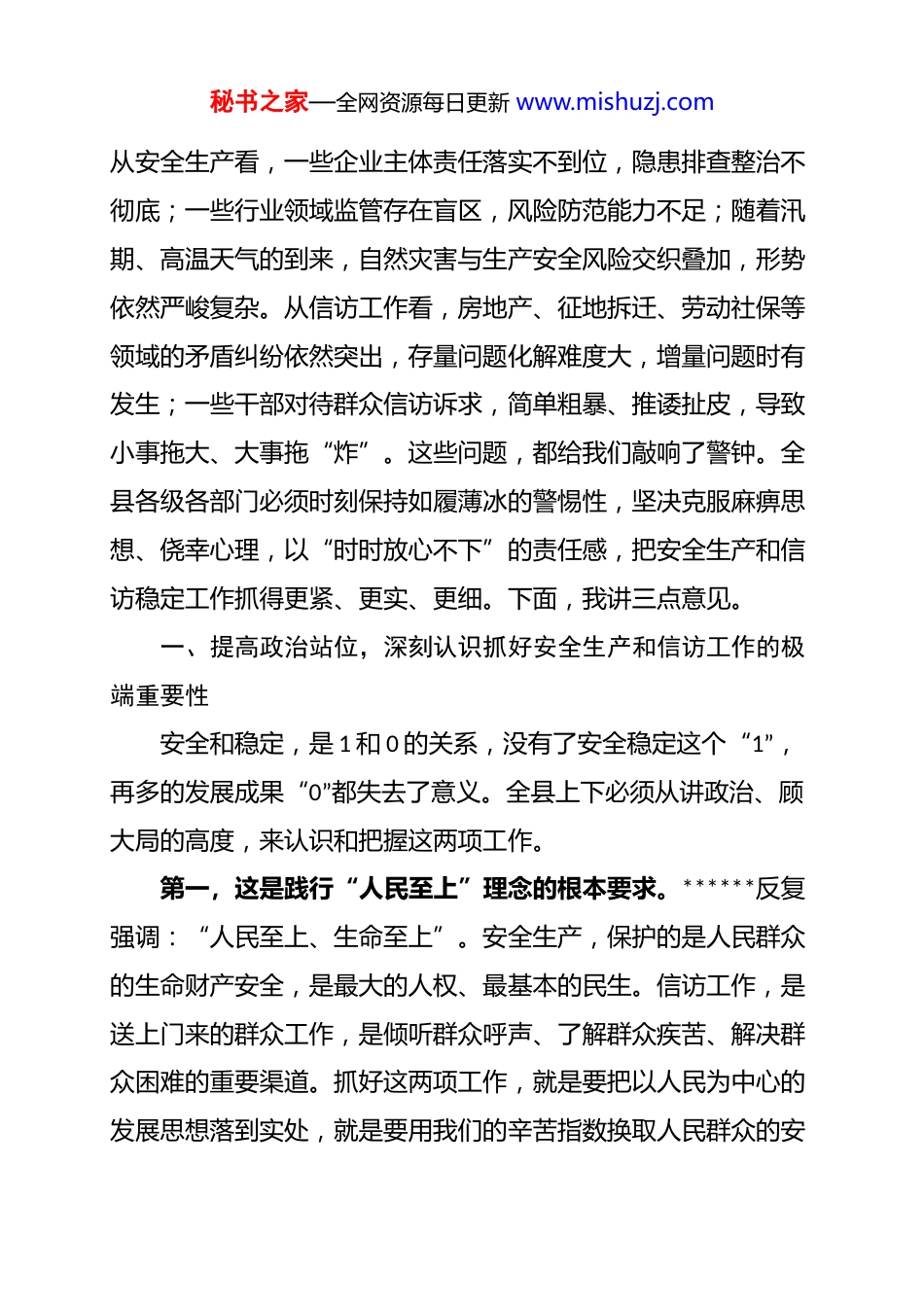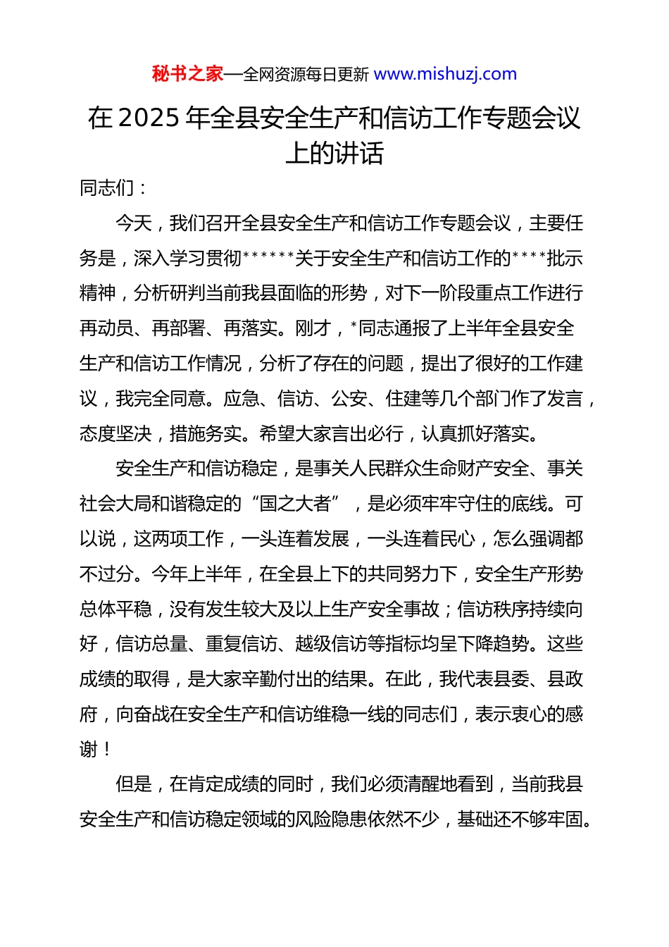 秘书之家—全网资源每日更新 www.mishuzj.com在 2025 年全县安全生产和信访工作专题会议上的讲话同志们:今天,我们召开全县安全生产和信访工作专题会议,主要任务是,深入学习贯彻******关于安全生产和信访工作的****批示精神,分析研判当前我县面临的形势,对下一阶段重点工作进行再动员、再部署、再落实。刚才,*同志通报了上半年全县安全生产和信访工作情况,分析了存在的问题,提出了很好的工作建议,我完全同意。应急、信访、公安、住建等几个部门作了发言,态度坚决,措施务实。希望大家言出必行,认真抓好落实。安全生产和信访稳定,是事关人民群众生命财产安全、事关社会大局和谐稳定的“国之大者”,是必须牢牢守住的底线。可以说,这两项工作,一头连着发展,一头连着民心,怎么强调都不过分。今年上半年,在全县上下的共同努力下,安全生产形势总体平稳,没有发生较大及以上生产安全事故;信访秩序持续向好,信访总量、重复信访、越级信访等指标均呈下降趋势。这些成绩的取得,是大家辛勤付出的结果。在此,我代表县委、县政府,向奋战在安全生产和信访维稳一线的同志们,表示衷心的感谢!但是,在肯定成绩的同时,我们必须清醒地看到,当前我县安全生产和信访稳定领域的风险隐患依然不少,基础还不够牢固。秘书之家—全网资源每日更新 www.mishuzj.com从安全生产看,一些企业主体责任落实不到位,隐患排查整治不彻底;一些行业领域监管存在盲区,风险防范能力不足;随着汛期、高温天气的到来,自然灾害与生产安全风险交织叠加,形势依然严峻复杂。从信访工作看,房地产、征地拆迁、劳动社保等领域的矛盾纠纷依然突出,存量问题化解难度大,增量问题时有发生;一些干部对待群众信访诉求,简单粗暴、推诿扯皮,导致小事拖大、大事拖“炸”。这些问题,都给我们敲响了警钟。全县各级各部门必须时刻保持如履薄冰的警惕性,坚决克服麻痹思想、侥幸心理,以“时时放心不下”的责任感,把安全生产和信访稳定工作抓得更紧、更实、更细。下面,我讲三点意见。一、提高政治站位,深刻认识抓好安全生产和信访工作的极端重要性安全和稳定,是 1 和 0 的关系,没有了安全稳定这个“1”,再多的发展成果“0”都失去了意义。全县上下必须从讲政治、顾大局的高度,来认识和把握这两项工作。第一,这是践行“人民至上”理念的根本要求。******反复强调:“人民至上、生命至上”。安全生产,保护的是人民群众的生命财产安全,是最大的人权、最基本的民生。信访工作,是送上门来的群众工作,是倾听群众呼声、了解群众疾苦、解决群众困难的重要渠道。抓好这两项工作,就是要把以人民为中心的发展思想落到实处,就是要用我们的辛苦指数换取人民群众的安秘书之家—全网资源每日更新 www.mishuzj.com全指数和幸福指数。各级领导干部要始终把人民群众的安危冷暖放在心上,把群众的呼声作为第一信号,把群众的需求作为第一选择,带着感情、带着责任去做工作。第二,这是统筹发展和安全的内在要求。******深刻指出:“安全是发展的前提,发展是安全的保障。”没有安全稳定的环境,一切发展都无从谈起。当前,我县正处在推动高质量发展的关键时期,一大批重点项目正在建设,各类生产经营活动十分活跃,这给安全生产带来了新的挑战。同时,发展中的矛盾和问题,也容易在信访领域集中反映出来。我们必须坚持系统观念,学会“弹钢琴”,既要全力以赴拼经济、搞建设,又要一丝不苟抓安全、保稳定,做到两手抓、两手硬,以高水平安全保障高质量发展,以高质量发展促进高水平安全。第三,这是防范化解重大风险的现实要求。当前,我们面临的内外环境日趋复杂,各种“黑天鹅”“灰犀牛”事件随时可能发生。安全生产和信访稳定领域,是各种风险的交汇点、集聚地。一个安全生产事故,就可能引发群体性事件;一个信访积案,就可能演变成重大的社会稳定风险。我们必须增强忧患意识,坚持底线思维,把防范化解这两大领域的风险,作为一项重大政治任务来抓,下好先手棋、打好主动仗,坚决守住不发生重特大安全事故、不发生大规模群体性事件的底线。二、聚焦重点关键,以过硬措施坚决筑牢安全稳定防线秘...