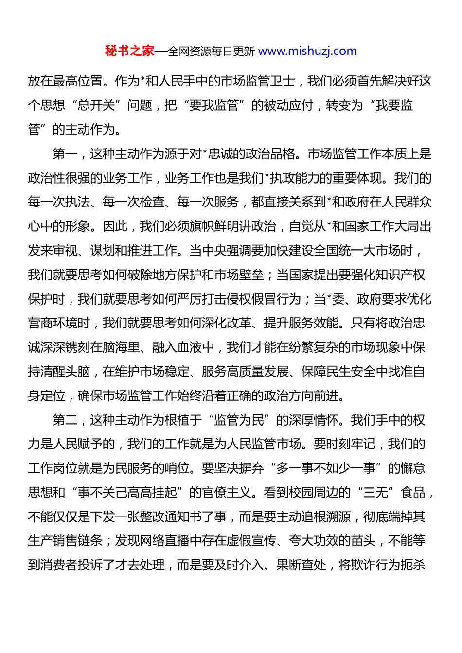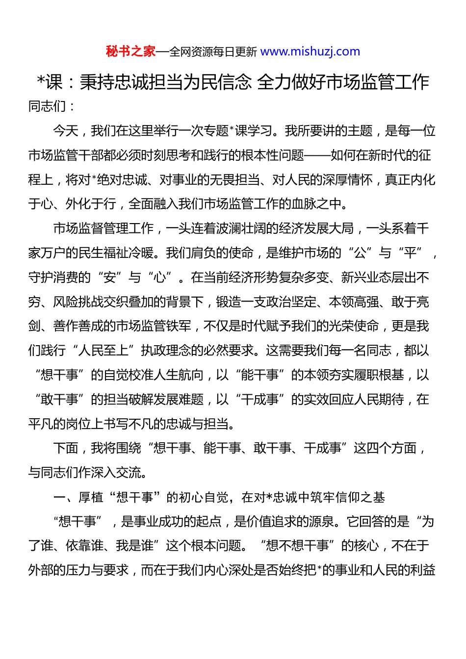 秘书之家—全网资源每日更新 www.mishuzj.com*课:秉持忠诚担当为民信念 全力做好市场监管工作同志们:今天,我们在这里举行一次专题*课学习。我所要讲的主题,是每一位市场监管干部都必须时刻思考和践行的根本性问题——如何在新时代的征程上,将对*绝对忠诚、对事业的无畏担当、对人民的深厚情怀,真正内化于心、外化于行,全面融入我们市场监管工作的血脉之中。市场监督管理工作,一头连着波澜壮阔的经济发展大局,一头系着千家万户的民生福祉冷暖。我们肩负的使命,是维护市场的“公”与“平”,守护消费的“安”与“心”。在当前经济形势复杂多变、新兴业态层出不穷、风险挑战交织叠加的背景下,锻造一支政治坚定、本领高强、敢于亮剑、善作善成的市场监管铁军,不仅是时代赋予我们的光荣使命,更是我们践行“人民至上”执政理念的必然要求。这需要我们每一名同志,都以“想干事”的自觉校准人生航向,以“能干事”的本领夯实履职根基,以“敢干事”的担当破解发展难题,以“干成事”的实效回应人民期待,在平凡的岗位上书写不凡的忠诚与担当。下面,我将围绕“想干事、能干事、敢干事、干成事”这四个方面,与同志们作深入交流。一、厚植“想干事”的初心自觉,在对*忠诚中筑牢信仰之基“想干事”,是事业成功的起点,是价值追求的源泉。它回答的是“为了谁、依靠谁、我是谁”这个根本问题。“想不想干事”的核心,不在于外部的压力与要求,而在于我们内心深处是否始终把*的事业和人民的利益秘书之家—全网资源每日更新 www.mishuzj.com放在最高位置。作为*和人民手中的市场监管卫士,我们必须首先解决好这个思想“总开关”问题,把“要我监管”的被动应付,转变为“我要监管”的主动作为。第一,这种主动作为源于对*忠诚的政治品格。市场监管工作本质上是政治性很强的业务工作,业务工作也是我们*执政能力的重要体现。我们的每一次执法、每一次检查、每一次服务,都直接关系到*和政府在人民群众心中的形象。因此,我们必须旗帜鲜明讲政治,自觉从*和国家工作大局出发来审视、谋划和推进工作。当中央强调要加快建设全国统一大市场时,我们就要思考如何破除地方保护和市场壁垒;当国家提出要强化知识产权保护时,我们就要思考如何严厉打击侵权假冒行为;当*委、政府要求优化营商环境时,我们就要思考如何深化改革、提升服务效能。只有将政治忠诚深深镌刻在脑海里、融入血液中,我们才能在纷繁复杂的市场现象中保持清醒头脑,在维护市场稳定、服务高质量发展、保障民生安全中找准自身定位,确保市场监管工作始终沿着正确的政治方向前进。第二,这种主动作为根植于“监管为民”的深厚情怀。我们手中的权力是人民赋予的,我们的工作就是为人民监管市场。要时刻牢记,我们的工作岗位就是为民服务的哨位。要坚决摒弃“多一事不如少一事”的懈怠思想和“事不关己高高挂起”的官僚主义。看到校园周边的“三无”食品,不能仅仅是下发一张整改通知书了事,而是要主动追根溯源,彻底端掉其生产销售链条;发现网络直播中存在虚假宣传、夸大功效的苗头,不能等到消费者投诉了才去处理,而是要及时介入、果断查处,将欺诈行为扼杀秘书之家—全网资源每日更新 www.mishuzj.com在萌芽状态;在巡查中遇到电梯、压力容器等特种设备存在安全隐患,不能有丝毫的麻痹和侥幸,必须第一时间督促使用单位停止运行、立即整改,把事故风险降到最低。只有真正把群众的安危冷暖放在心上,把监管责任扛在肩上,才能在日常巡查中多一份细心,在风险排查中多一份敏锐,在处理投诉中多一分耐心,让人民群众真切感受到市场监管的力度与温度。第三,这种主动作为依托于“专业过硬”的能力素养。当前市场业态日新月异,新问题、新挑战层出不穷,从直播带货的虚假宣传到跨境电商的质量监管,从预付式消费的维权难题到新兴领域的标准缺失,都对市场监管队伍的专业能力提出了更高要求。如果缺乏过硬的专业素养,主动作为就可能沦为“盲目蛮干”,甚至出现监管偏差、执法失准的问题。因此,我们必须把能力提升作为履职根基,持续强化专业知识学习与实战技能锤炼。一方面,要构建“常态化学习+精准化培训”体系,...