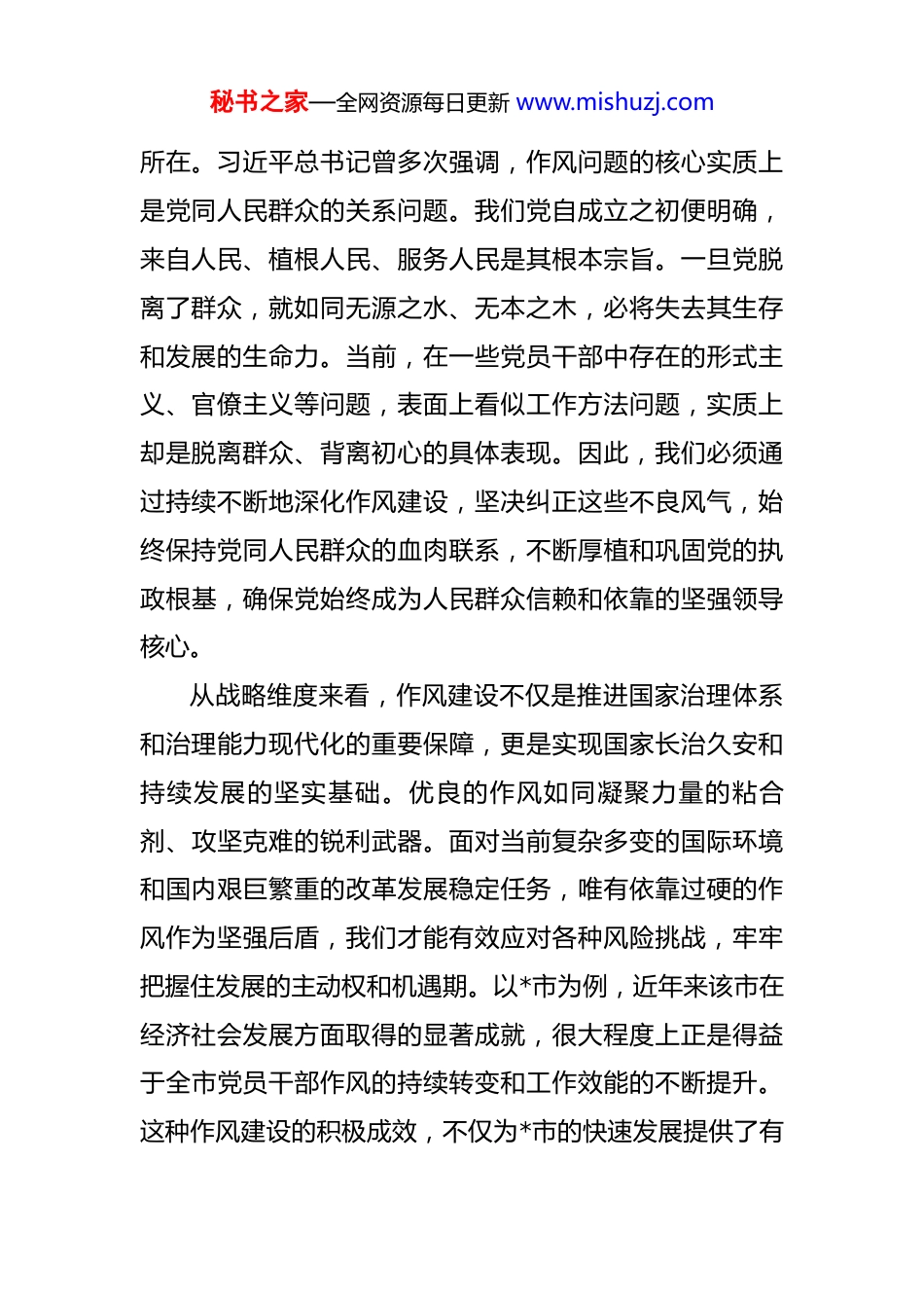 秘书之家—全网资源每日更新 www.mishuzj.com党课:常学常思笃做笃行,以扎实作风建设推进党风政风持续向好 同志们:今天我们齐聚一堂,围绕深入贯彻纪律规定精神、加强党的作风建设这一主题进行学习交流。作风建设关系党的形象,关系人心向背,关系事业兴衰。党的十八大以来,以习近平同志为核心的党中央以巨大政治勇气和历史担当推进全面从严治党,纪律规定的出台和实施,开启了中国共产党激浊扬清、自我革命的历史新篇章。我们必须深刻认识加强作风建设的极端重要性,以永远在路上的执着,将作风建设不断引向深入。一、深刻把握习近平总书记关于加强党的作风建设重要论述的时代意义习近平总书记围绕党的作风建设发表一系列重要论述,立意高远、思想深邃、内涵丰富,是推进新时代党的作风建设的根本遵循和行动指南。这些重要论述深刻回答了为什么要加强作风建设、怎样加强作风建设等重大理论和实践问题,具有极强的政治性、思想性、指导性。从政治维度来看,作风建设不仅是践行党的初心使命的本质要求,更是确保党始终保持先进性和纯洁性的关键秘书之家—全网资源每日更新 www.mishuzj.com所在。习近平总书记曾多次强调,作风问题的核心实质上是党同人民群众的关系问题。我们党自成立之初便明确,来自人民、植根人民、服务人民是其根本宗旨。一旦党脱离了群众,就如同无源之水、无本之木,必将失去其生存和发展的生命力。当前,在一些党员干部中存在的形式主义、官僚主义等问题,表面上看似工作方法问题,实质上却是脱离群众、背离初心的具体表现。因此,我们必须通过持续不断地深化作风建设,坚决纠正这些不良风气,始终保持党同人民群众的血肉联系,不断厚植和巩固党的执政根基,确保党始终成为人民群众信赖和依靠的坚强领导核心。从战略维度来看,作风建设不仅是推进国家治理体系和治理能力现代化的重要保障,更是实现国家长治久安和持续发展的坚实基础。优良的作风如同凝聚力量的粘合剂、攻坚克难的锐利武器。面对当前复杂多变的国际环境和国内艰巨繁重的改革发展稳定任务,唯有依靠过硬的作风作为坚强后盾,我们才能有效应对各种风险挑战,牢牢把握住发展的主动权和机遇期。以*市为例,近年来该市在经济社会发展方面取得的显著成就,很大程度上正是得益于全市党员干部作风的持续转变和工作效能的不断提升。这种作风建设的积极成效,不仅为*市的快速发展提供了有秘书之家—全网资源每日更新 www.mishuzj.com力支撑,也为其他地区提供了可借鉴的成功经验。从实践维度来看,作风建设不仅是推动各项事业高质量发展的迫切需要,更是提升工作实效和群众满意度的关键举措。一个地区、一个部门的工作成效如何,往往与干部队伍的作风状况密切相关。以*市卫生健康委为例,该部门承担着保障人民群众健康的重要职责,其作风建设的成效直接关系到医疗服务的质量和群众的满意度。如果作风不正、效率低下,不仅会影响卫生健康事业的发展,更会损害群众的切身利益。因此,必须通过进一步加强作风建设,提振干部队伍的精气神,提高工作的执行力和落实力,以优良的作风推动卫生健康事业实现更高质量的发展,切实提升人民群众的获得感和幸福感。二、全面领会习近平总书记关于加强党的作风建设重要论述的丰富内涵习近平总书记关于加强党的作风建设的重要论述,系统完整、逻辑严密,集中体现在以下几个方面:始终坚持人民至上的根本立场。习近平总书记深刻指出,要始终把人民放在心中最高位置,坚定不移地坚持一切为了人民、一切依靠人民的基本原则。这一重要论述不仅明确了作风建设的核心价值取向,也指明了我们工作的最终目标追求。在卫生健康工作中,我们必须牢固树立以秘书之家—全网资源每日更新 www.mishuzj.com人民健康为中心的发展思想,全心全意致力于解决广大群众在看病就医过程中遇到的各类急难愁盼问题。今年以来,*市卫生健康系统积极响应号召,通过深入开展“改善就医感受提升患者体验”的主题活动,扎实推进*项便民服务措施的落地实施,取得了显著成效,患者满意度较去年同期大幅提升了*个百分点。始终保持求真务实的优良作风。习近平总书记反复强调,空谈误国、实干兴邦,要...