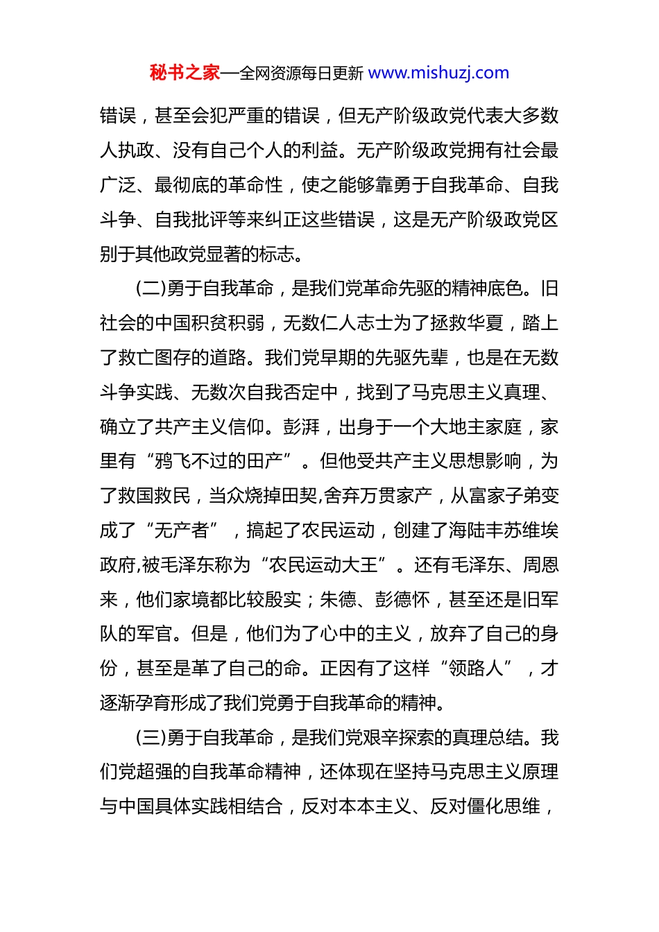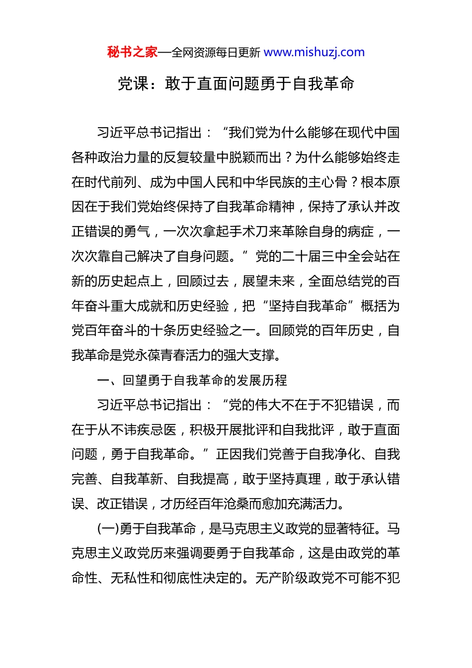 秘书之家—全网资源每日更新 www.mishuzj.com党课:敢于直面问题勇于自我革命 习近平总书记指出:“我们党为什么能够在现代中国各种政治力量的反复较量中脱颖而出?为什么能够始终走在时代前列、成为中国人民和中华民族的主心骨?根本原因在于我们党始终保持了自我革命精神,保持了承认并改正错误的勇气,一次次拿起手术刀来革除自身的病症,一次次靠自己解决了自身问题。”党的二十届三中全会站在新的历史起点上,回顾过去,展望未来,全面总结党的百年奋斗重大成就和历史经验,把“坚持自我革命”概括为党百年奋斗的十条历史经验之一。回顾党的百年历史,自我革命是党永葆青春活力的强大支撑。一、回望勇于自我革命的发展历程习近平总书记指出:“党的伟大不在于不犯错误,而在于从不讳疾忌医,积极开展批评和自我批评,敢于直面问题,勇于自我革命。”正因我们党善于自我净化、自我完善、自我革新、自我提高,敢于坚持真理,敢于承认错误、改正错误,才历经百年沧桑而愈加充满活力。(一)勇于自我革命,是马克思主义政党的显著特征。马克思主义政党历来强调要勇于自我革命,这是由政党的革命性、无私性和彻底性决定的。无产阶级政党不可能不犯秘书之家—全网资源每日更新 www.mishuzj.com错误,甚至会犯严重的错误,但无产阶级政党代表大多数人执政、没有自己个人的利益。无产阶级政党拥有社会最广泛、最彻底的革命性,使之能够靠勇于自我革命、自我斗争、自我批评等来纠正这些错误,这是无产阶级政党区别于其他政党显著的标志。(二)勇于自我革命,是我们党革命先驱的精神底色。旧社会的中国积贫积弱,无数仁人志士为了拯救华夏,踏上了救亡图存的道路。我们党早期的先驱先辈,也是在无数斗争实践、无数次自我否定中,找到了马克思主义真理、确立了共产主义信仰。彭湃,出身于一个大地主家庭,家里有“鸦飞不过的田产”。但他受共产主义思想影响,为了救国救民,当众烧掉田契,舍弃万贯家产,从富家子弟变成了“无产者”,搞起了农民运动,创建了海陆丰苏维埃政府,被毛泽东称为“农民运动大王”。还有毛泽东、周恩来,他们家境都比较殷实;朱德、彭德怀,甚至还是旧军队的军官。但是,他们为了心中的主义,放弃了自己的身份,甚至是革了自己的命。正因有了这样“领路人”,才逐渐孕育形成了我们党勇于自我革命的精神。(三)勇于自我革命,是我们党艰辛探索的真理总结。我们党超强的自我革命精神,还体现在坚持马克思主义原理与中国具体实践相结合,反对本本主义、反对僵化思维,秘书之家—全网资源每日更新 www.mishuzj.com不断纠正“左”和“右”两个方面的严重错误,坚持走在自己的路上。建军之初,我们效仿俄国十月革命经验,希望走一条以城市为中心、武装暴动夺取政权的革命道路。但南昌起义、秋收起义、广州起义等以占领城市为目的起义接连失败后,我们的党逐渐认识到这条路并不适合中国的国情。以井冈山革命根据地为代表的一大批农村革命根据地建立起来,各地的星星之火,渐呈燎原之势。此后,第五次“反围剿”的失败、长征途中湘江战役等战斗失利,让我们党进一步醒悟了无论是“左倾”还是“右倾”机会主义,都会葬送中国革命的前途。具有伟大转折意义的遵义会议上,我们的党与共产国际联系中断,中国共产党的领导者们第一次运用马克思主义原理,结合中国革命具体情况,解决自己的路线、方针、政策的问题,自此走上了从胜利走向胜利的道路。(四)勇于自我革命,是我们党永葆活力的制胜秘诀。先进的马克思主义政党不是天生的,而是在不断自我革命中淬炼而成的。党历经百年沧桑更加充满活力,其奥秘就在于始终坚持真理、修正错误。全国革命胜利前夕,毛主席在党的七届二中全会上提出“两个务必”,强调“中国的革命是伟大的,但革命以后的路程更长,工作更伟大,更艰苦”,要求全党继续保持和发扬革命精神;改革开放以秘书之家—全网资源每日更新 www.mishuzj.com后,邓小平强调要“发扬革命和拼命精神”。习近平总书记强调:“我们千万不能在一片喝彩声、赞扬声中失去了革命精神,逐渐进入一种安于现状、不思进取、不敢斗争、贪图享乐的状态。如果那样,对我们党来说就是...
