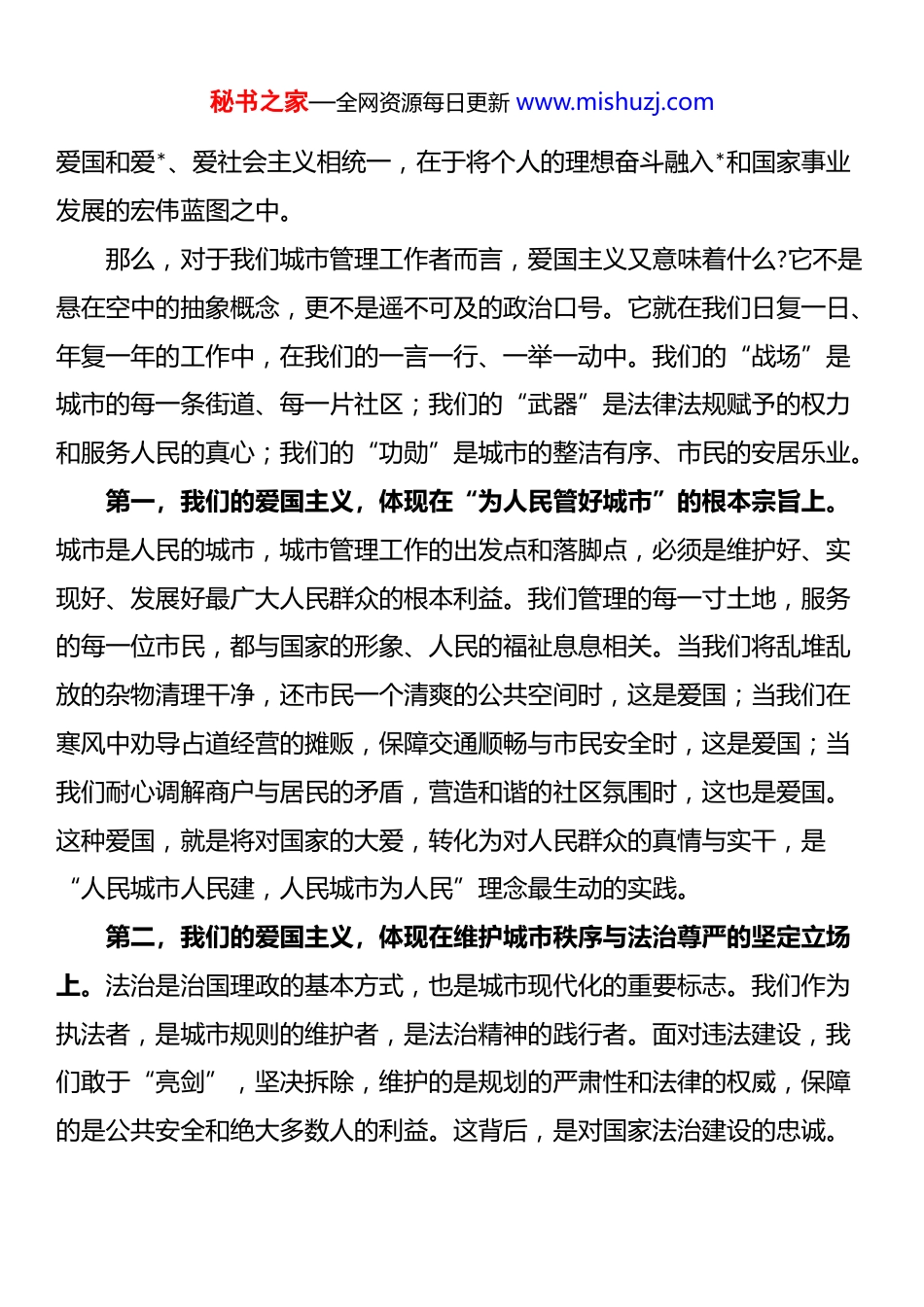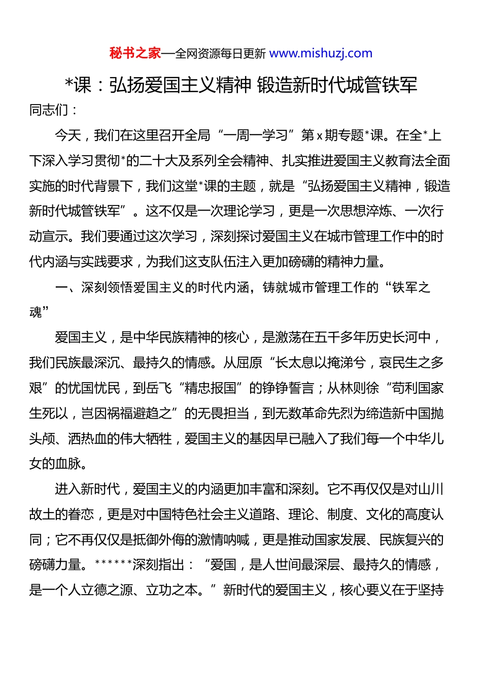 秘书之家—全网资源每日更新 www.mishuzj.com*课:弘扬爱国主义精神 锻造新时代城管铁军同志们:今天,我们在这里召开全局“一周一学习”第 x 期专题*课。在全*上下深入学习贯彻*的二十大及系列全会精神、扎实推进爱国主义教育法全面实施的时代背景下,我们这堂*课的主题,就是“弘扬爱国主义精神,锻造新时代城管铁军”。这不仅是一次理论学习,更是一次思想淬炼、一次行动宣示。我们要通过这次学习,深刻探讨爱国主义在城市管理工作中的时代内涵与实践要求,为我们这支队伍注入更加磅礴的精神力量。一、深刻领悟爱国主义的时代内涵,铸就城市管理工作的“铁军之魂”爱国主义,是中华民族精神的核心,是激荡在五千多年历史长河中,我们民族最深沉、最持久的情感。从屈原“长太息以掩涕兮,哀民生之多艰”的忧国忧民,到岳飞“精忠报国”的铮铮誓言;从林则徐“苟利国家生死以,岂因祸福避趋之”的无畏担当,到无数革命先烈为缔造新中国抛头颅、洒热血的伟大牺牲,爱国主义的基因早已融入了我们每一个中华儿女的血脉。进入新时代,爱国主义的内涵更加丰富和深刻。它不再仅仅是对山川故土的眷恋,更是对中国特色社会主义道路、理论、制度、文化的高度认同;它不再仅仅是抵御外侮的激情呐喊,更是推动国家发展、民族复兴的磅礴力量。******深刻指出:“爱国,是人世间最深层、最持久的情感,是一个人立德之源、立功之本。”新时代的爱国主义,核心要义在于坚持秘书之家—全网资源每日更新 www.mishuzj.com爱国和爱*、爱社会主义相统一,在于将个人的理想奋斗融入*和国家事业发展的宏伟蓝图之中。那么,对于我们城市管理工作者而言,爱国主义又意味着什么?它不是悬在空中的抽象概念,更不是遥不可及的政治口号。它就在我们日复一日、年复一年的工作中,在我们的一言一行、一举一动中。我们的“战场”是城市的每一条街道、每一片社区;我们的“武器”是法律法规赋予的权力和服务人民的真心;我们的“功勋”是城市的整洁有序、市民的安居乐业。第一,我们的爱国主义,体现在“为人民管好城市”的根本宗旨上。城市是人民的城市,城市管理工作的出发点和落脚点,必须是维护好、实现好、发展好最广大人民群众的根本利益。我们管理的每一寸土地,服务的每一位市民,都与国家的形象、人民的福祉息息相关。当我们将乱堆乱放的杂物清理干净,还市民一个清爽的公共空间时,这是爱国;当我们在寒风中劝导占道经营的摊贩,保障交通顺畅与市民安全时,这是爱国;当我们耐心调解商户与居民的矛盾,营造和谐的社区氛围时,这也是爱国。这种爱国,就是将对国家的大爱,转化为对人民群众的真情与实干,是“人民城市人民建,人民城市为人民”理念最生动的实践。第二,我们的爱国主义,体现在维护城市秩序与法治尊严的坚定立场上。法治是治国理政的基本方式,也是城市现代化的重要标志。我们作为执法者,是城市规则的维护者,是法治精神的践行者。面对违法建设,我们敢于“亮剑”,坚决拆除,维护的是规划的严肃性和法律的权威,保障的是公共安全和绝大多数人的利益。这背后,是对国家法治建设的忠诚。秘书之家—全网资源每日更新 www.mishuzj.com面对市容环境的顽瘴痼疾,我们持之以恒地整治,守护的是城市的“面子”和“里子”,提升的是城市的品位和竞争力。这背后,是对国家整体形象的珍视。我们每一次公正、文明的执法,都是在为国家的法治大厦添砖加瓦,都是在向社会传递公平正义的坚定信号。第三,我们的爱国主义,体现在推动城市高质量发展的使命担当上。当前,我国正处在从高速增长转向高质量发展的新阶段。一座城市的管理水平,直接关系到它的发展潜力和核心竞争力。我们通过精细化管理,让城市环境更优美、功能更完善、运行更高效,就是在为优化营商环境、吸引人才资本、推动经济社会发展贡献力量。从规范共享单车停放,到着力解决停车难问题;从治理油烟噪音污染,到保障城市生命线安全运行,我们工作的每一个环节,都与城市的发展脉搏同频共振。把我们的城市建设得更美好、更宜居、更具活力,就是对实现中华民族伟大复兴中国梦最直接、最具体的贡献。因此,我们必须深刻认识到,城管工...