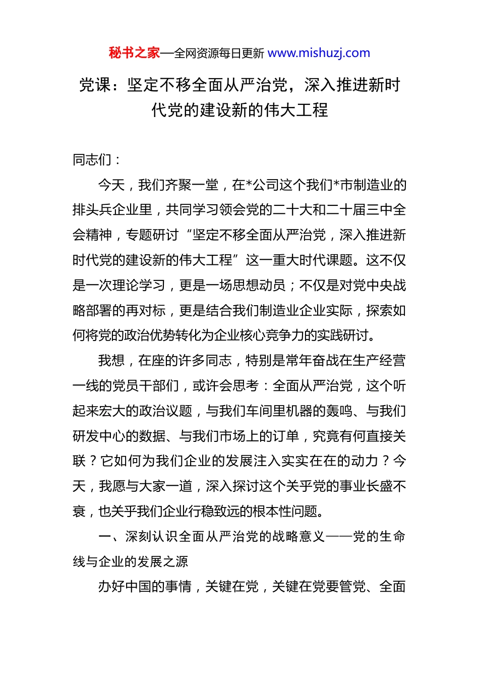 秘书之家—全网资源每日更新 www.mishuzj.com党课:坚定不移全面从严治党,深入推进新时代党的建设新的伟大工程 同志们:今天,我们齐聚一堂,在*公司这个我们*市制造业的排头兵企业里,共同学习领会党的二十大和二十届三中全会精神,专题研讨“坚定不移全面从严治党,深入推进新时代党的建设新的伟大工程”这一重大时代课题。这不仅是一次理论学习,更是一场思想动员;不仅是对党中央战略部署的再对标,更是结合我们制造业企业实际,探索如何将党的政治优势转化为企业核心竞争力的实践研讨。我想,在座的许多同志,特别是常年奋战在生产经营一线的党员干部们,或许会思考:全面从严治党,这个听起来宏大的政治议题,与我们车间里机器的轰鸣、与我们研发中心的数据、与我们市场上的订单,究竟有何直接关联?它如何为我们企业的发展注入实实在在的动力?今天,我愿与大家一道,深入探讨这个关乎党的事业长盛不衰,也关乎我们企业行稳致远的根本性问题。一、深刻认识全面从严治党的战略意义——党的生命线与企业的发展之源办好中国的事情,关键在党,关键在党要管党、全面秘书之家—全网资源每日更新 www.mishuzj.com从严治党。尤其是一些党员干部中发生的贪污腐败、脱离群众、形式主义、官僚主义等问题,必须下大气力解决。全党必须警醒起来。”这番话语,振聋发聩,拉开了新时代全面从严治党的序幕。为什么要“全面从严”?因为这是我们党跳出治乱兴衰历史周期率的第二个答案。毛泽东同志在“窑洞对”中给出了第一个答案,那就是让人民来监督政府。经过百年奋斗特别是新时代十年的伟大变革,我们党又给出了第二个答案,那就是自我革命。全面从严治党,就是推进自我革命的伟大实践。它如同人体的免疫系统,不断清除侵蚀党的健康肌体的病毒,确保我们党始终不变质、不变色、不变味,始终成为中国特色社会主义事业的坚强领导核心。那么,这一党的“生命线工程”,如何成为企业的“发展源动力”?我认为,二者在底层逻辑上是高度统一的。全面从严治党,锻造的是纪律严明、步调一致、能打硬仗的组织。而一个现代化的制造企业,要在激烈的全球市场竞争中脱颖而出,所需要的恰恰也是这样一种组织。第一,全面从严治党锻造的“纪律性”,是保障企业高质量生产的“生命线”。制造业的根基是质量,质量的保障是标准,标准的执行靠纪律。生产线上的任何一个疏忽、任何一次违规操作,都可能导致产品质量的重大瑕秘书之家—全网资源每日更新 www.mishuzj.com疵,甚至引发安全生产事故。全面从严治党,要求党员干部带头讲规矩、守纪律,这种纪律意识会自然而然地渗透到生产管理的每一个环节。当我们强调党纪的刚性约束时,也在无形中强化了工艺纪律、安全纪律、质量纪律。一个在政治上守纪律、讲规矩的团队,在生产经营中也必然是一个令行禁止、精益求精的团队。第二,全面从严治党塑造的“战斗力”,是驱动企业技术创新与市场开拓的“发动机”。当前,新一轮科技革命和产业变革深入发展,制造业的竞争,早已不是单纯的规模和成本之争,而是技术、品牌和产业链的综合角力。攻克“卡脖子”技术、开拓新兴市场,哪一项不是难啃的硬骨头?这就需要一支有信仰、有担当、敢于冲锋陷阵的队伍。全面从严治党,通过强化理想信念教育,通过激励干部担当作为,正是要打造这样一支“平常时候看得出来、关键时刻站得出来、危难关头豁得出来”的先锋队。这支队伍,在企业里就是我们的党员技术骨干、党员销售尖兵、党员管理中坚。第三,全面从严治党营造的“清廉风”,是筑牢企业健康持续发展根基的“压舱石”。一个企业如果内部管理混乱,采购、销售、财务等关键岗位存在“寻租”空间,那么它的成本就会无形中增加,创新动力就会被侵蚀,市秘书之家—全网资源每日更新 www.mishuzj.com场信誉就会受损。这就像一艘船,无论外表多么光鲜,只要船体内部有了蛀虫,就终有倾覆的危险。全面从严治党,坚持有腐必反、有贪必肃,在党内形成强大震慑,将这种清廉文化延伸到企业治理中,就是要构建一套严密的内部监督和风险防控体系。通过健全制度、堵塞漏洞、强化审计,我们可以最大程度地杜绝“跑冒滴漏”,确保企...