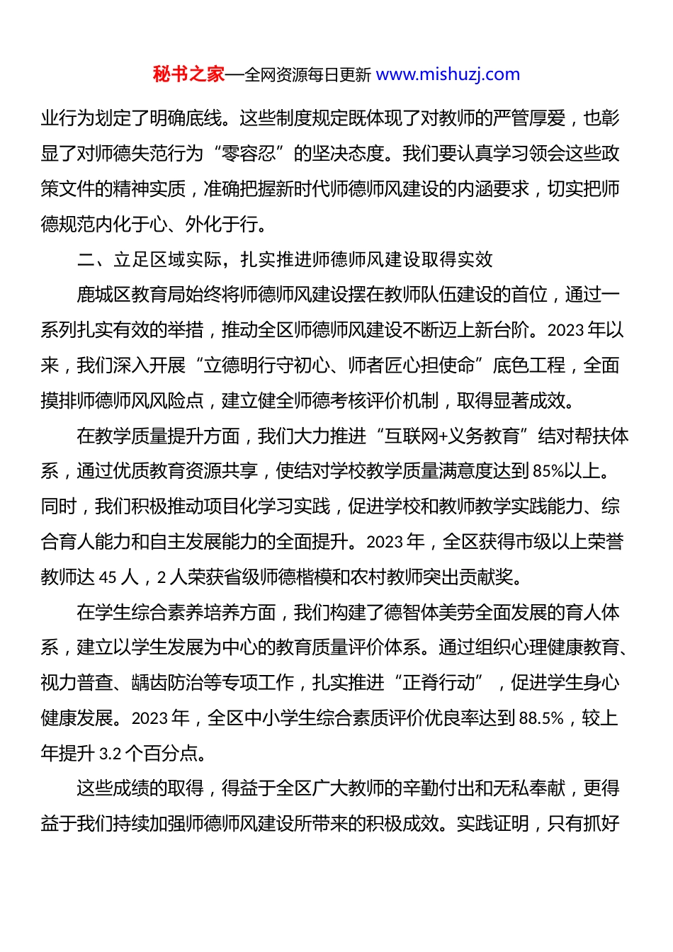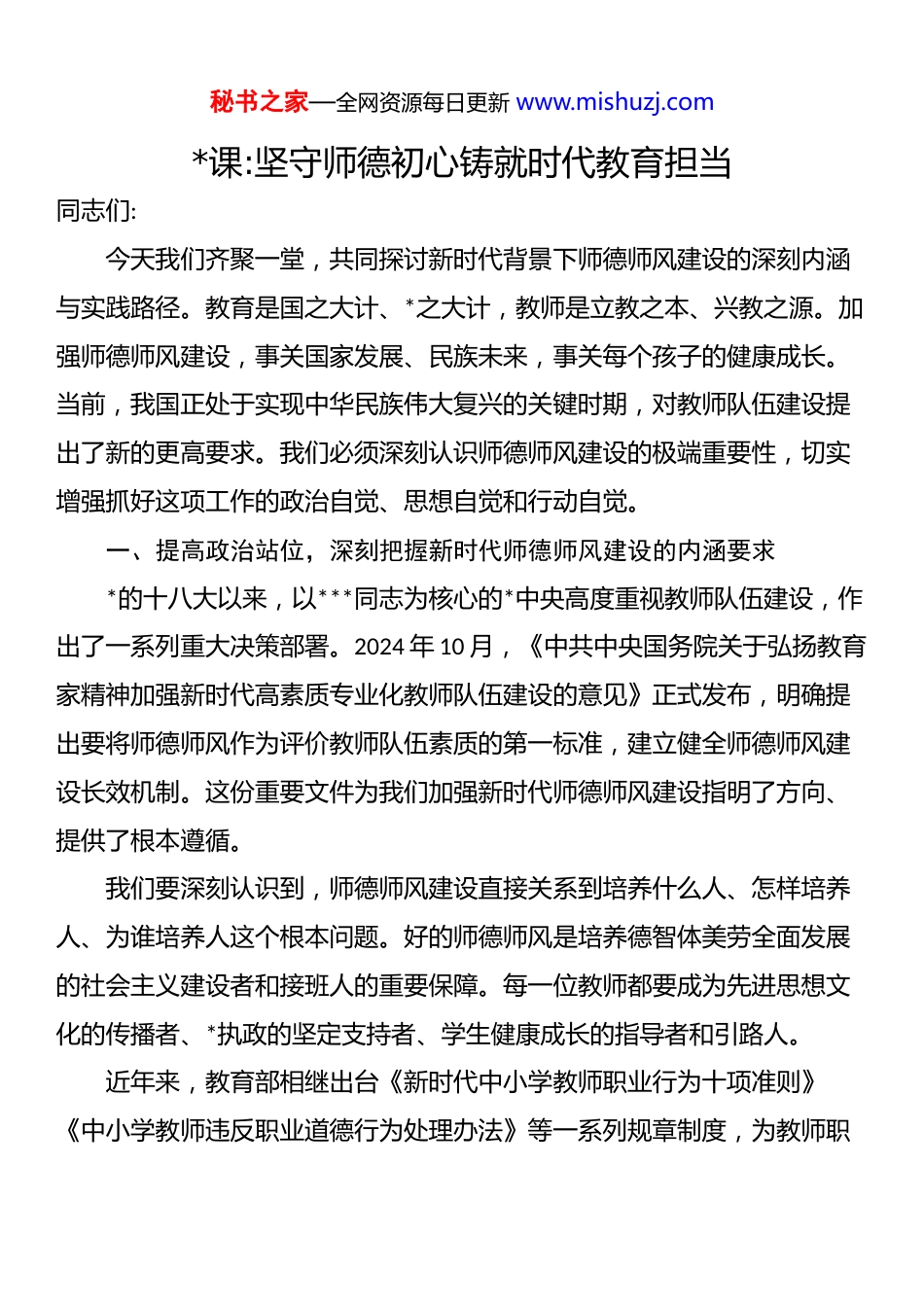 秘书之家—全网资源每日更新 www.mishuzj.com*课:坚守师德初心铸就时代教育担当同志们:今天我们齐聚一堂,共同探讨新时代背景下师德师风建设的深刻内涵与实践路径。教育是国之大计、*之大计,教师是立教之本、兴教之源。加强师德师风建设,事关国家发展、民族未来,事关每个孩子的健康成长。当前,我国正处于实现中华民族伟大复兴的关键时期,对教师队伍建设提出了新的更高要求。我们必须深刻认识师德师风建设的极端重要性,切实增强抓好这项工作的政治自觉、思想自觉和行动自觉。一、提高政治站位,深刻把握新时代师德师风建设的内涵要求*的十八大以来,以***同志为核心的*中央高度重视教师队伍建设,作出了一系列重大决策部署。2024 年 10 月,《中共中央国务院关于弘扬教育家精神加强新时代高素质专业化教师队伍建设的意见》正式发布,明确提出要将师德师风作为评价教师队伍素质的第一标准,建立健全师德师风建设长效机制。这份重要文件为我们加强新时代师德师风建设指明了方向、提供了根本遵循。我们要深刻认识到,师德师风建设直接关系到培养什么人、怎样培养人、为谁培养人这个根本问题。好的师德师风是培养德智体美劳全面发展的社会主义建设者和接班人的重要保障。每一位教师都要成为先进思想文化的传播者、*执政的坚定支持者、学生健康成长的指导者和引路人。近年来,教育部相继出台《新时代中小学教师职业行为十项准则》《中小学教师违反职业道德行为处理办法》等一系列规章制度,为教师职秘书之家—全网资源每日更新 www.mishuzj.com业行为划定了明确底线。这些制度规定既体现了对教师的严管厚爱,也彰显了对师德失范行为“零容忍”的坚决态度。我们要认真学习领会这些政策文件的精神实质,准确把握新时代师德师风建设的内涵要求,切实把师德规范内化于心、外化于行。二、立足区域实际,扎实推进师德师风建设取得实效鹿城区教育局始终将师德师风建设摆在教师队伍建设的首位,通过一系列扎实有效的举措,推动全区师德师风建设不断迈上新台阶。2023 年以来,我们深入开展“立德明行守初心、师者匠心担使命”底色工程,全面摸排师德师风风险点,建立健全师德考核评价机制,取得显著成效。在教学质量提升方面,我们大力推进“互联网+义务教育”结对帮扶体系,通过优质教育资源共享,使结对学校教学质量满意度达到 85%以上。同时,我们积极推动项目化学习实践,促进学校和教师教学实践能力、综合育人能力和自主发展能力的全面提升。2023 年,全区获得市级以上荣誉教师达 45 人,2 人荣获省级师德楷模和农村教师突出贡献奖。在学生综合素养培养方面,我们构建了德智体美劳全面发展的育人体系,建立以学生发展为中心的教育质量评价体系。通过组织心理健康教育、视力普查、龋齿防治等专项工作,扎实推进“正脊行动”,促进学生身心健康发展。2023 年,全区中小学生综合素质评价优良率达到 88.5%,较上年提升 3.2 个百分点。这些成绩的取得,得益于全区广大教师的辛勤付出和无私奉献,更得益于我们持续加强师德师风建设所带来的积极成效。实践证明,只有抓好秘书之家—全网资源每日更新 www.mishuzj.com师德师风这个根本,才能为教育高质量发展提供坚强保障。三、坚持德法并举,严守师德红线筑牢育人底线师德师风建设既要靠教育引导,也要靠制度约束。我们要坚持德法并举的原则,既要发挥道德教化作用,又要强化法治保障功能。一方面,要加强师德教育,引导教师自觉践行社会主义核心价值观,弘扬中华优秀传统文化,传承红色基因,牢固树立正确的历史观、民族观、国家观、文化观。要组织教师深入学习《中国共产 dj 律处分条例》和《新时代中小学教师职业行为十项准则》,明确师德“红线”不容触碰。通过开展形式多样的师德教育活动,增强教师的责任感、使命感和荣誉感。另一方面,要健全师德考核机制,将师德表现作为教师资格认定、职称评审、岗位聘用、评优奖励等的首要内容。要建立师德失范行为通报警示制度,对违反师德规范的行为实行“一票否决”。要完善师德投诉举报渠道,建立健全调查核实机制,做到有诉必查、有查必果、有果必复。在这里,我要特别强调几...