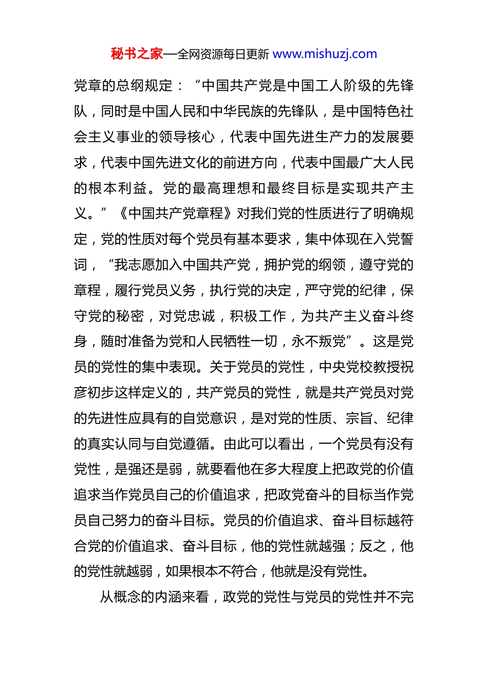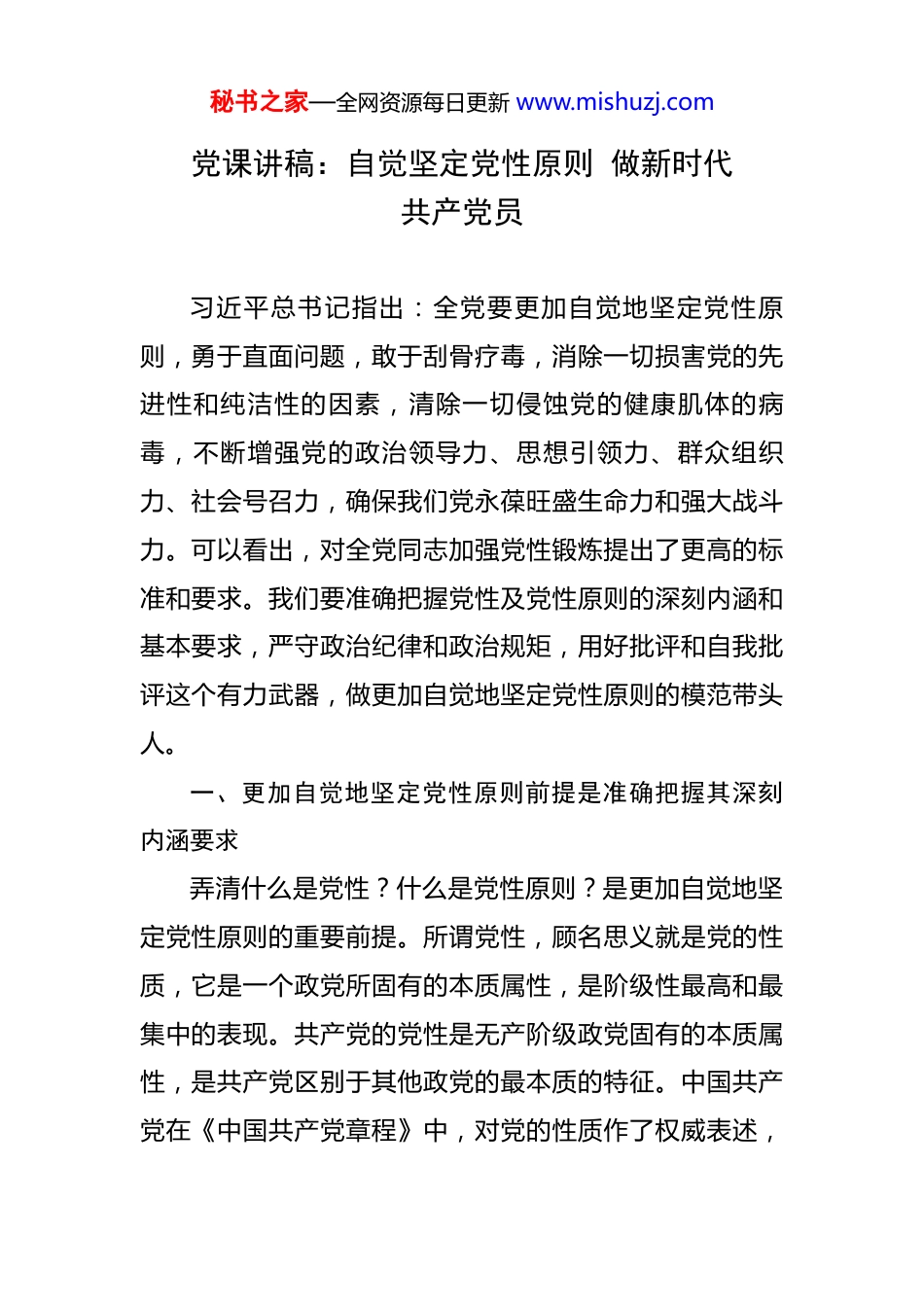 秘书之家—全网资源每日更新 www.mishuzj.com党课讲稿:自觉坚定党性原则 做新时代共产党员 习近平总书记指出:全党要更加自觉地坚定党性原则,勇于直面问题,敢于刮骨疗毒,消除一切损害党的先进性和纯洁性的因素,清除一切侵蚀党的健康肌体的病毒,不断增强党的政治领导力、思想引领力、群众组织力、社会号召力,确保我们党永葆旺盛生命力和强大战斗力。可以看出,对全党同志加强党性锻炼提出了更高的标准和要求。我们要准确把握党性及党性原则的深刻内涵和基本要求,严守政治纪律和政治规矩,用好批评和自我批评这个有力武器,做更加自觉地坚定党性原则的模范带头人。一、更加自觉地坚定党性原则前提是准确把握其深刻内涵要求弄清什么是党性?什么是党性原则?是更加自觉地坚定党性原则的重要前提。所谓党性,顾名思义就是党的性质,它是一个政党所固有的本质属性,是阶级性最高和最集中的表现。共产党的党性是无产阶级政党固有的本质属性,是共产党区别于其他政党的最本质的特征。中国共产党在《中国共产党章程》中,对党的性质作了权威表述,秘书之家—全网资源每日更新 www.mishuzj.com党章的总纲规定:“中国共产党是中国工人阶级的先锋队,同时是中国人民和中华民族的先锋队,是中国特色社会主义事业的领导核心,代表中国先进生产力的发展要求,代表中国先进文化的前进方向,代表中国最广大人民的根本利益。党的最高理想和最终目标是实现共产主义。”《中国共产党章程》对我们党的性质进行了明确规定,党的性质对每个党员有基本要求,集中体现在入党誓词,“我志愿加入中国共产党,拥护党的纲领,遵守党的章程,履行党员义务,执行党的决定,严守党的纪律,保守党的秘密,对党忠诚,积极工作,为共产主义奋斗终身,随时准备为党和人民牺牲一切,永不叛党”。这是党员的党性的集中表现。关于党员的党性,中央党校教授祝彦初步这样定义的,共产党员的党性,就是共产党员对党的先进性应具有的自觉意识,是对党的性质、宗旨、纪律的真实认同与自觉遵循。由此可以看出,一个党员有没有党性,是强还是弱,就要看他在多大程度上把政党的价值追求当作党员自己的价值追求,把政党奋斗的目标当作党员自己努力的奋斗目标。党员的价值追求、奋斗目标越符合党的价值追求、奋斗目标,他的党性就越强;反之,他的党性就越弱,如果根本不符合,他就是没有党性。从概念的内涵来看,政党的党性与党员的党性并不完秘书之家—全网资源每日更新 www.mishuzj.com全一致,但它们是密不可分的,这里要说明三点:首先,政党的党性决定着党员的党性。政党的党性为党员的党性提供了基本原则或规范化要求,比如说,要求党员对党忠诚,要有组织纪律性,要以先进性的标准要求自己,等等,没有政党的党性,党员的党性就是空洞的,就是抽象的。其次,党员是政党的生命有机体。党员是政党肌体的细胞和政党活动的主体,政党组织的党性归根结底要在党员个体的党性中表现出来。最后,党员的个性要统一于党性之中。关于党员的个性与党性的关系,毛泽东同志在党的七大政治报告中指出:“讲到个性与党性,党性就是普遍性,个性就是特殊性。没有一种普遍性不是建筑在特殊性的基础上的。没有特殊性哪里有普遍性?没有党员的个性,哪里有党性?党性是共同的性质、普遍的性质,全党每一个人都有的性质。”毛泽东同志的论述强调了党性是每一个党员都必须具备的,个性要体现党性。我们党历来十分重视党性问题。毛泽东同志在党的七大上指出:“一致的行动,一致的意见,集体主义,就是党性。我们要使许多自觉的个性集中起来,对一定的问题、一定的事情采取一致的行动、一致的意见,有统一的意志,这是我们的党性所要求的。”由此可知,如果党员不服从组织、不服从中央、不执行中央的决策、不遵守党秘书之家—全网资源每日更新 www.mishuzj.com规党纪,就是不讲党性。抗日战争时期,为了解决一部分党员尤其是少数高级领导干部的思想和行为中存在独立主义、分散主义、个人英雄主义等问题,我们党在 1941 年 7月 1 日通过了《中共中央关于增强党性的决定》,有力促进了党的事业发展。这是建党以来第一个,也是迄今...