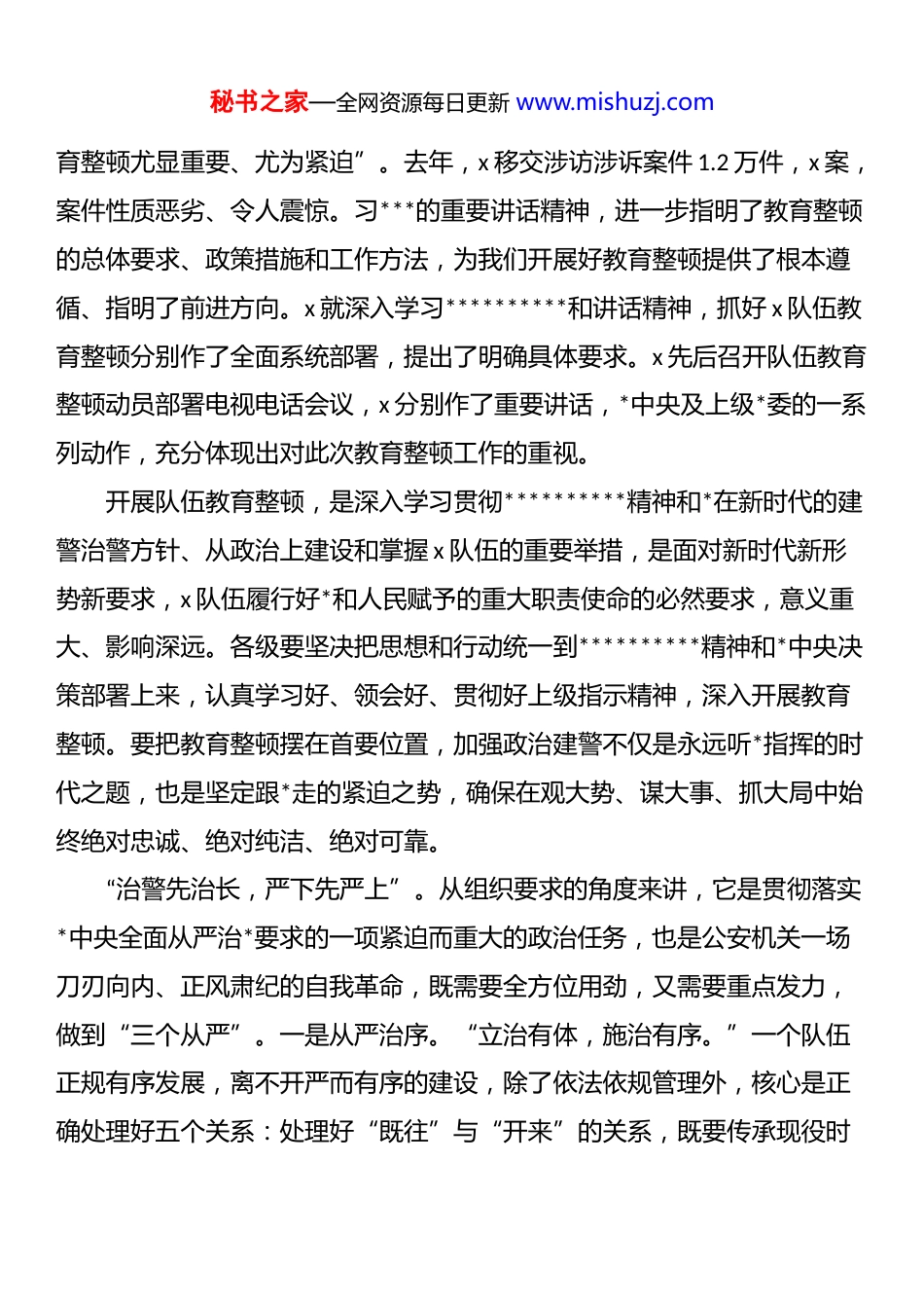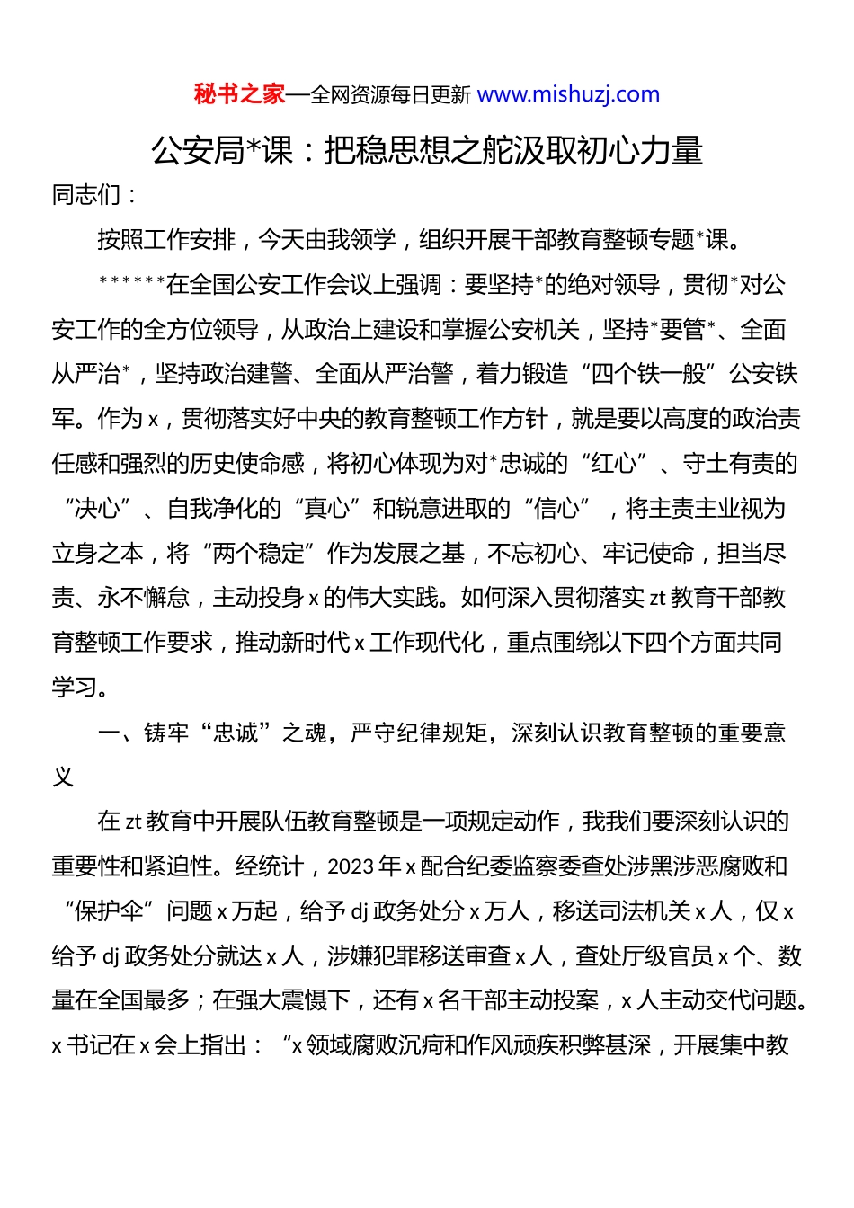 秘书之家—全网资源每日更新 www.mishuzj.com公安局*课:把稳思想之舵汲取初心力量同志们:按照工作安排,今天由我领学,组织开展干部教育整顿专题*课。******在全国公安工作会议上强调:要坚持*的绝对领导,贯彻*对公安工作的全方位领导,从政治上建设和掌握公安机关,坚持*要管*、全面从严治*,坚持政治建警、全面从严治警,着力锻造“四个铁一般”公安铁军。作为 x,贯彻落实好中央的教育整顿工作方针,就是要以高度的政治责任感和强烈的历史使命感,将初心体现为对*忠诚的“红心”、守土有责的“决心”、自我净化的“真心”和锐意进取的“信心”,将主责主业视为立身之本,将“两个稳定”作为发展之基,不忘初心、牢记使命,担当尽责、永不懈怠,主动投身 x 的伟大实践。如何深入贯彻落实 zt 教育干部教育整顿工作要求,推动新时代 x 工作现代化,重点围绕以下四个方面共同学习。一、铸牢“忠诚”之魂,严守纪律规矩,深刻认识教育整顿的重要意义在 zt 教育中开展队伍教育整顿是一项规定动作,我我们要深刻认识的重要性和紧迫性。经统计,2023 年 x 配合纪委监察委查处涉黑涉恶腐败和“保护伞”问题 x 万起,给予 dj 政务处分 x 万人,移送司法机关 x 人,仅 x给予 dj 政务处分就达 x 人,涉嫌犯罪移送审查 x 人,查处厅级官员 x 个、数量在全国最多;在强大震慑下,还有 x 名干部主动投案,x 人主动交代问题。x 书记在 x 会上指出:“x 领域腐败沉疴和作风顽疾积弊甚深,开展集中教秘书之家—全网资源每日更新 www.mishuzj.com育整顿尤显重要、尤为紧迫”。去年,x 移交涉访涉诉案件 1.2 万件,x 案,案件性质恶劣、令人震惊。习***的重要讲话精神,进一步指明了教育整顿的总体要求、政策措施和工作方法,为我们开展好教育整顿提供了根本遵循、指明了前进方向。x 就深入学习**********和讲话精神,抓好 x 队伍教育整顿分别作了全面系统部署,提出了明确具体要求。x 先后召开队伍教育整顿动员部署电视电话会议,x 分别作了重要讲话,*中央及上级*委的一系列动作,充分体现出对此次教育整顿工作的重视。开展队伍教育整顿,是深入学习贯彻**********精神和*在新时代的建警治警方针、从政治上建设和掌握 x 队伍的重要举措,是面对新时代新形势新要求,x 队伍履行好*和人民赋予的重大职责使命的必然要求,意义重大、影响深远。各级要坚决把思想和行动统一到**********精神和*中央决策部署上来,认真学习好、领会好、贯彻好上级指示精神,深入开展教育整顿。要把教育整顿摆在首要位置,加强政治建警不仅是永远听*指挥的时代之题,也是坚定跟*走的紧迫之势,确保在观大势、谋大事、抓大局中始终绝对忠诚、绝对纯洁、绝对可靠。“治警先治长,严下先严上”。从组织要求的角度来讲,它是贯彻落实*中央全面从严治*要求的一项紧迫而重大的政治任务,也是公安机关一场刀刃向内、正风肃纪的自我革命,既需要全方位用劲,又需要重点发力,做到“三个从严”。一是从严治序。“立治有体,施治有序。”一个队伍正规有序发展,离不开严而有序的建设,除了依法依规管理外,核心是正确处理好五个关系:处理好“既往”与“开来”的关系,既要传承现役时秘书之家—全网资源每日更新 www.mishuzj.com期工作好的经验做法,更要与时俱进,创新 x 新时期民警思想教育、安全管理、综合保障体系,借助大数据和信息化手段,提高从严治警的实效。为引导各级增强创新意识、培养创新精神、提高创新能力,x 也在探索设立“创新奖”,鼓励各级*组织和全体民警职工发扬首创精神,集智集力探索x 各项工作特色发展路经。处理好“处室”与“全局”的关系,就要跳出某个领域、打破壁垒固障来看全域、谋全局,紧紧围绕中央及上级*委确定的中心任务,跟进从严治警各项措施,保障重大决策部署落实落地;处理好“治标”与“治本”的关系,既要发现整改问题,更要分析研判问题,对经常、反复出现的问题善于把握规律特点,多从制度建设和制度执行层面提出治警建议;处理好“树立权威”与“关爱民警”的关系,从教育、提醒和防微杜渐角度看,从严管理不是与民警过不...