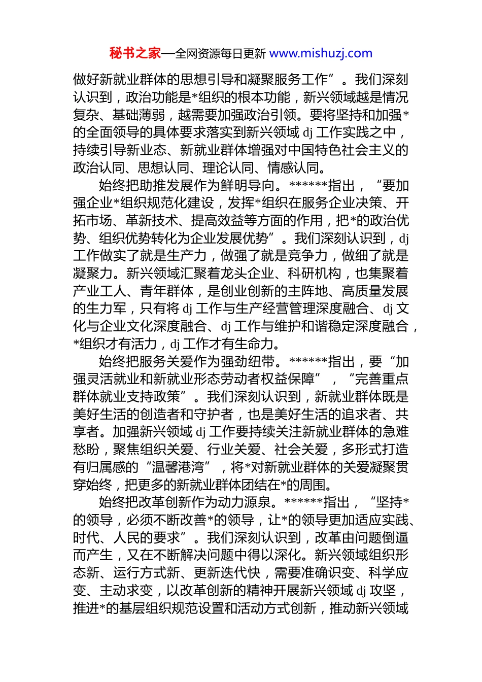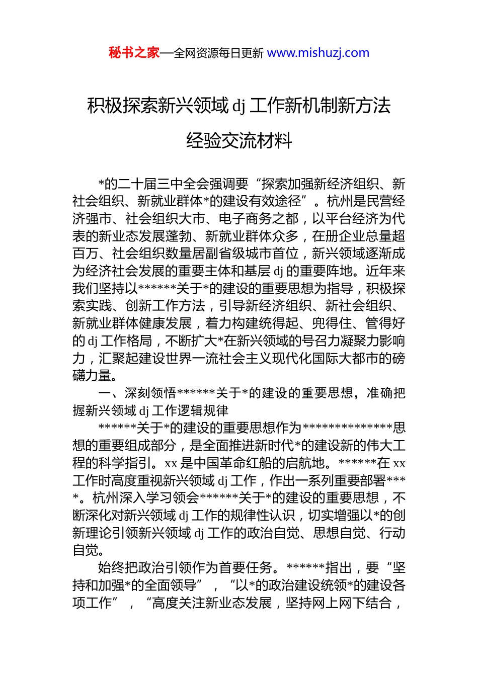 秘书之家—全网资源每日更新 www.mishuzj.com积极探索新兴领域 dj 工作新机制新方法经验交流材料*的二十届三中全会强调要“探索加强新经济组织、新社会组织、新就业群体*的建设有效途径”。杭州是民营经济强市、社会组织大市、电子商务之都,以平台经济为代表的新业态发展蓬勃、新就业群体众多,在册企业总量超百万、社会组织数量居副省级城市首位,新兴领域逐渐成为经济社会发展的重要主体和基层 dj 的重要阵地。近年来我们坚持以******关于*的建设的重要思想为指导,积极探索实践、创新工作方法,引导新经济组织、新社会组织、新就业群体健康发展,着力构建统得起、兜得住、管得好的 dj 工作格局,不断扩大*在新兴领域的号召力凝聚力影响力,汇聚起建设世界一流社会主义现代化国际大都市的磅礴力量。一、深刻领悟******关于*的建设的重要思想,准确把握新兴领域 dj 工作逻辑规律******关于*的建设的重要思想作为**************思想的重要组成部分,是全面推进新时代*的建设新的伟大工程的科学指引。xx 是中国革命红船的启航地。******在 xx工作时高度重视新兴领域 dj 工作,作出一系列重要部署****。杭州深入学习领会******关于*的建设的重要思想,不断深化对新兴领域 dj 工作的规律性认识,切实增强以*的创新理论引领新兴领域 dj 工作的政治自觉、思想自觉、行动自觉。始终把政治引领作为首要任务。******指出,要“坚持和加强*的全面领导”,“以*的政治建设统领*的建设各项工作”,“高度关注新业态发展,坚持网上网下结合,秘书之家—全网资源每日更新 www.mishuzj.com做好新就业群体的思想引导和凝聚服务工作”。我们深刻认识到,政治功能是*组织的根本功能,新兴领域越是情况复杂、基础薄弱,越需要加强政治引领。要将坚持和加强*的全面领导的具体要求落实到新兴领域 dj 工作实践之中,持续引导新业态、新就业群体增强对中国特色社会主义的政治认同、思想认同、理论认同、情感认同。始终把助推发展作为鲜明导向。******指出,“要加强企业*组织规范化建设,发挥*组织在服务企业决策、开拓市场、革新技术、提高效益等方面的作用,把*的政治优势、组织优势转化为企业发展优势”。我们深刻认识到,dj工作做实了就是生产力,做强了就是竞争力,做细了就是凝聚力。新兴领域汇聚着龙头企业、科研机构,也集聚着产业工人、青年群体,是创业创新的主阵地、高质量发展的生力军,只有将 dj 工作与生产经营管理深度融合、dj 文化与企业文化深度融合、dj 工作与维护和谐稳定深度融合,*组织才有活力,dj 工作才有生命力。始终把服务关爱作为强劲纽带。******指出,要“加强灵活就业和新就业形态劳动者权益保障”,“完善重点群体就业支持政策”。我们深刻认识到,新就业群体既是美好生活的创造者和守护者,也是美好生活的追求者、共享者。加强新兴领域 dj 工作要持续关注新就业群体的急难愁盼,聚焦组织关爱、行业关爱、社会关爱,多形式打造有归属感的“温馨港湾”,将*对新就业群体的关爱凝聚贯穿始终,把更多的新就业群体团结在*的周围。始终把改革创新作为动力源泉。******指出,“坚持*的领导,必须不断改善*的领导,让*的领导更加适应实践、时代、人民的要求”。我们深刻认识到,改革由问题倒逼而产生,又在不断解决问题中得以深化。新兴领域组织形态新、运行方式新、更新迭代快,需要准确识变、科学应变、主动求变,以改革创新的精神开展新兴领域 dj 攻坚,推进*的基层组织规范设置和活动方式创新,推动新兴领域秘书之家—全网资源每日更新 www.mishuzj.comdj 工作与时俱进、提能增效。二、以新举措解决新问题,不断深化新兴领域 dj 工作探索实践面对新兴领域*员数量较少、*组织有效覆盖较难、*务工作者队伍较弱等客观实际,我们坚持目标导向和问题导向相统一,以 dj 领航为指引、组织覆盖为基础、作用发挥为路径、问需服务为宗旨,科学运用新理念新方法解决新矛盾新问题,奋力推动新兴领域 dj 工作高质量发展。在“红色领航”上持续用力,建强新兴领域政治教育阵地。发挥*组织的政治引领和思想引导作用,以*的政治建设的“实”和“效”服...