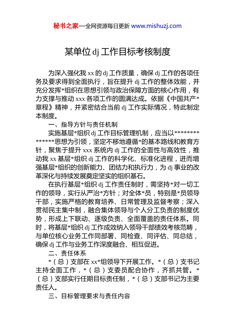 秘书之家—全网资源每日更新 www.mishuzj.com某单位 dj 工作目标考核制度为深入强化我 xx 的 dj 工作质量,确保 dj 工作的各项任务及要求得到全面执行,旨在提升 dj 工作的整体效能,并充分发挥*组织在思想引领与政治保障方面的核心作用,有力支撑与推动 xxx 各项工作的圆满达成。依据《中国共产*章程》精神,并紧密结合当前 dj 工作实际情况,特此制定本制度。一、指导方针与责任机制实施基层*组织 dj 工作目标管理机制,应当以**************思想为引领,坚定不移地遵循*的基本路线和教育方针,聚焦于提升 xxx 系统内 dj 工作的全面性与高效性,推动我 xx 基层*组织 dj 工作的科学化、标准化进程,进而增强基层*组织的创新能力、团结力和执行力,为 dj 事业的改革深化与持续发展奠定坚实的组织基石。在执行基层*组织 dj 工作责任制时,需坚持*对一切工作的领导,实行从严治*方针;对全体*员,特别是*员领导干部,实施严格的教育培养、日常管理及监督考察;深入贯彻民主集中制,融合集体领导与个人分工负责的制度优势,形成上下联动、逐级负责、全面覆盖的责任体系。同时,将基层*组织 dj 工作成效纳入领导干部绩效考核范畴,与单位核心业务工作同部署、同检查、同评估、同总结,确保 dj 工作与业务工作深度融合、相互促进。二、责任体系*(总)支部在 xx*组领导下开展工作。*(总)支书记主持全面工作,*(总)支委员配合协作,齐抓共管。*(总)支部实行任期目标责任制,*(总)支部书记为主要责任人。三、目标管理要求与责任内容秘书之家—全网资源每日更新 www.mishuzj.com(一)*(总)支部目标管理要求与责任内容1.宣传和贯彻*的路线、方针政策,落实上级*组织和xx*组的决议。2.根据 xx*组的工作部署和要求,结合实际制定*(总)支部 dj 工作计划和措施,明确责任人,并组织实施。3.围绕本单位中心工作,创造性地开展*的工作,活动方式和内容有创新,具有吸引力。4.*(总)支部书记参与本单位工作的研究、讨论和决策,*政协调配合,支委会团结协作。团结*员和群众完成本单位的各项任务,研究、分析和解决新情况、新问题,管理等工作成绩显著。5.*(总)支委会定期分析、研究*员思想状况,有针对性地制定和实施*员教育计划。创新*员教育内容和形式,*员教育活动针对性强,效果好。6.尊重*员的民主权利,定期召开*员大会,报告工作,*员在各项工作中发挥先锋模范作用。7.组织所在支部的*员认真学习,宣传、执行*中央和上级*组织的决议,充分发挥*支部的战斗堡垒作用和*员的先锋模范作用,积极协助 xx*组分管领导完成本部门担负的任务。8.加强对*员的教育管理,严格执行“三会一课”制度。9.加强*风廉政建设,抓好*风 dj 教育,监督*员严格遵守廉洁自律的各项规定,自觉抵制不良倾向和各种消极腐败现象。10.及时接转组织关系。按时足额交纳*费。加强对流动*员的管理。(二)坚持各项*内制度11.学习制度。每月至少组织一次*员学习活动,在学习中要发扬理论联系实际的学风,改进工作方法,提高工作效率。12.“三会一课”制度。*小组会每月召开一次;*支部委秘书之家—全网资源每日更新 www.mishuzj.com员会每月召开一次;支部*员大会每季度召开一次;*课教育每季度进行一次,必要时可随时安排。13.民主生活会制度。xx 领导班子民主生活会每年召开一次以交流思想,开展批评与自我批评为主要内容,要注重实效。14.*员组织生活会制度。*支部根据形势、任务和*员的思想工作实际,组织全体*员进行学习,交流思想,开展批评与自我批评,统一认识,增强*性和组织观念。*支部组织生活会一般每季度或半年召开一次(*员领导干部要以普通*员身份参加民主生活会),必要时可随时召开。15.民主评议*员制度。*支部每年进行一次民主评议*员工作。根据*员的标准和义务,全面地检查和评价每个*员在本职岗位和工作实践中发挥先锋模范作用的情况,表彰优秀*员,按照规定程序妥善处置不合格*员。16.工作汇报与报告制度。*支部委员会每季度向*总支汇报一次工作,向支部*员大会报告一次工作。*员每年要以书面或口头的形式向支部汇报一次思想、学习和工作的...