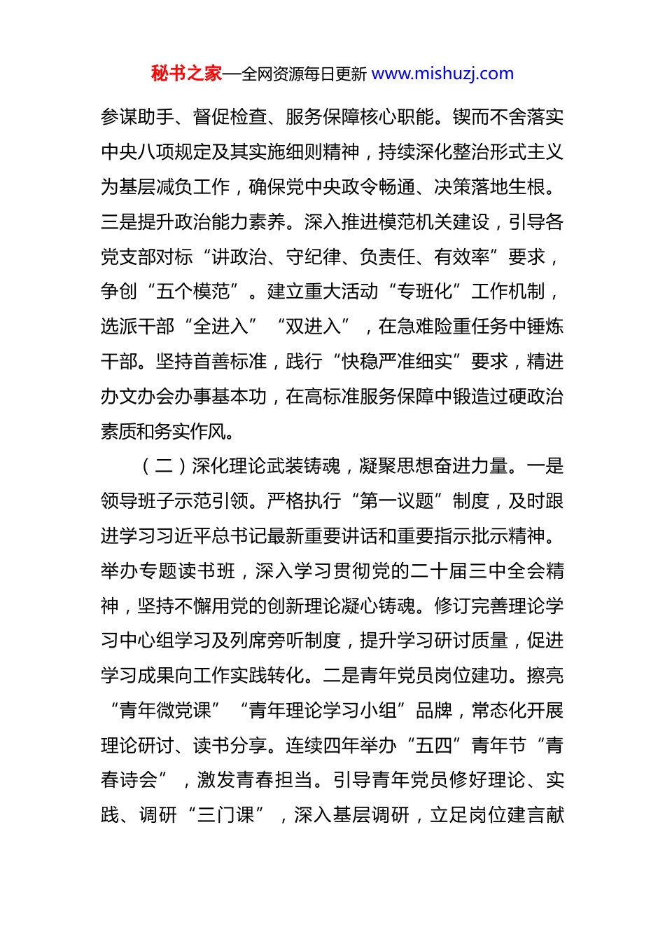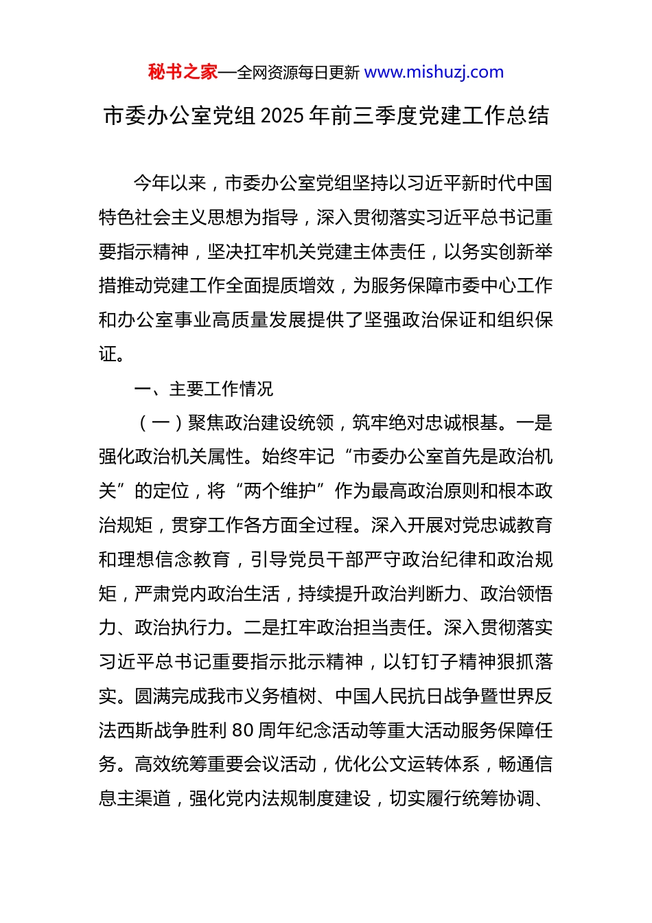 秘书之家—全网资源每日更新 www.mishuzj.com市委办公室党组 2025 年前三季度党建工作总结 今年以来,市委办公室党组坚持以习近平新时代中国特色社会主义思想为指导,深入贯彻落实习近平总书记重要指示精神,坚决扛牢机关党建主体责任,以务实创新举措推动党建工作全面提质增效,为服务保障市委中心工作和办公室事业高质量发展提供了坚强政治保证和组织保证。一、主要工作情况(一)聚焦政治建设统领,筑牢绝对忠诚根基。一是强化政治机关属性。始终牢记“市委办公室首先是政治机关”的定位,将“两个维护”作为最高政治原则和根本政治规矩,贯穿工作各方面全过程。深入开展对党忠诚教育和理想信念教育,引导党员干部严守政治纪律和政治规矩,严肃党内政治生活,持续提升政治判断力、政治领悟力、政治执行力。二是扛牢政治担当责任。深入贯彻落实习近平总书记重要指示批示精神,以钉钉子精神狠抓落实。圆满完成我市义务植树、中国人民抗日战争暨世界反法西斯战争胜利 80 周年纪念活动等重大活动服务保障任务。高效统筹重要会议活动,优化公文运转体系,畅通信息主渠道,强化党内法规制度建设,切实履行统筹协调、秘书之家—全网资源每日更新 www.mishuzj.com参谋助手、督促检查、服务保障核心职能。锲而不舍落实中央八项规定及其实施细则精神,持续深化整治形式主义为基层减负工作,确保党中央政令畅通、决策落地生根。三是提升政治能力素养。深入推进模范机关建设,引导各党支部对标“讲政治、守纪律、负责任、有效率”要求,争创“五个模范”。建立重大活动“专班化”工作机制,选派干部“全进入”“双进入”,在急难险重任务中锤炼干部。坚持首善标准,践行“快稳严准细实”要求,精进办文办会办事基本功,在高标准服务保障中锻造过硬政治素质和务实作风。(二)深化理论武装铸魂,凝聚思想奋进力量。一是领导班子示范引领。严格执行“第一议题”制度,及时跟进学习习近平总书记最新重要讲话和重要指示批示精神。举办专题读书班,深入学习贯彻党的二十届三中全会精神,坚持不懈用党的创新理论凝心铸魂。修订完善理论学习中心组学习及列席旁听制度,提升学习研讨质量,促进学习成果向工作实践转化。二是青年党员岗位建功。擦亮“青年微党课”“青年理论学习小组”品牌,常态化开展理论研讨、读书分享。连续四年举办“五四”青年节“青春诗会”,激发青春担当。引导青年党员修好理论、实践、调研“三门课”,深入基层调研,立足岗位建言献秘书之家—全网资源每日更新 www.mishuzj.com策,50 余名青年党员在“我为改革献一策”、青年技能大赛中展现风采,多篇提案获奖;1 名党员作为青年榜样代表参加市直机关主题宣讲。三是全员深学赋能增效。围绕中国式现代化和高质量发展主题,举办市委办公室“大讲堂”25 讲。召开全市党委和政府办公室主任会议,举办市区两级党委办公系统年轻干部专题培训班,组织“文秘课堂”培训交流,搭建互学互鉴平台。依托我市资源优势,组织党员赴链博会、科博会、抗战纪念馆等开展现场教学,拓宽视野,深化认识。(三)夯实组织建设基础,锻造坚强战斗堡垒。一是压实党建责任链条。牢牢抓住责任制“牛鼻子”,制定完善室领导班子、机关党委、党支部三级抓党建工作责任清单。优化机关党委、机关纪委会议制度和议事规则,明确两委委员联系支部分工,形成齐抓共管合力。从严开展党建检查考核及党支部书记述职评议考核,强化结果运用。二是建强“四强”支部堡垒。持续推进党支部标准化规范化建设,每年制定《党支部建设任务清单》。严肃党内政治生活,严格落实“三会一课”、组织生活会、民主评议党员、谈心谈话等制度,规范指导基层党组织按期换届。深入实施机关党支部建设质量提升三年行动计划,推动党建业务深度融合,鼓励支部联学共建,总结推广党建创新秘书之家—全网资源每日更新 www.mishuzj.com案例。发挥榜样引领作用,1 名同志获市三八红旗奖章,2名同志和 1 个党支部获市直机关“两优一先”表彰。三是抓实党员教育管理。落实新一轮党员教育培训规划,加强党员“全链条”培养。举办党务干部培训班,提升专业能力。发挥机关团委、读...