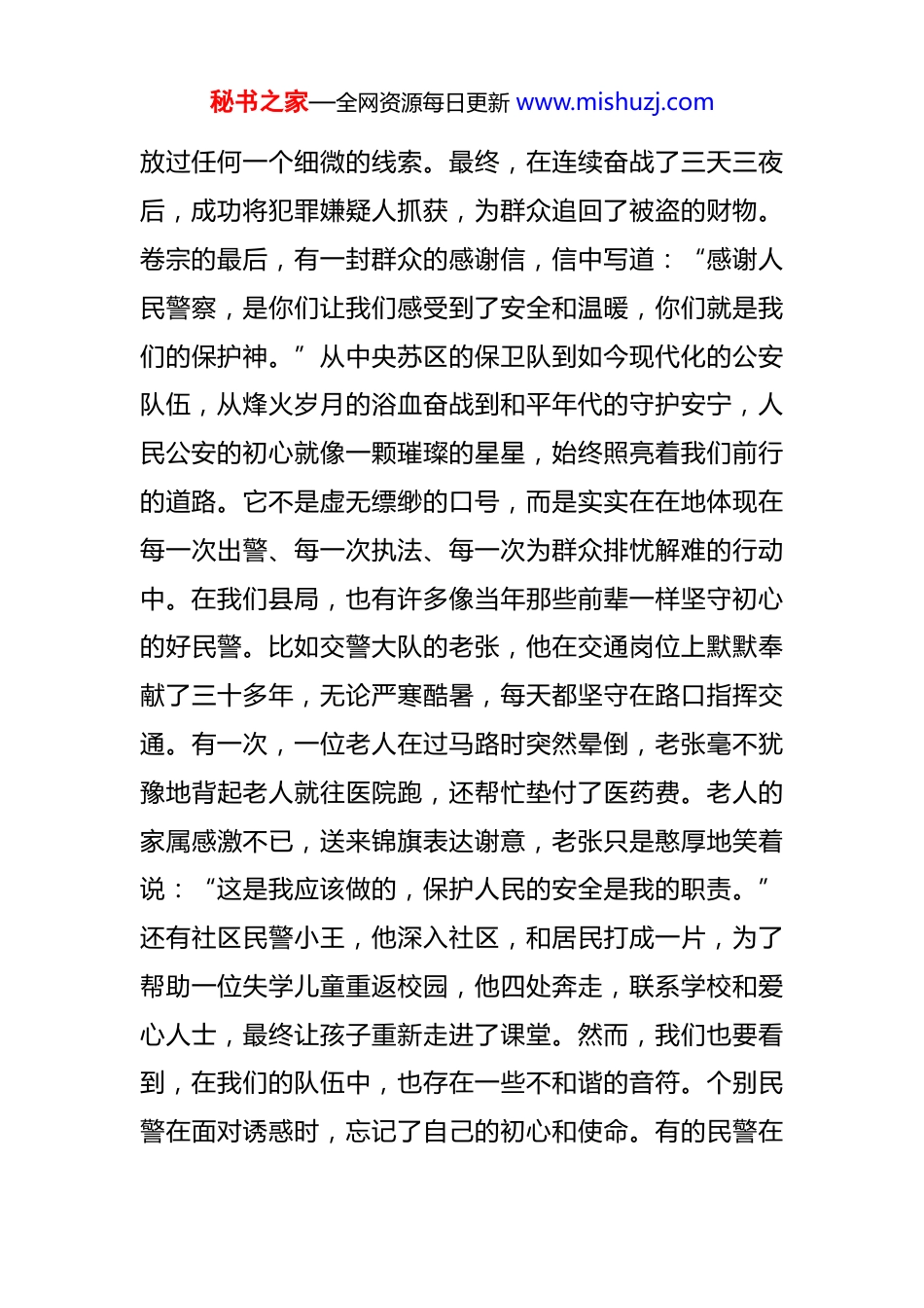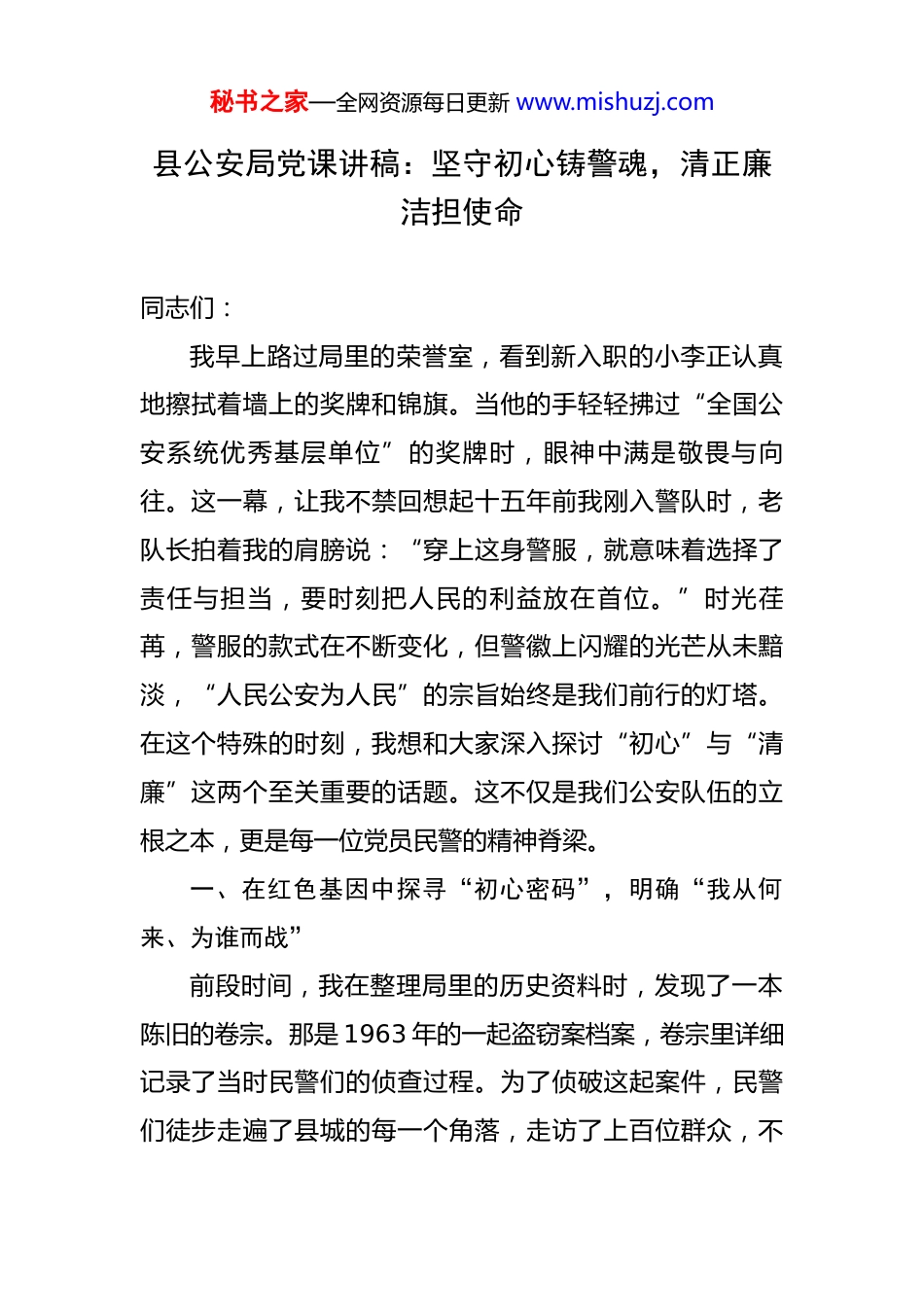 秘书之家—全网资源每日更新 www.mishuzj.com县公安局党课讲稿:坚守初心铸警魂,清正廉洁担使命 同志们:我早上路过局里的荣誉室,看到新入职的小李正认真地擦拭着墙上的奖牌和锦旗。当他的手轻轻拂过“全国公安系统优秀基层单位”的奖牌时,眼神中满是敬畏与向往。这一幕,让我不禁回想起十五年前我刚入警队时,老队长拍着我的肩膀说:“穿上这身警服,就意味着选择了责任与担当,要时刻把人民的利益放在首位。”时光荏苒,警服的款式在不断变化,但警徽上闪耀的光芒从未黯淡,“人民公安为人民”的宗旨始终是我们前行的灯塔。在这个特殊的时刻,我想和大家深入探讨“初心”与“清廉”这两个至关重要的话题。这不仅是我们公安队伍的立根之本,更是每一位党员民警的精神脊梁。一、在红色基因中探寻“初心密码”,明确“我从何来、为谁而战”前段时间,我在整理局里的历史资料时,发现了一本陈旧的卷宗。那是 1963 年的一起盗窃案档案,卷宗里详细记录了当时民警们的侦查过程。为了侦破这起案件,民警们徒步走遍了县城的每一个角落,走访了上百位群众,不秘书之家—全网资源每日更新 www.mishuzj.com放过任何一个细微的线索。最终,在连续奋战了三天三夜后,成功将犯罪嫌疑人抓获,为群众追回了被盗的财物。卷宗的最后,有一封群众的感谢信,信中写道:“感谢人民警察,是你们让我们感受到了安全和温暖,你们就是我们的保护神。”从中央苏区的保卫队到如今现代化的公安队伍,从烽火岁月的浴血奋战到和平年代的守护安宁,人民公安的初心就像一颗璀璨的星星,始终照亮着我们前行的道路。它不是虚无缥缈的口号,而是实实在在地体现在每一次出警、每一次执法、每一次为群众排忧解难的行动中。在我们县局,也有许多像当年那些前辈一样坚守初心的好民警。比如交警大队的老张,他在交通岗位上默默奉献了三十多年,无论严寒酷暑,每天都坚守在路口指挥交通。有一次,一位老人在过马路时突然晕倒,老张毫不犹豫地背起老人就往医院跑,还帮忙垫付了医药费。老人的家属感激不已,送来锦旗表达谢意,老张只是憨厚地笑着说:“这是我应该做的,保护人民的安全是我的职责。”还有社区民警小王,他深入社区,和居民打成一片,为了帮助一位失学儿童重返校园,他四处奔走,联系学校和爱心人士,最终让孩子重新走进了课堂。然而,我们也要看到,在我们的队伍中,也存在一些不和谐的音符。个别民警在面对诱惑时,忘记了自己的初心和使命。有的民警在秘书之家—全网资源每日更新 www.mishuzj.com执法过程中收受当事人的礼品礼金,有的民警对待群众态度冷漠、敷衍塞责。这些行为不仅损害了公安队伍的形象,也伤害了人民群众的感情。同志们,我们要时刻牢记,我们的权力是人民赋予的,我们的职责是为人民服务。我们要像先辈们一样,把人民的利益放在首位,用实际行动诠释“人民公安为人民”的深刻内涵。二、于日常履职中淬炼“忠诚本色”,践行“如何作为、怎样做好”公安工作,是维护社会稳定、保障人民安全的重要防线。我们每天都要面对各种各样的挑战和困难,这就要求我们必须具备坚定的忠诚品质和过硬的业务能力。一是是我们要始终保持对党和人民的绝对忠诚。这种忠诚,不是挂在嘴上的口号,而是要体现在实际行动中。我们要坚决贯彻党的路线方针政策,严格遵守法律法规,做到有法必依、执法必严、违法必究。在面对重大突发事件和复杂情况时,要挺身而出,敢于担当,坚决维护社会稳定和人民安全。二是我们要不断提高自己的业务能力和综合素质。随着时代的发展和社会的进步,公安工作面临着越来越多的新情况、新问题。我们要加强学习,不断更新知识结构,提高自己的侦查破案能力、应急处置能力和群众工作能力。要注重实践锻炼,在实际工作中积累经验,提高自秘书之家—全网资源每日更新 www.mishuzj.com己的解决问题的能力。三是我们还要注重团队协作。公安工作是一个系统工程,需要各个部门、各个岗位的密切配合。我们要树立大局意识,加强沟通协作,形成工作合力。在面对重大案件和任务时,要相互支持、相互配合,共同完成工作任务。然而,在实际工作中,我们也存在一些不足之处。有的民警业务...