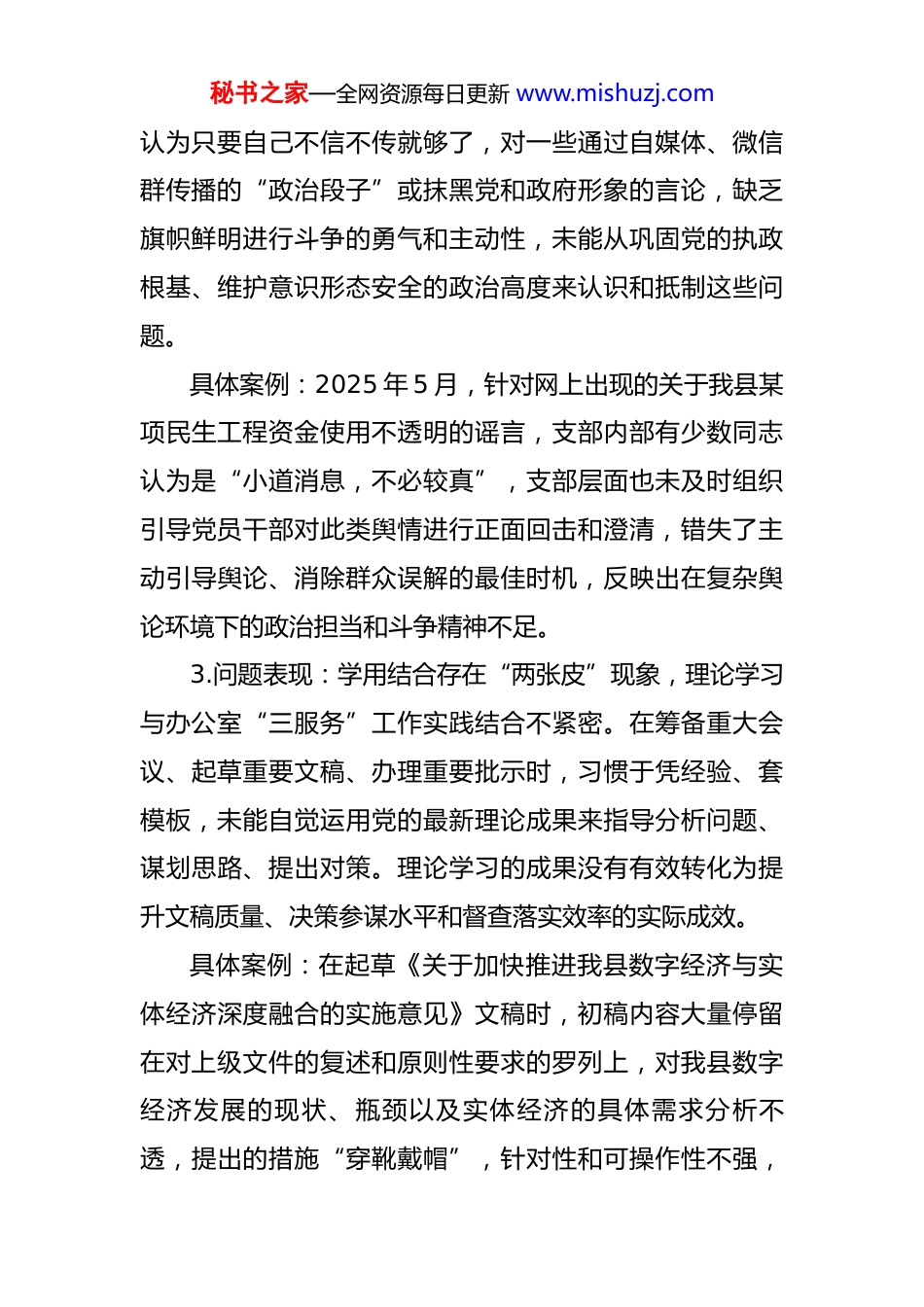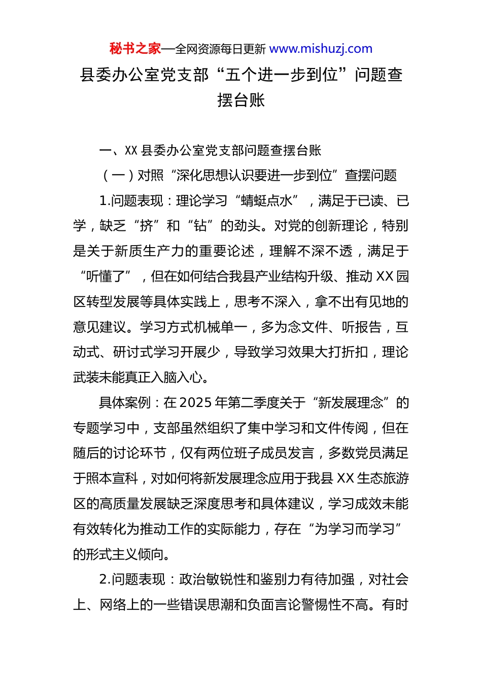 秘书之家—全网资源每日更新 www.mishuzj.com县委办公室党支部“五个进一步到位”问题查摆台账 一、XX 县委办公室党支部问题查摆台账(一)对照“深化思想认识要进一步到位”查摆问题1.问题表现:理论学习“蜻蜓点水”,满足于已读、已学,缺乏“挤”和“钻”的劲头。对党的创新理论,特别是关于新质生产力的重要论述,理解不深不透,满足于“听懂了”,但在如何结合我县产业结构升级、推动 XX 园区转型发展等具体实践上,思考不深入,拿不出有见地的意见建议。学习方式机械单一,多为念文件、听报告,互动式、研讨式学习开展少,导致学习效果大打折扣,理论武装未能真正入脑入心。具体案例:在 2025 年第二季度关于“新发展理念”的专题学习中,支部虽然组织了集中学习和文件传阅,但在随后的讨论环节,仅有两位班子成员发言,多数党员满足于照本宣科,对如何将新发展理念应用于我县 XX 生态旅游区的高质量发展缺乏深度思考和具体建议,学习成效未能有效转化为推动工作的实际能力,存在“为学习而学习”的形式主义倾向。2.问题表现:政治敏锐性和鉴别力有待加强,对社会上、网络上的一些错误思潮和负面言论警惕性不高。有时秘书之家—全网资源每日更新 www.mishuzj.com认为只要自己不信不传就够了,对一些通过自媒体、微信群传播的“政治段子”或抹黑党和政府形象的言论,缺乏旗帜鲜明进行斗争的勇气和主动性,未能从巩固党的执政根基、维护意识形态安全的政治高度来认识和抵制这些问题。具体案例:2025 年 5 月,针对网上出现的关于我县某项民生工程资金使用不透明的谣言,支部内部有少数同志认为是“小道消息,不必较真”,支部层面也未及时组织引导党员干部对此类舆情进行正面回击和澄清,错失了主动引导舆论、消除群众误解的最佳时机,反映出在复杂舆论环境下的政治担当和斗争精神不足。3.问题表现:学用结合存在“两张皮”现象,理论学习与办公室“三服务”工作实践结合不紧密。在筹备重大会议、起草重要文稿、办理重要批示时,习惯于凭经验、套模板,未能自觉运用党的最新理论成果来指导分析问题、谋划思路、提出对策。理论学习的成果没有有效转化为提升文稿质量、决策参谋水平和督查落实效率的实际成效。具体案例:在起草《关于加快推进我县数字经济与实体经济深度融合的实施意见》文稿时,初稿内容大量停留在对上级文件的复述和原则性要求的罗列上,对我县数字经济发展的现状、瓶颈以及实体经济的具体需求分析不透,提出的措施“穿靴戴帽”,针对性和可操作性不强,秘书之家—全网资源每日更新 www.mishuzj.com这表明支部在推动党员干部将理论学习成果转化为具体政策建议的能力上还有欠缺。(二)对照“加强党性修养要进一步到位”查摆问题1.问题表现:党内政治生活存在“庸俗化”倾向,批评与自我批评辣味不足。在组织生活会上,自我批评多是谈工作问题,轻描淡写思想问题;相互批评多是提希望、“友情提醒”,缺少“红脸出汗”的交锋。有的同志抱着“多栽花、少栽刺”的“老好人”思想,不愿得罪人,导致党内政治生活的政治性、时代性、原则性、战斗性有所弱化。具体案例:在 2024 年度组织生活会上,某位同志在自我剖析时,仅提到自己“有时加班加点不够,需要提高工作效率”,而对其存在的“遇到棘手问题绕着走”的担当精神问题避而不谈。其他同志在对其进行批评时,也多以“希望今后加强学习”“注意劳逸结合”等笼统意见为主,没有一针见血地指出其问题根源,使得组织生活会锤炼党性的作用打了折扣。2.问题表现:理想信念教育的渗透力不强,未能完全内化为党员干部的精神追求和行动自觉。虽然经常组织学习和教育活动,但形式较为单一,对党员干部思想深处的困惑和现实中的“活思想”把握不准。个别党员在面对繁重的工作任务和复杂的社会环境时,偶尔会产生迷茫和懈怠秘书之家—全网资源每日更新 www.mishuzj.com情绪,精神“缺钙”的问题没有从根本上解决。具体案例:支部组织的“重温入党誓词”活动,流程规范但情感触动不足,有的党员同志仅仅是机械地跟读誓词,未能真正结合自身成长经历和工作实际,反思入党初心和党员使命。活动后的交流发言...