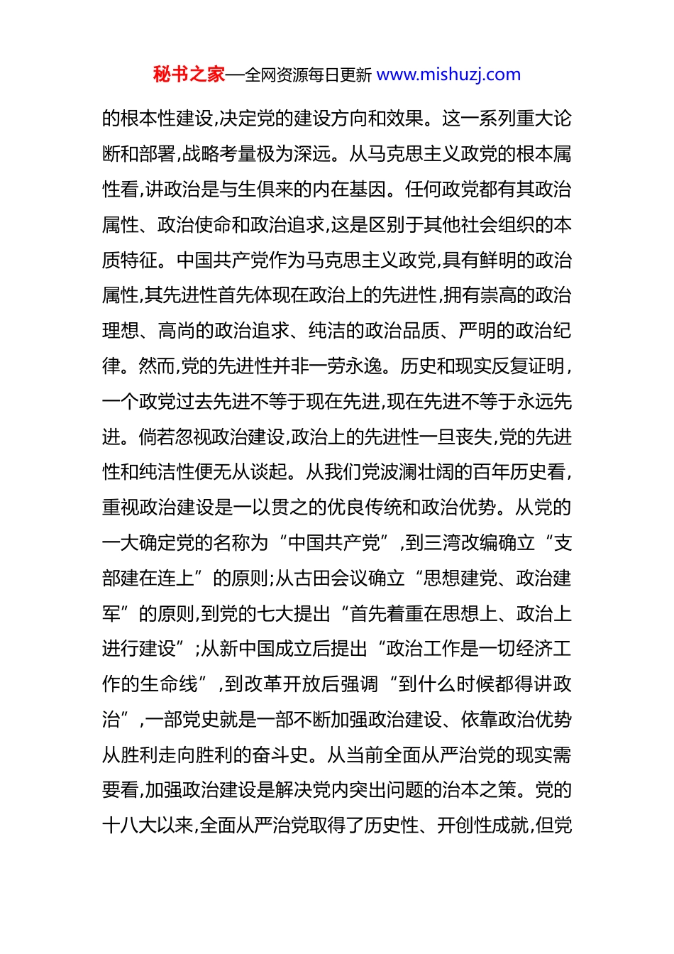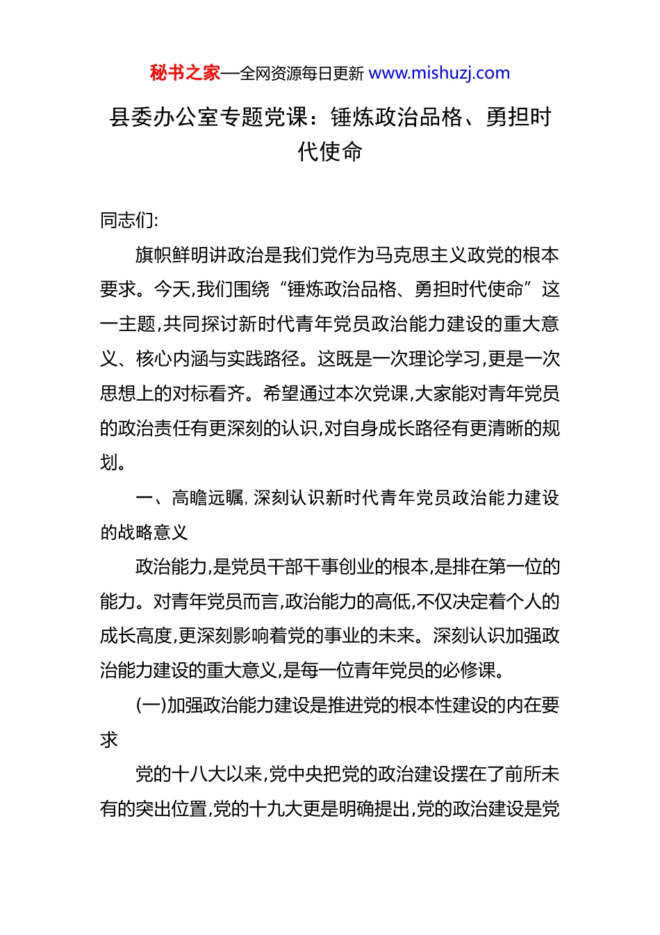 秘书之家—全网资源每日更新 www.mishuzj.com县委办公室专题党课:锤炼政治品格、勇担时代使命 同志们:旗帜鲜明讲政治是我们党作为马克思主义政党的根本要求。今天,我们围绕“锤炼政治品格、勇担时代使命”这一主题,共同探讨新时代青年党员政治能力建设的重大意义、核心内涵与实践路径。这既是一次理论学习,更是一次思想上的对标看齐。希望通过本次党课,大家能对青年党员的政治责任有更深刻的认识,对自身成长路径有更清晰的规划。一、高瞻远瞩,深刻认识新时代青年党员政治能力建设的战略意义政治能力,是党员干部干事创业的根本,是排在第一位的能力。对青年党员而言,政治能力的高低,不仅决定着个人的成长高度,更深刻影响着党的事业的未来。深刻认识加强政治能力建设的重大意义,是每一位青年党员的必修课。(一)加强政治能力建设是推进党的根本性建设的内在要求党的十八大以来,党中央把党的政治建设摆在了前所未有的突出位置,党的十九大更是明确提出,党的政治建设是党秘书之家—全网资源每日更新 www.mishuzj.com的根本性建设,决定党的建设方向和效果。这一系列重大论断和部署,战略考量极为深远。从马克思主义政党的根本属性看,讲政治是与生俱来的内在基因。任何政党都有其政治属性、政治使命和政治追求,这是区别于其他社会组织的本质特征。中国共产党作为马克思主义政党,具有鲜明的政治属性,其先进性首先体现在政治上的先进性,拥有崇高的政治理想、高尚的政治追求、纯洁的政治品质、严明的政治纪律。然而,党的先进性并非一劳永逸。历史和现实反复证明,一个政党过去先进不等于现在先进,现在先进不等于永远先进。倘若忽视政治建设,政治上的先进性一旦丧失,党的先进性和纯洁性便无从谈起。从我们党波澜壮阔的百年历史看,重视政治建设是一以贯之的优良传统和政治优势。从党的一大确定党的名称为“中国共产党”,到三湾改编确立“支部建在连上”的原则;从古田会议确立“思想建党、政治建军”的原则,到党的七大提出“首先着重在思想上、政治上进行建设”;从新中国成立后提出“政治工作是一切经济工作的生命线”,到改革开放后强调“到什么时候都得讲政治”,一部党史就是一部不断加强政治建设、依靠政治优势从胜利走向胜利的奋斗史。从当前全面从严治党的现实需要看,加强政治建设是解决党内突出问题的治本之策。党的十八大以来,全面从严治党取得了历史性、开创性成就,但党秘书之家—全网资源每日更新 www.mishuzj.com内存在的思想不纯、政治不纯、组织不纯、作风不纯等问题尚未得到根本解决。一些党员干部政治意识淡化、政治纪律松弛、政治责任缺失的问题依然存在。这些问题归根结底都是政治问题,必须从政治上寻根溯源、标本兼治。只有把党的政治建设抓紧抓实,才能从根本上净化政治生态,永葆党的肌体健康。青年是党和国家的未来,青年党员是党的生力军和后备力量。截至 2024 年底,中国共产党党员总数已突破 1 亿名,其中 35 岁及以下的青年党员占比接近23%。这一庞大的青年群体,其政治面貌和政治能力,直接关系到党的政治建设的整体成效。因此,加强青年党员的政治能力建设,使其政治上更加成熟、坚定,就是为党的长期执政和国家长治久安筑牢坚实的“青年根基”,是确保党的事业薪火相传、后继有人的战略工程。(二)加强政治能力建设是应对复杂风险挑战的迫切需要当前,世界百年未有之大变局正加速演进,我国发展进入战略机遇和风险挑战并存、不确定难预料因素增多的时期。习近平总书记深刻指出,我们面临的各种斗争将是长期的,并将伴随实现第二个百年奋斗目标全过程。前进道路上,凡是危害中国共产党领导和我国社会主义制度,危害我国主权、安全、发展利益,危害我国核心利益和重大原则,危害我国人民根本利益,危害我国实现中华民族伟大复兴的各种风秘书之家—全网资源每日更新 www.mishuzj.com险挑战,都必须进行坚决斗争,而且必须取得斗争胜利。于我们*县而言,同样处在滚石上山、爬坡过坎的关键阶段。近年来,在县委的坚强领导下,全县上下团结一心,巩固拓展了脱贫攻坚成果,全面推进乡村振兴,经济社会发展取得了显著成就。但同时,我们也必须清醒地看到面临的挑战。从经济层面看,县域综合实力仍需增...