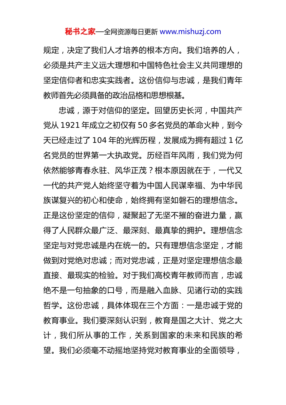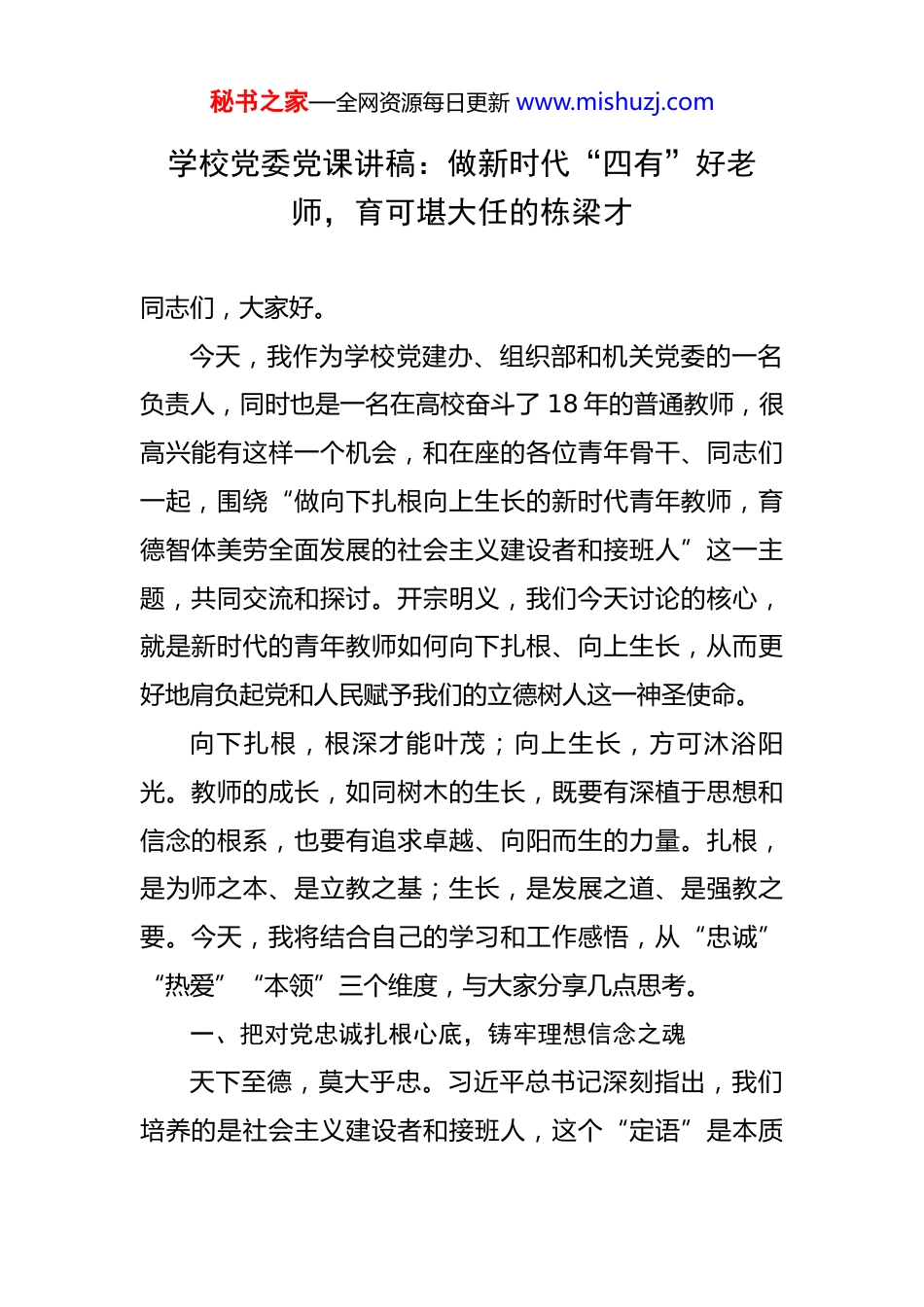 秘书之家—全网资源每日更新 www.mishuzj.com学校党委党课讲稿:做新时代“四有”好老师,育可堪大任的栋梁才 同志们,大家好。今天,我作为学校党建办、组织部和机关党委的一名负责人,同时也是一名在高校奋斗了 18 年的普通教师,很高兴能有这样一个机会,和在座的各位青年骨干、同志们一起,围绕“做向下扎根向上生长的新时代青年教师,育德智体美劳全面发展的社会主义建设者和接班人”这一主题,共同交流和探讨。开宗明义,我们今天讨论的核心,就是新时代的青年教师如何向下扎根、向上生长,从而更好地肩负起党和人民赋予我们的立德树人这一神圣使命。向下扎根,根深才能叶茂;向上生长,方可沐浴阳光。教师的成长,如同树木的生长,既要有深植于思想和信念的根系,也要有追求卓越、向阳而生的力量。扎根,是为师之本、是立教之基;生长,是发展之道、是强教之要。今天,我将结合自己的学习和工作感悟,从“忠诚”“热爱”“本领”三个维度,与大家分享几点思考。一、把对党忠诚扎根心底,铸牢理想信念之魂天下至德,莫大乎忠。习近平总书记深刻指出,我们培养的是社会主义建设者和接班人,这个“定语”是本质秘书之家—全网资源每日更新 www.mishuzj.com规定,决定了我们人才培养的根本方向。我们培养的人,必须是共产主义远大理想和中国特色社会主义共同理想的坚定信仰者和忠实实践者。这份信仰与忠诚,是我们青年教师首先必须具备的政治品格和思想根基。忠诚,源于对信仰的坚定。回望历史长河,中国共产党从 1921 年成立之初仅有 50 多名党员的革命火种,到今天已经走过了 104 年的光辉历程,发展成为拥有超过 1 亿名党员的世界第一大执政党。历经百年风雨,我们党为何依然能够青春永驻、风华正茂?根本原因就在于,一代又一代的共产党人始终坚守着为中国人民谋幸福、为中华民族谋复兴的初心和使命,始终拥有坚如磐石的理想信念。正是这份坚定的信仰,凝聚起了无坚不摧的奋进力量,赢得了人民群众最广泛、最深刻、最真挚的拥护。理想信念坚定与对党忠诚是内在统一的。只有理想信念坚定,才能做到对党绝对忠诚;而对党忠诚,正是对坚定理想信念最直接、最现实的检验。对于我们高校青年教师而言,忠诚绝不是一句抽象的口号,而是融入血脉、见诸行动的实践哲学。这份忠诚,具体体现在三个方面:一是忠诚于党的教育事业。我们要深刻认识到,教育是国之大计、党之大计,我们所从事的工作,关系到国家的未来和民族的希望。我们必须毫不动摇地坚持党对教育事业的全面领导,秘书之家—全网资源每日更新 www.mishuzj.com全面贯彻党的教育方针,确保我们的教书育人工作始终沿着正确的政治方向前进。根据 2025 年最新发布的《中国共产党普通高等学校基层组织工作条例》等一系列指导文件,坚持和加强党对高校的全面领导是办好中国特色社会主义大学的根本保证。我们*大学之所以能够在人才培养、科学研究和社会服务等领域取得一系列瞩目成就,最根本的保障就是始终坚持党的领导。近年来,我校党委全面落实管党治党、办学治校主体责任,涌现出了一批“全国党建工作标杆院系”“全国党建工作样板支部”,这些荣誉的背后,是我校全体师生党员对党忠诚的生动体现。二是忠诚于立德树人为根本任务。教师的天职是育人。我们的忠诚,要体现在把立德树人作为我们一切工作的出发点和落脚点。我们不仅要传授知识,更要塑造灵魂。在每一堂课、每一次交流中,我们都要自觉承担起“为学、为事、为人”示范的责任,引导学生树立正确的世界观、人生观、价值观,帮助他们“扣好人生的第一粒扣子”。我们要努力培养出那些对党和人民忠诚可靠、堪当民族复兴重任的时代新人,这既是我们自身的使命,也是我们对党忠诚的最好诠释。三是忠诚于为党育人、为国育才的初心使命。作为青年教师,我们既是教育者,也是受教育者。我们既要努力把自己锻造成对党和人民忠诚可靠、可堪大用秘书之家—全网资源每日更新 www.mishuzj.com的栋梁之材,也要把培养同样忠诚可靠的接班人作为我们的奋斗目标。这意味着,我们的课堂不能仅仅是知识的传递场,更应该是信仰的播种地。我们要理直气壮地讲好思政课,更...