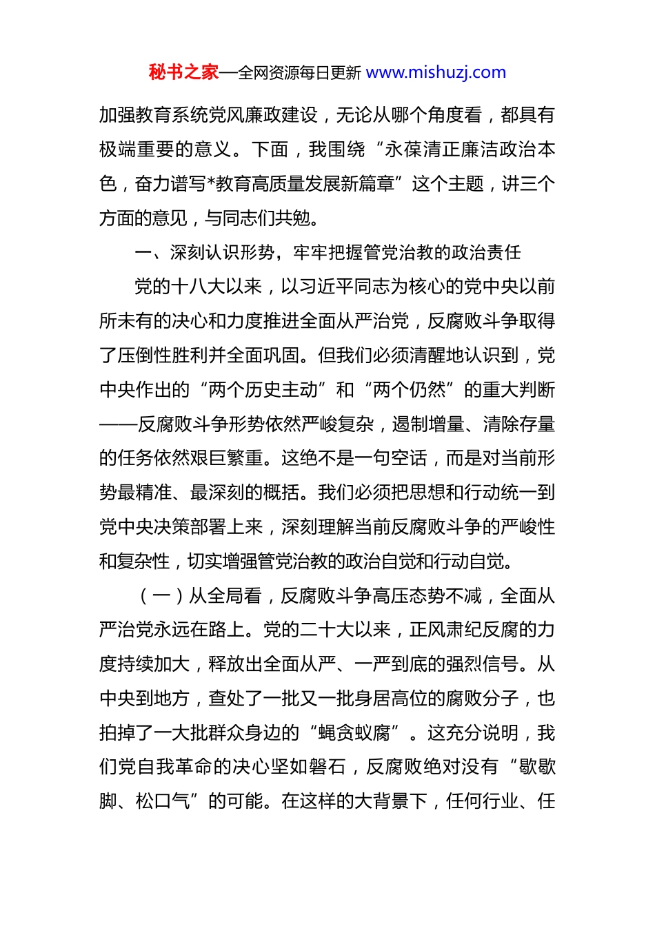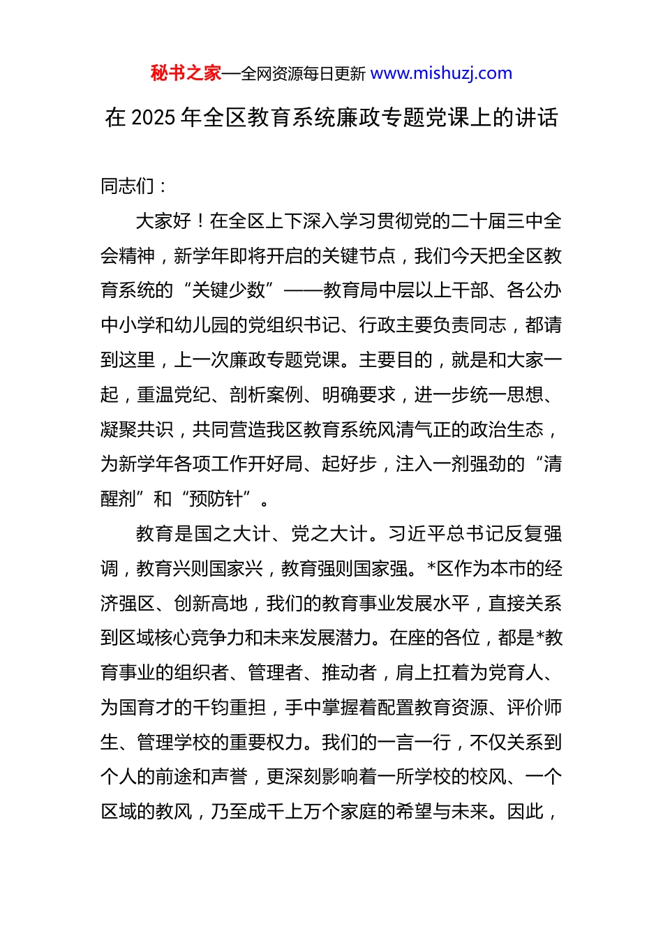 秘书之家—全网资源每日更新 www.mishuzj.com在 2025 年全区教育系统廉政专题党课上的讲话 同志们:大家好!在全区上下深入学习贯彻党的二十届三中全会精神,新学年即将开启的关键节点,我们今天把全区教育系统的“关键少数”——教育局中层以上干部、各公办中小学和幼儿园的党组织书记、行政主要负责同志,都请到这里,上一次廉政专题党课。主要目的,就是和大家一起,重温党纪、剖析案例、明确要求,进一步统一思想、凝聚共识,共同营造我区教育系统风清气正的政治生态,为新学年各项工作开好局、起好步,注入一剂强劲的“清醒剂”和“预防针”。教育是国之大计、党之大计。习近平总书记反复强调,教育兴则国家兴,教育强则国家强。*区作为本市的经济强区、创新高地,我们的教育事业发展水平,直接关系到区域核心竞争力和未来发展潜力。在座的各位,都是*教育事业的组织者、管理者、推动者,肩上扛着为党育人、为国育才的千钧重担,手中掌握着配置教育资源、评价师生、管理学校的重要权力。我们的一言一行,不仅关系到个人的前途和声誉,更深刻影响着一所学校的校风、一个区域的教风,乃至成千上万个家庭的希望与未来。因此,秘书之家—全网资源每日更新 www.mishuzj.com加强教育系统党风廉政建设,无论从哪个角度看,都具有极端重要的意义。下面,我围绕“永葆清正廉洁政治本色,奋力谱写*教育高质量发展新篇章”这个主题,讲三个方面的意见,与同志们共勉。一、深刻认识形势,牢牢把握管党治教的政治责任党的十八大以来,以习近平同志为核心的党中央以前所未有的决心和力度推进全面从严治党,反腐败斗争取得了压倒性胜利并全面巩固。但我们必须清醒地认识到,党中央作出的“两个历史主动”和“两个仍然”的重大判断——反腐败斗争形势依然严峻复杂,遏制增量、清除存量的任务依然艰巨繁重。这绝不是一句空话,而是对当前形势最精准、最深刻的概括。我们必须把思想和行动统一到党中央决策部署上来,深刻理解当前反腐败斗争的严峻性和复杂性,切实增强管党治教的政治自觉和行动自觉。(一)从全局看,反腐败斗争高压态势不减,全面从严治党永远在路上。党的二十大以来,正风肃纪反腐的力度持续加大,释放出全面从严、一严到底的强烈信号。从中央到地方,查处了一批又一批身居高位的腐败分子,也拍掉了一大批群众身边的“蝇贪蚁腐”。这充分说明,我们党自我革命的决心坚如磐石,反腐败绝对没有“歇歇脚、松口气”的可能。在这样的大背景下,任何行业、任秘书之家—全网资源每日更新 www.mishuzj.com何领域都不存在所谓的“特殊地带”和“法外之地”,教育系统更不是一方净土。认为教育领域都是清水衙门、都是知识分子,不会出大问题的想法,是极其天真和危险的。恰恰相反,正因为教育承载着人民群众最直接、最现实的期盼,教育领域的任何一点风吹草动,任何一起腐败案件,都更容易引发社会舆论的高度关注,其负面影响甚至会被成倍放大,严重损害党和政府的形象。(二)从我区看,教育系统廉政风险不容忽视,正风肃纪任务依然繁重。近年来,区委、区政府始终坚持教育优先发展战略,持续加大投入,我们区的教育硬件设施、师资力量、教学质量都走在了全市前列,这是我们引以为傲的成绩。但成绩背后,我们更要看到隐忧和风险。根据区纪委监委的统计数据,从 2022 年到 2024 年这三年间,我们共收到涉及教育系统的信访举报和问题线索 128 件,经初核立案 35 件,给予党纪政务处分 42 人,移送司法机关 5 人,涉及违纪违法资金高达 1100 余万元。这些数据触目惊心,每一个数字背后都是一次党性的沉沦、一个家庭的悲剧、一笔教育资源的流失。从案件分析来看,我区教育系统违纪违法问题主要呈现出几个特点:一是问题多发于重点领域和关键环节。案件主要集中在工程建设、设备采购、食堂管理、招生录取、职称评定、课后服务等权秘书之家—全网资源每日更新 www.mishuzj.com力集中、资金密集、资源富集的领域。这些领域往往制度不健全、监督不到位,容易成为腐败的“温床”。二是“关键少数”违纪违法问题突出。在被查处的 42 人中,担任学校党政“一把手”或中层正...