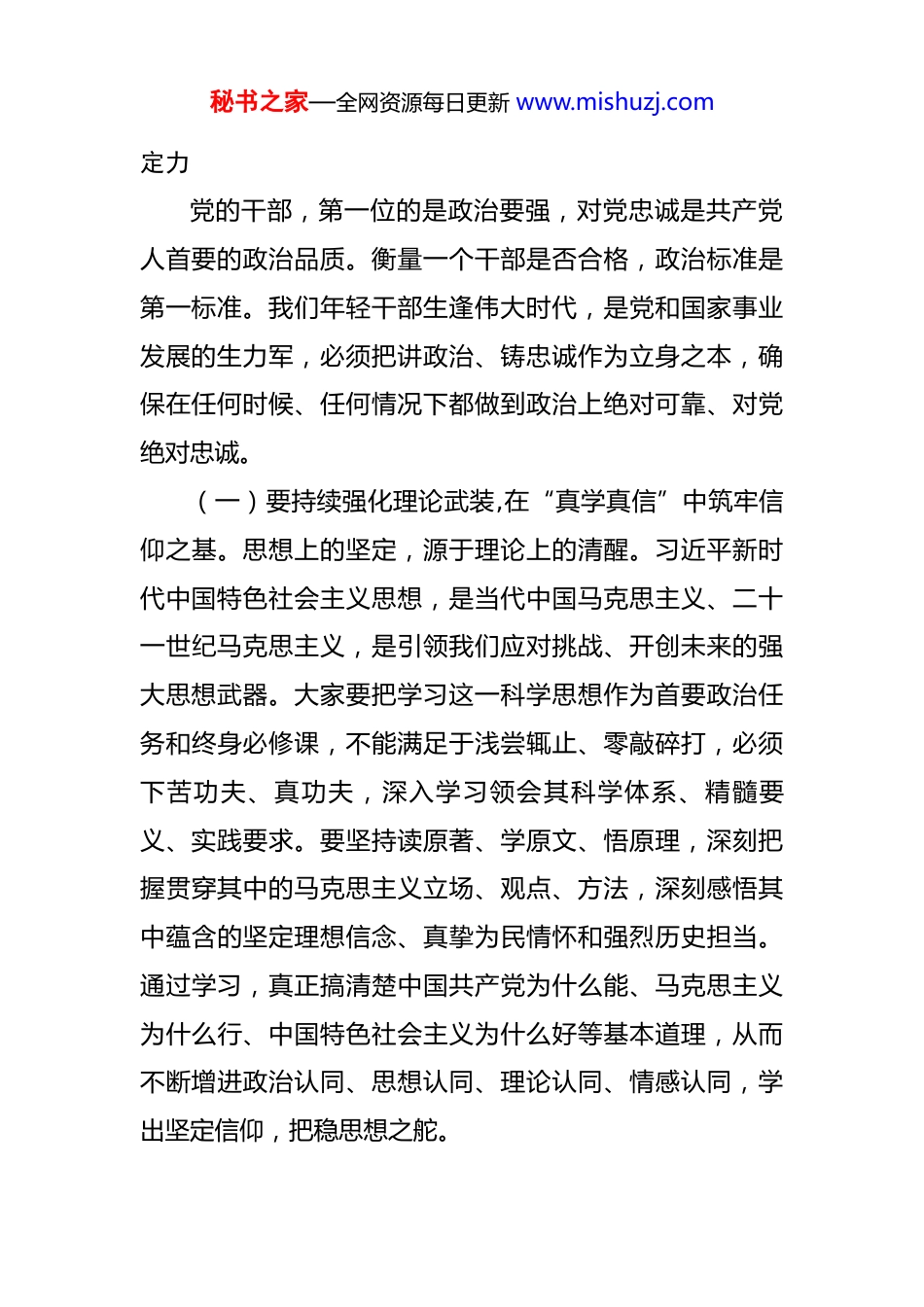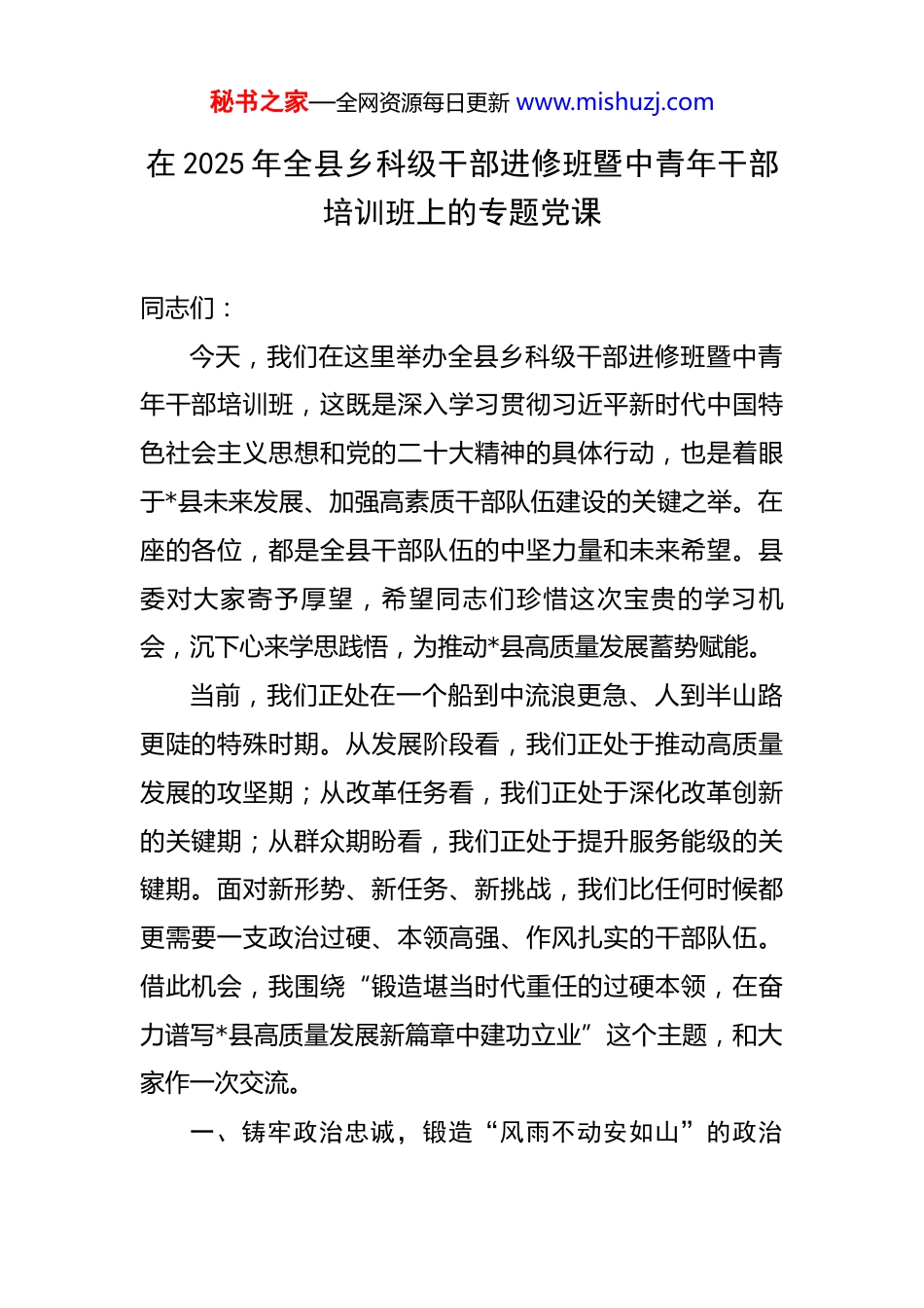 秘书之家—全网资源每日更新 www.mishuzj.com在 2025 年全县乡科级干部进修班暨中青年干部培训班上的专题党课 同志们:今天,我们在这里举办全县乡科级干部进修班暨中青年干部培训班,这既是深入学习贯彻习近平新时代中国特色社会主义思想和党的二十大精神的具体行动,也是着眼于*县未来发展、加强高素质干部队伍建设的关键之举。在座的各位,都是全县干部队伍的中坚力量和未来希望。县委对大家寄予厚望,希望同志们珍惜这次宝贵的学习机会,沉下心来学思践悟,为推动*县高质量发展蓄势赋能。当前,我们正处在一个船到中流浪更急、人到半山路更陡的特殊时期。从发展阶段看,我们正处于推动高质量发展的攻坚期;从改革任务看,我们正处于深化改革创新的关键期;从群众期盼看,我们正处于提升服务能级的关键期。面对新形势、新任务、新挑战,我们比任何时候都更需要一支政治过硬、本领高强、作风扎实的干部队伍。借此机会,我围绕“锻造堪当时代重任的过硬本领,在奋力谱写*县高质量发展新篇章中建功立业”这个主题,和大家作一次交流。一、铸牢政治忠诚,锻造“风雨不动安如山”的政治秘书之家—全网资源每日更新 www.mishuzj.com定力党的干部,第一位的是政治要强,对党忠诚是共产党人首要的政治品质。衡量一个干部是否合格,政治标准是第一标准。我们年轻干部生逢伟大时代,是党和国家事业发展的生力军,必须把讲政治、铸忠诚作为立身之本,确保在任何时候、任何情况下都做到政治上绝对可靠、对党绝对忠诚。(一)要持续强化理论武装,在“真学真信”中筑牢信仰之基。思想上的坚定,源于理论上的清醒。习近平新时代中国特色社会主义思想,是当代中国马克思主义、二十一世纪马克思主义,是引领我们应对挑战、开创未来的强大思想武器。大家要把学习这一科学思想作为首要政治任务和终身必修课,不能满足于浅尝辄止、零敲碎打,必须下苦功夫、真功夫,深入学习领会其科学体系、精髓要义、实践要求。要坚持读原著、学原文、悟原理,深刻把握贯穿其中的马克思主义立场、观点、方法,深刻感悟其中蕴含的坚定理想信念、真挚为民情怀和强烈历史担当。通过学习,真正搞清楚中国共产党为什么能、马克思主义为什么行、中国特色社会主义为什么好等基本道理,从而不断增进政治认同、思想认同、理论认同、情感认同,学出坚定信仰,把稳思想之舵。秘书之家—全网资源每日更新 www.mishuzj.com(二)要坚定拥护“两个确立”,在“对标对表”中践行绝对忠诚。“两个确立”是新时代取得一切成就最根本的保证。对党忠诚,最现实、最直接的体现就是坚定拥护“两个确立”、坚决做到“两个维护”。这绝不是一句空洞的口号,而是要体现在我们的一言一行、一举一动之中。大家要时时刻刻向党中央看齐,向习近平总书记看齐,向党的理论和路线方针政策看齐。党中央提倡的坚决响应,党中央决定的要坚决执行,党中央禁止的坚决不做。要养成在吃透党中央精神前提下开展工作的习惯,想问题、作决策、抓落实,都要自觉同党的基本理论、基本路线、基本方略对标对表,同党中央的决策部署对标对表,确保我们推进的每一项工作,都始终沿着正确政治方向前进,做到不偏向、不变通、不走样。(三)要不断提升政治能力,在“知行合一”中彰显政治担当。政治能力是党员干部的“看家本领”。我们讲的政治能力,不是空泛的,而是具体的,主要体现在“三力”上:一是政治判断力,就是要善于从纷繁复杂的矛盾中把握政治逻辑,透过现象看本质,在大是大非面前保持清醒头脑,在风浪考验面前立场坚定。二是政治领悟力,就是要对党中央精神深入学习、融会贯通,坚持用党中央精神分析形势、推动工作,始终同党中央保持高度一致。秘书之家—全网资源每日更新 www.mishuzj.com三是政治执行力,就是要闻令而动、听令而行,不折不扣地贯彻落实党中央决策部署,做到总书记有号令、党中央有部署、省市委有要求,*县见行动、见实效。作为党的干部,必须把对党忠诚融入血脉、见诸行动,以实际工作成效来检验我们的政治能力,以推动*发展的实绩来诠释我们的忠诚担当。二、强化担当作为,砥砺“敢教日月换新天”的担当锐气干部干部,干字当...